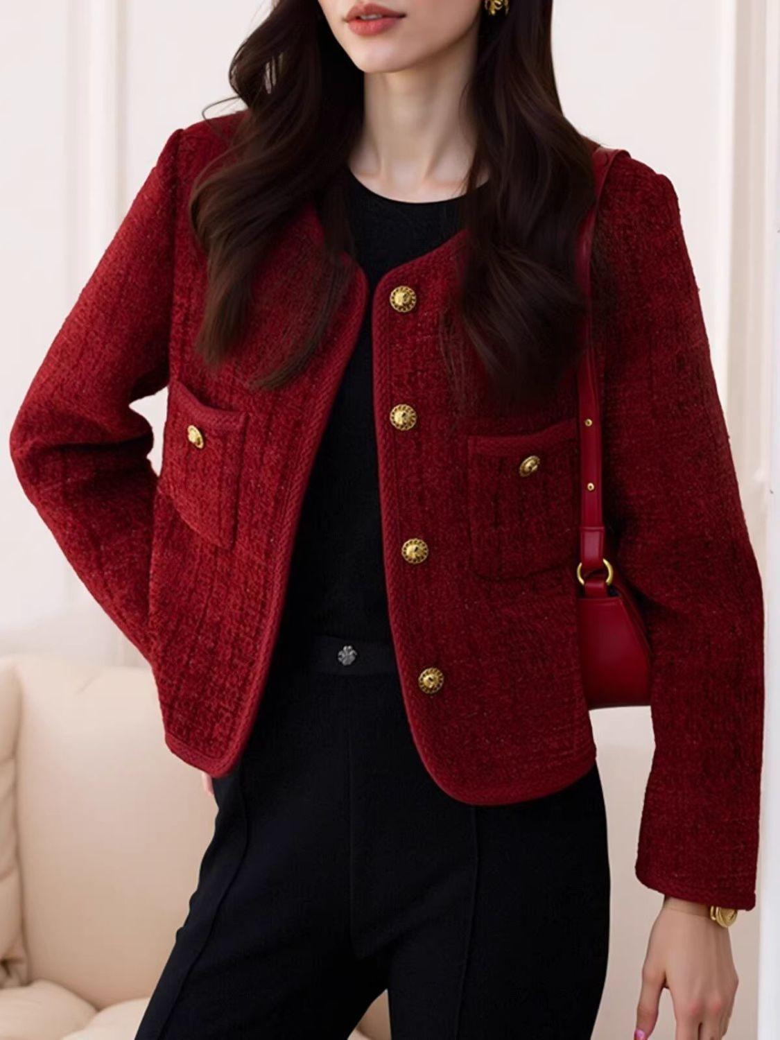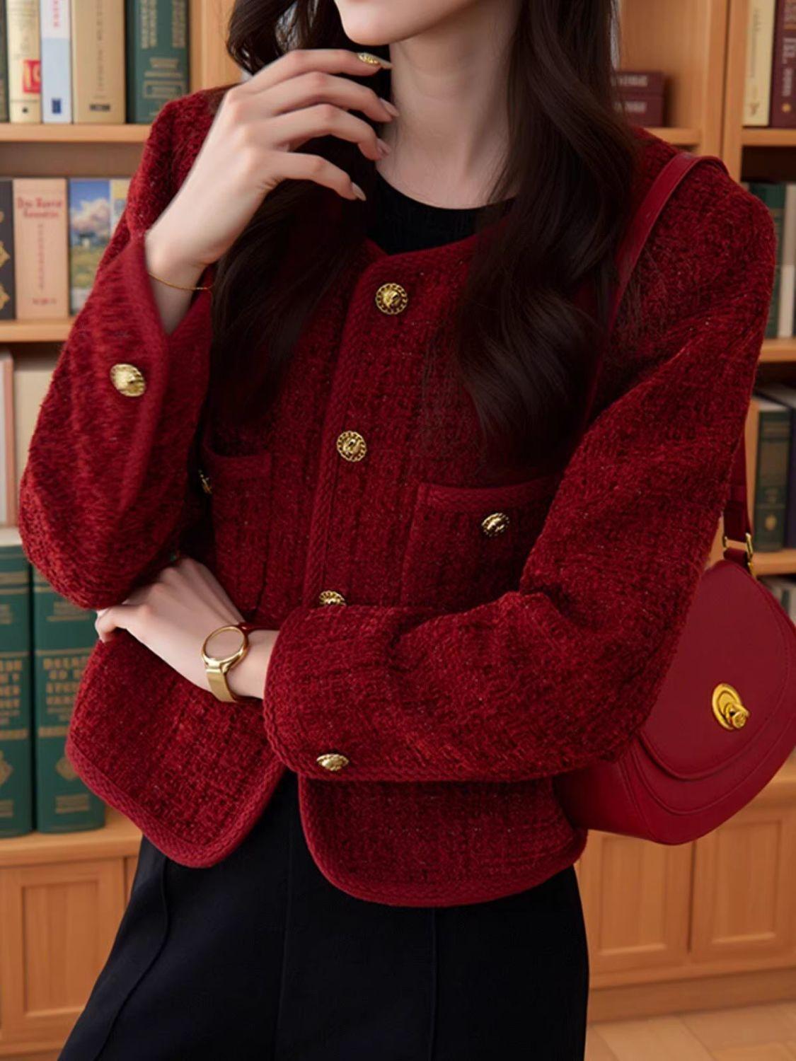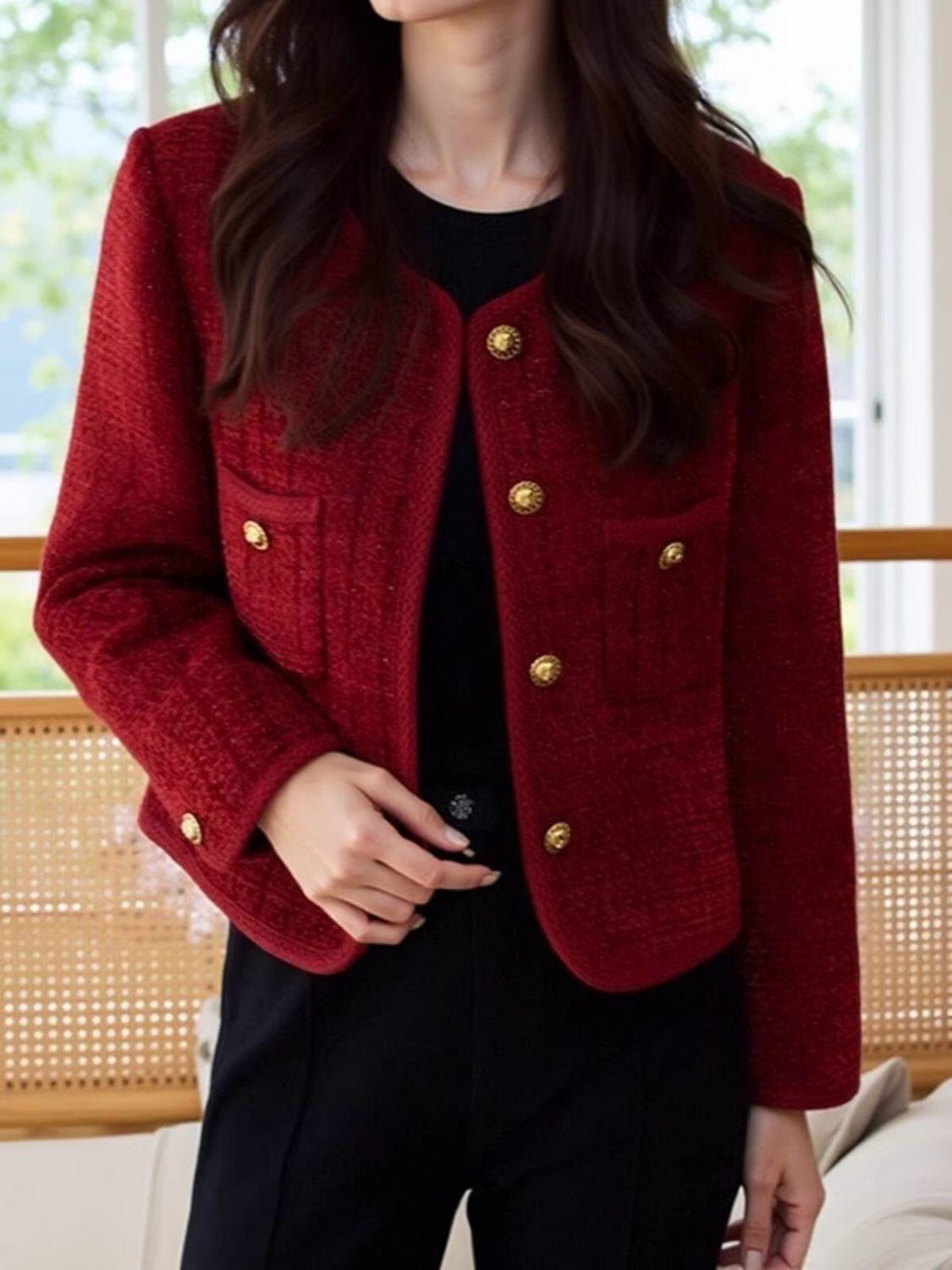 Chaqueta nueva roja estilo Chanel 2025 temperamento corto francés primavera y otoño tweed petit top de socialité