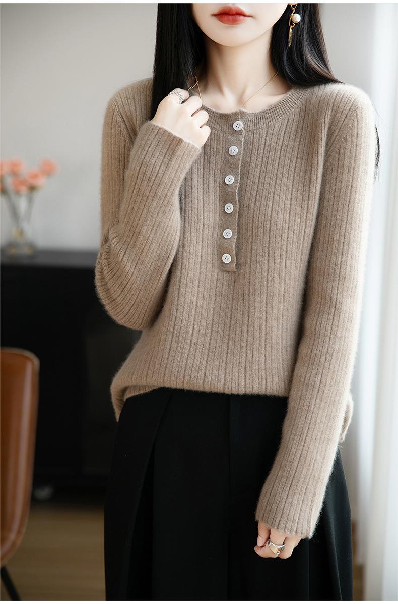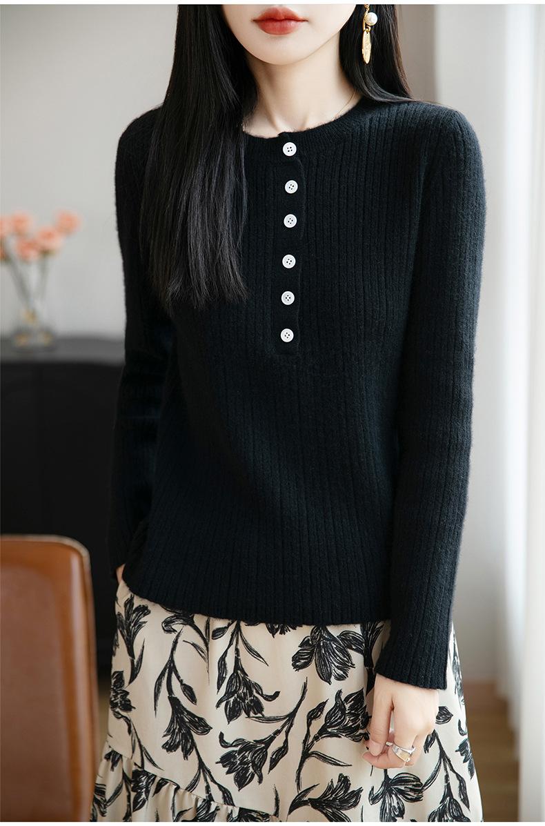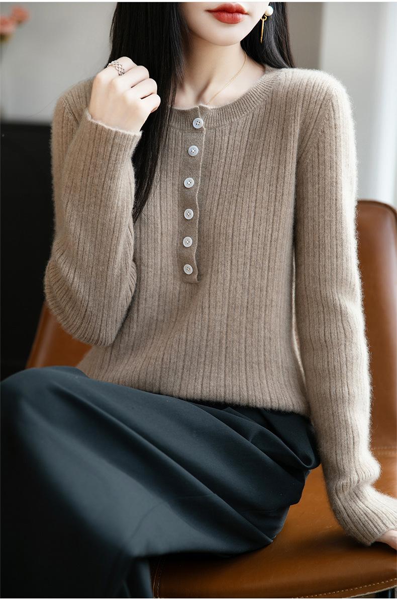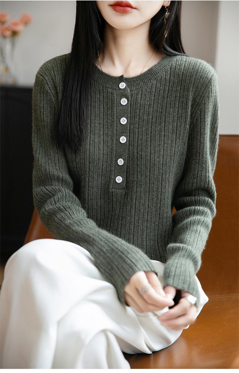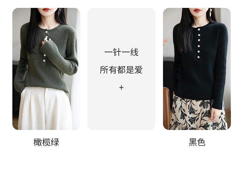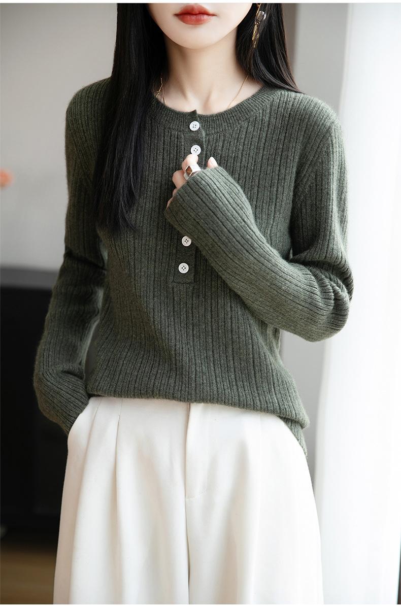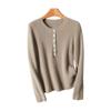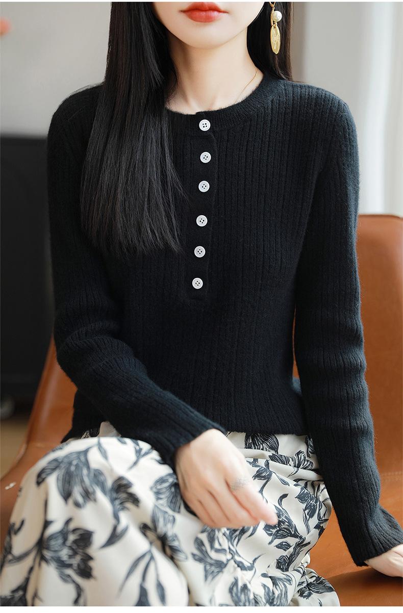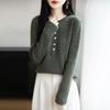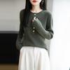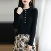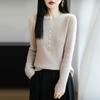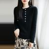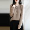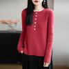 25 Otoño/Invierno Nuevo Cuello Redondo de Lana Pura Tejido Manga Larga para Mujer Color Sólido Botones Suelto Top Básico