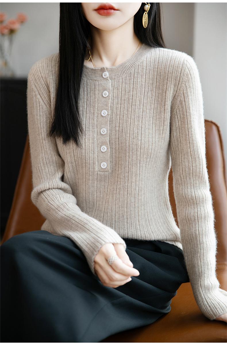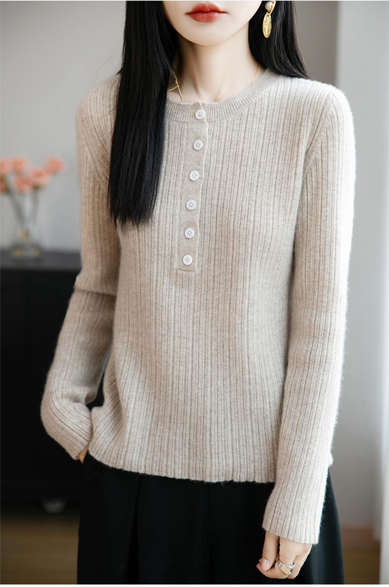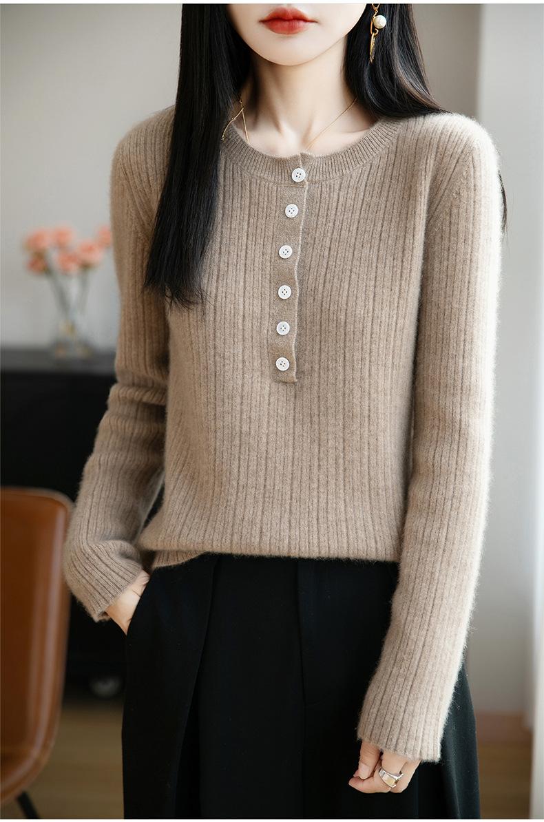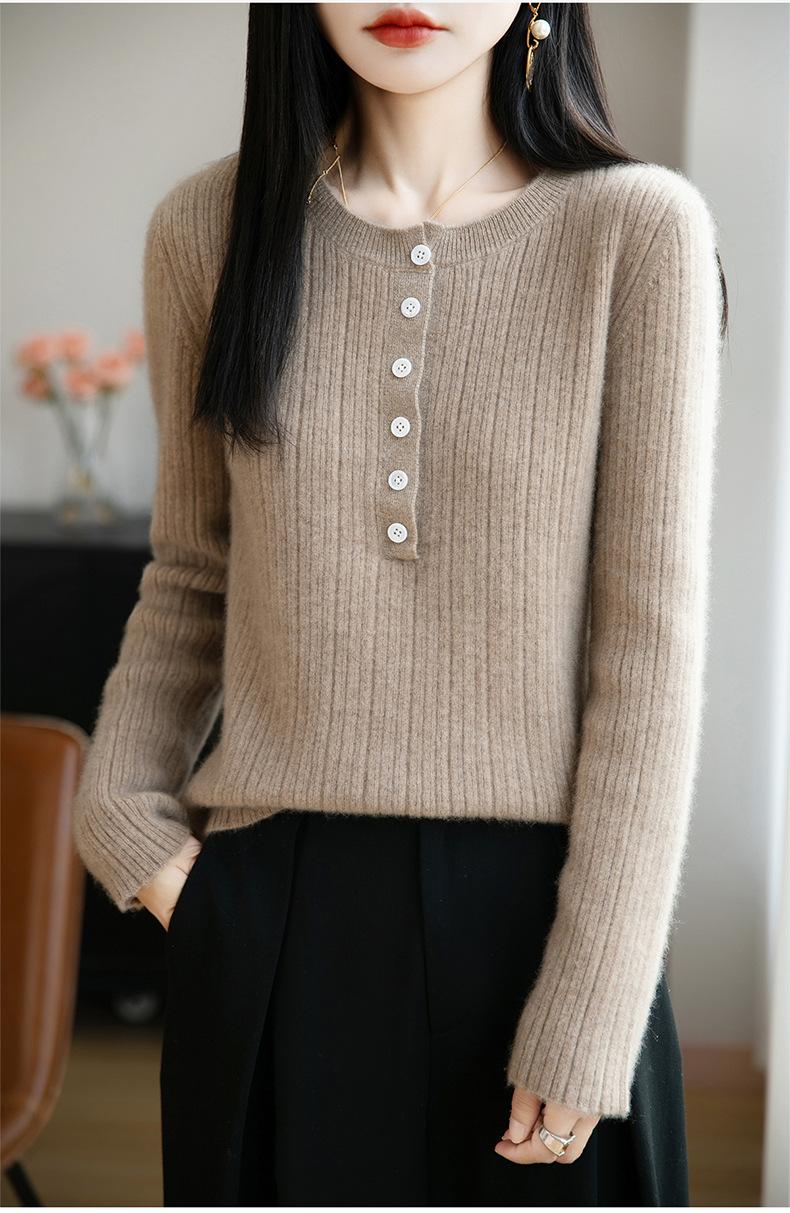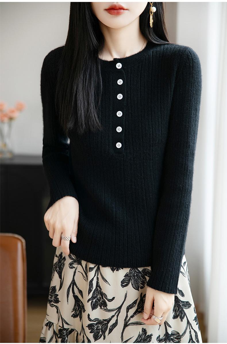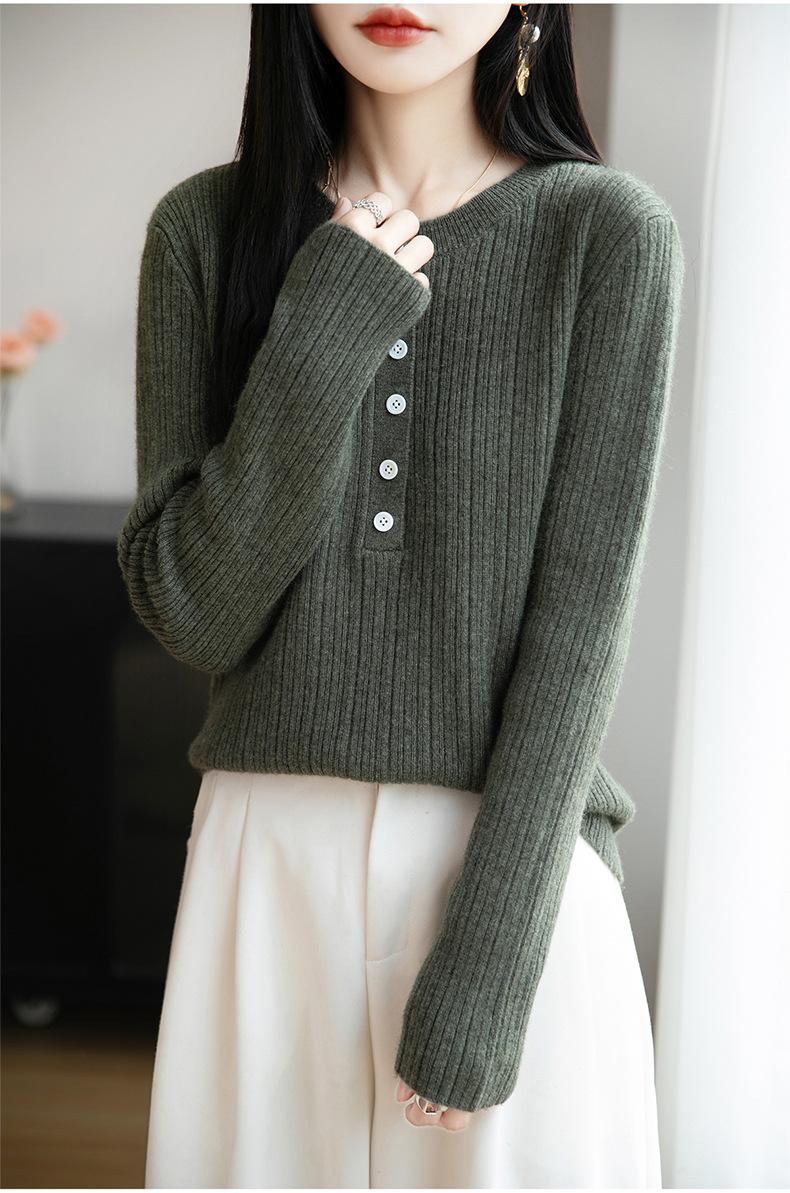 25 Otoño/Invierno Nuevo Cuello Redondo de Lana Pura Tejido Manga Larga para Mujer Color Sólido Botones Suelto Top Básico