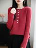 25 Años Otoño e Invierno Nuevo Lana Pura Cuello Redondo Medio Abierto Tejido de Punto Manga Larga Mujer Color Puro Botones Suelto Base Camisa Top