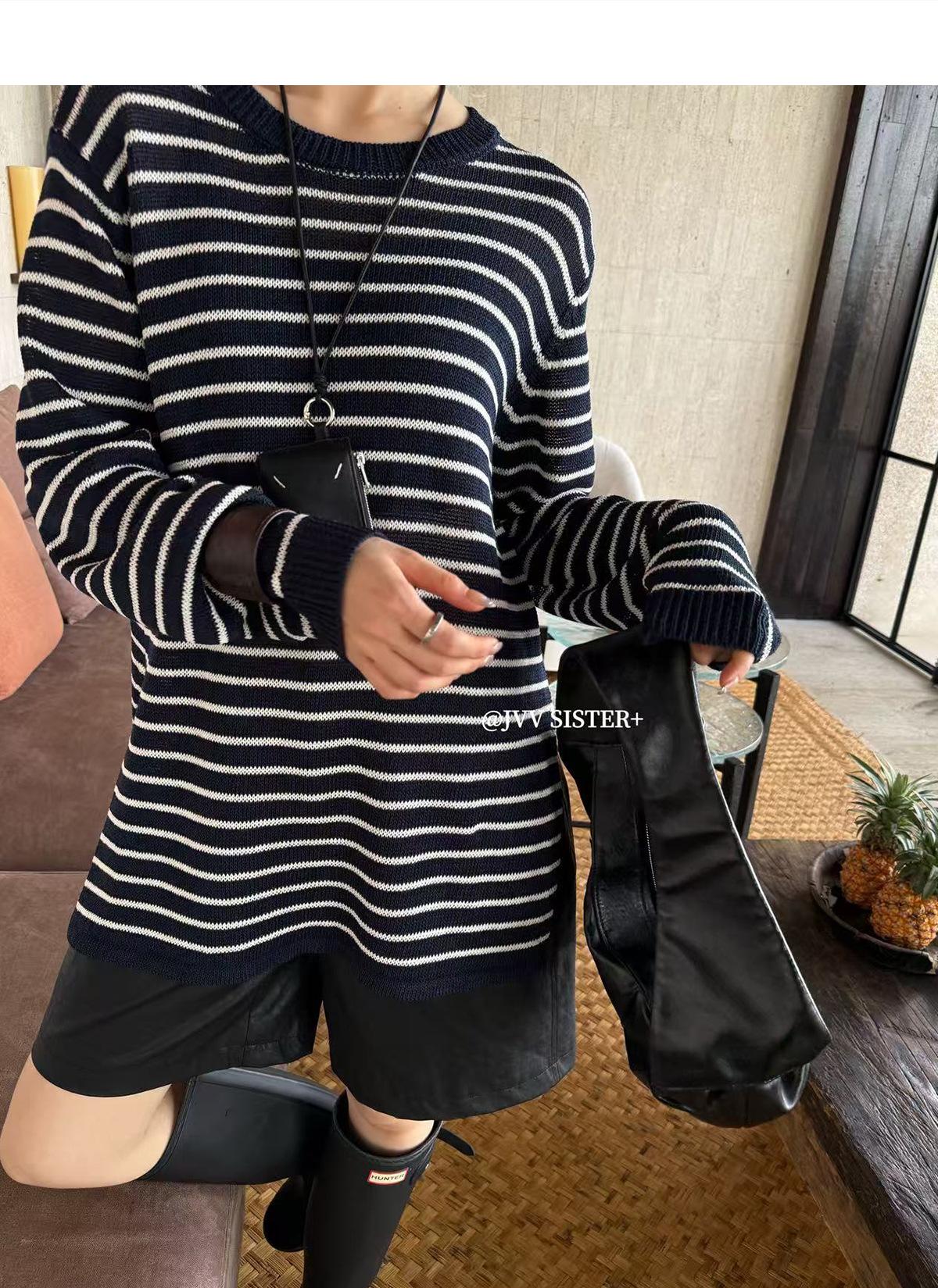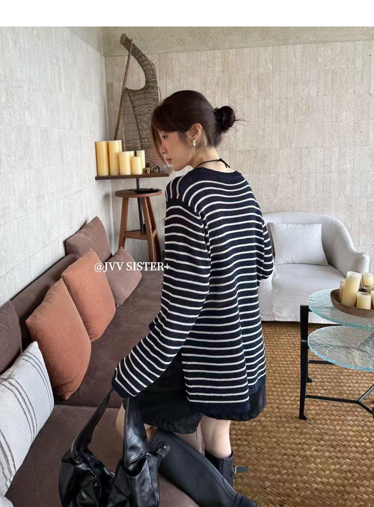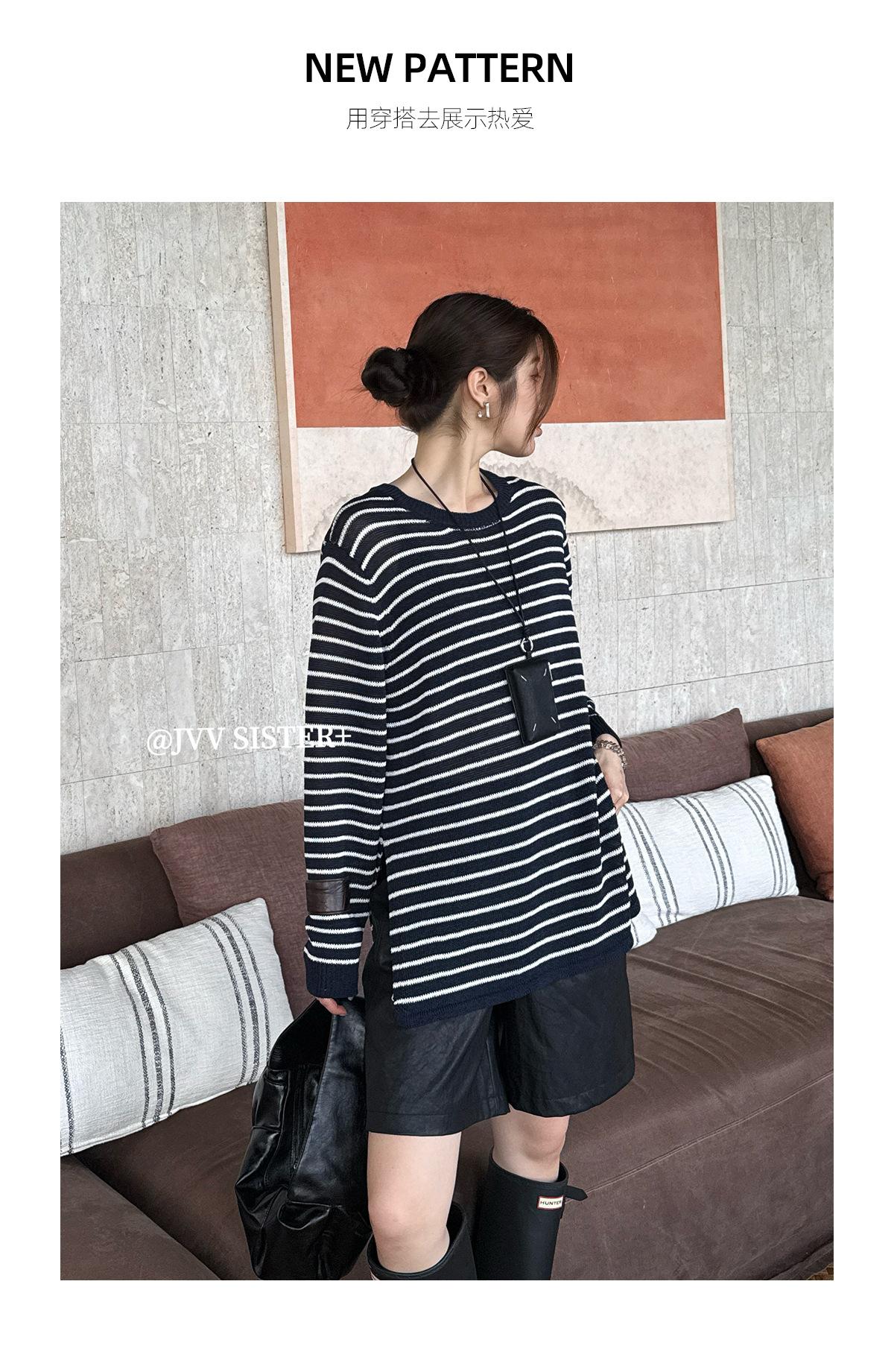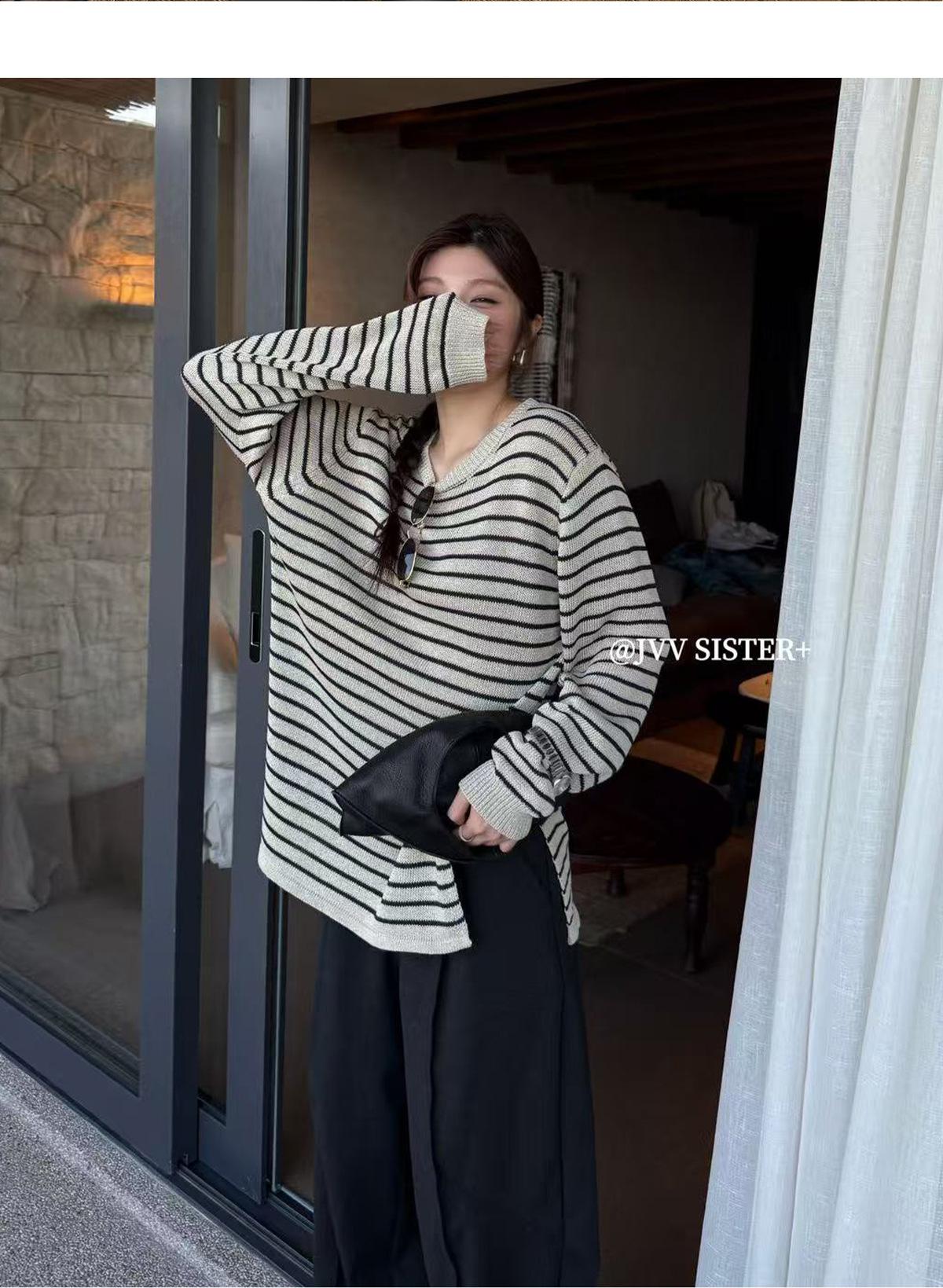 JVV Trece Líneas 2025 Otoño Nueva Moda Rayas Cuello Redondo Manga Larga Suéter Holgado de Punto Tendencia para Mujer 70885
