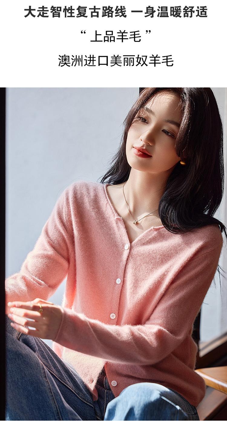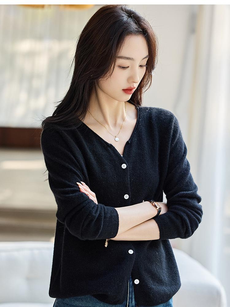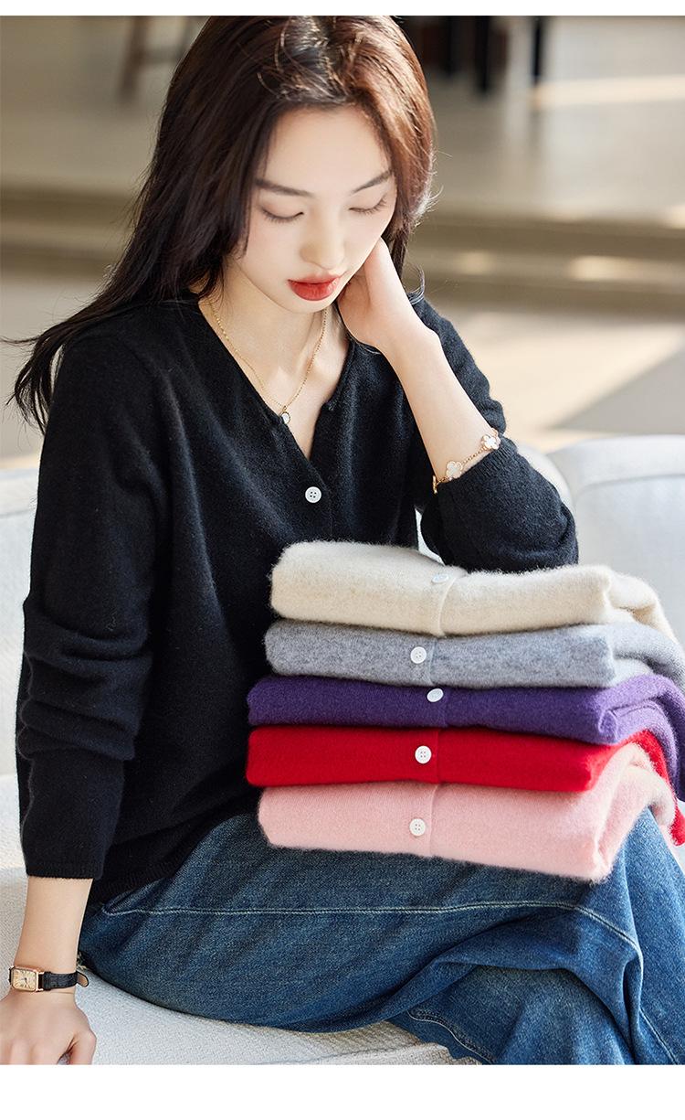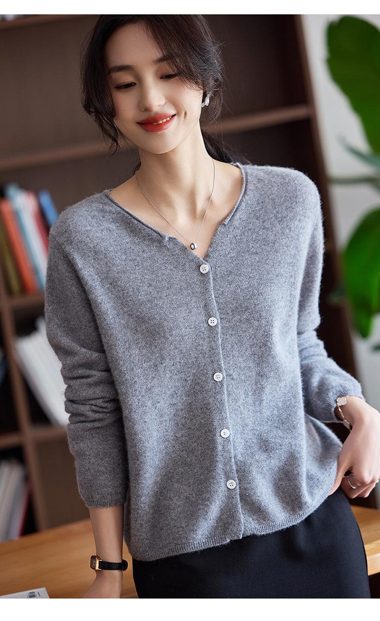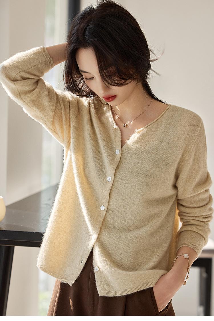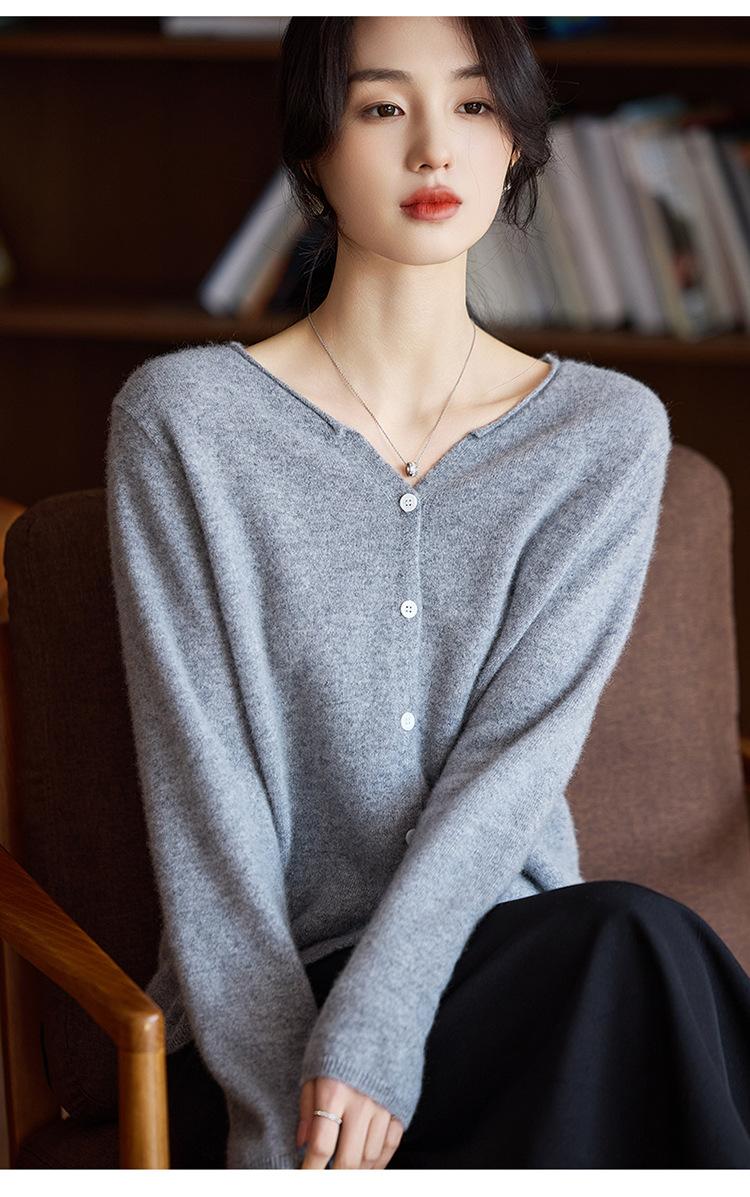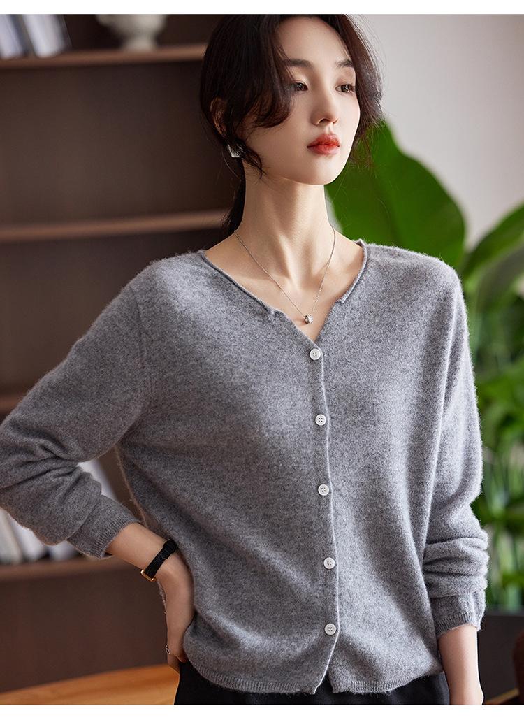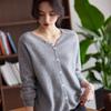 25 Otoño/Invierno Nuevo Cárdigan de Punto de Lana Pura con Cuello en V Manga Larga para Mujer Color Sólido Borde Enrollado Holgado Versátil Top Ropa Exterior