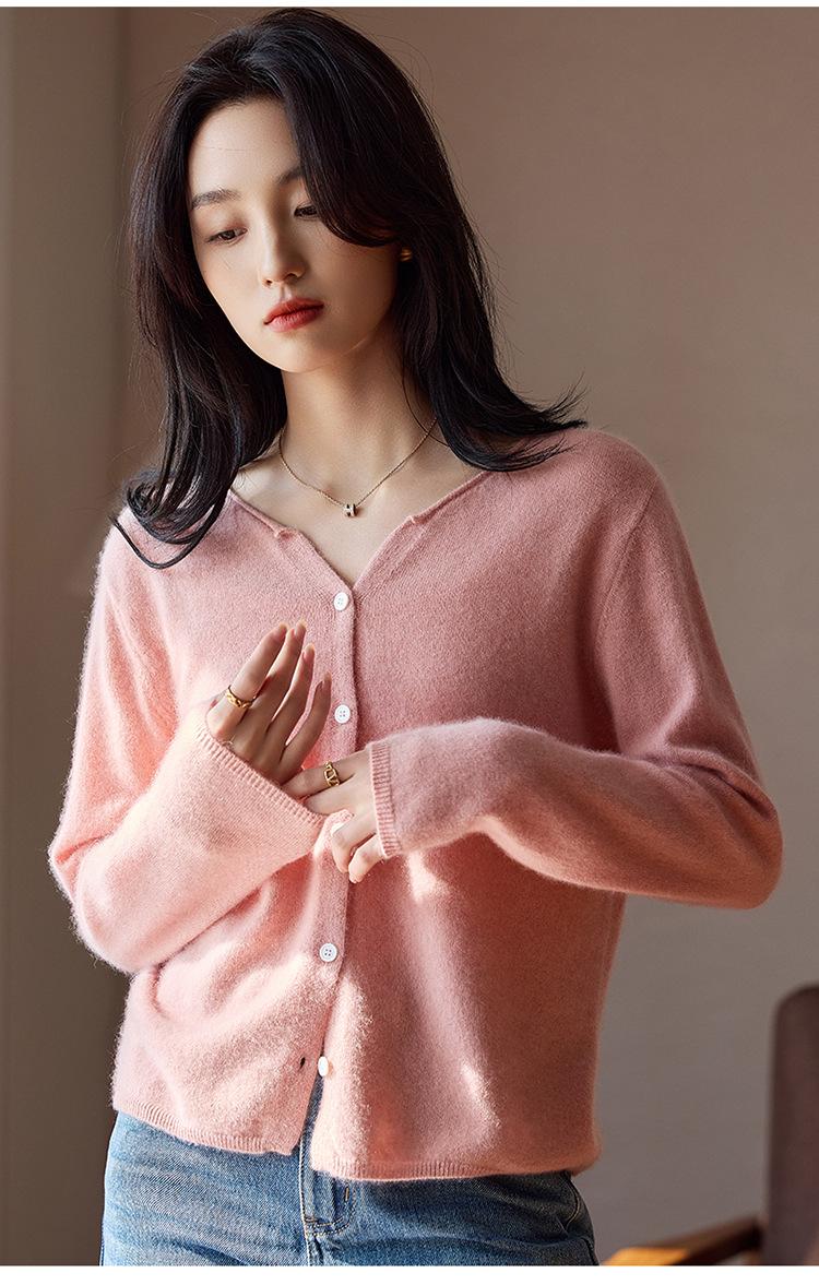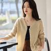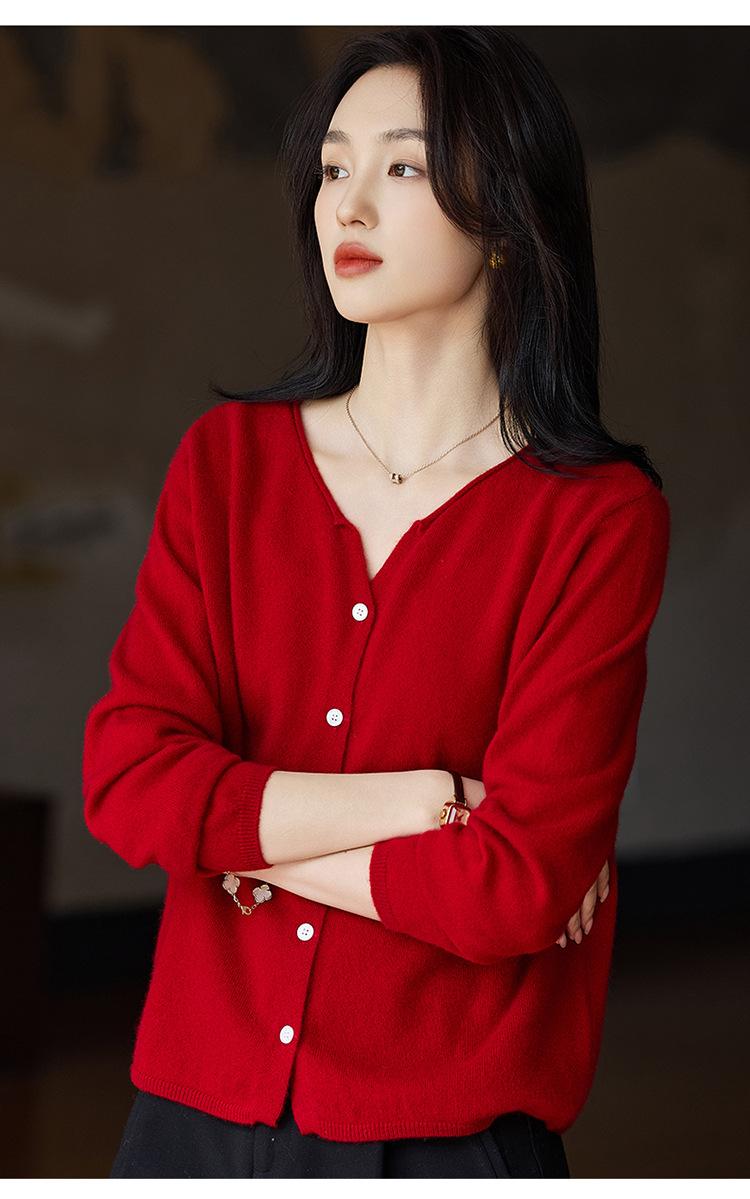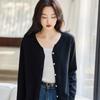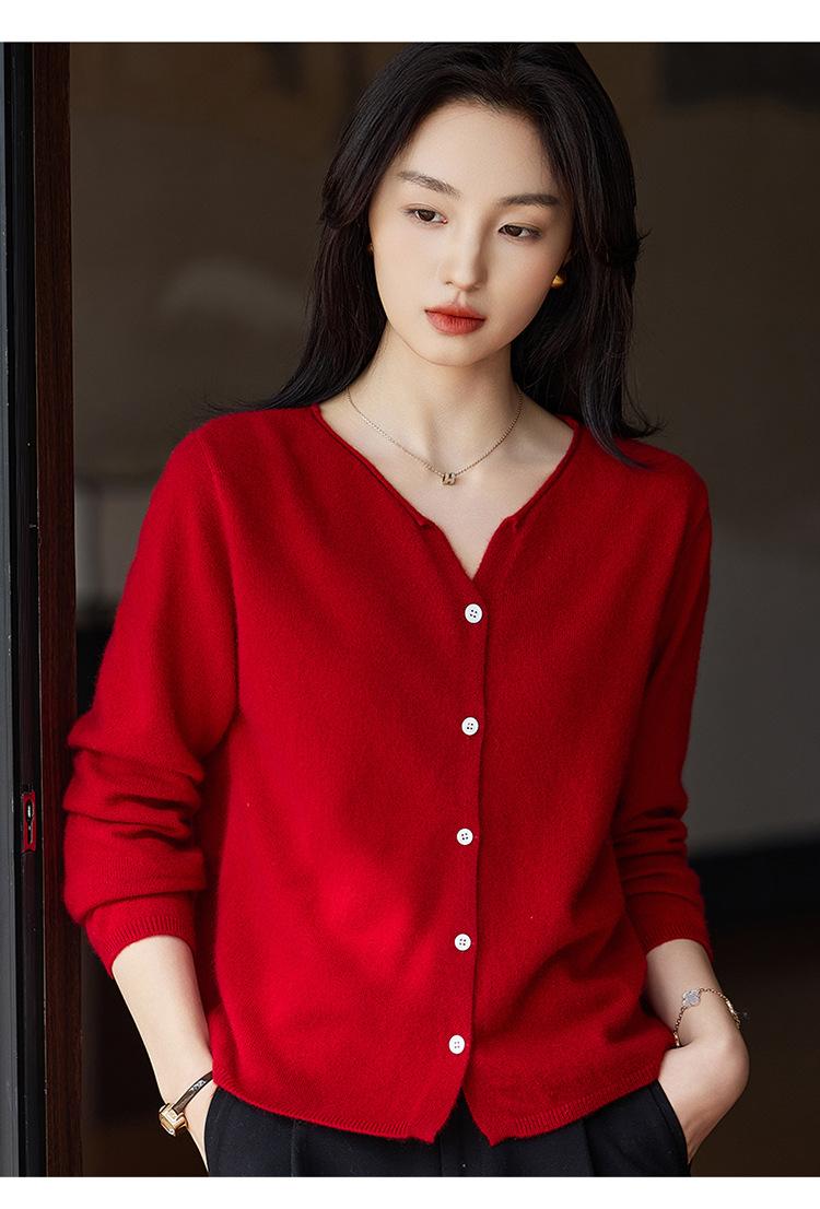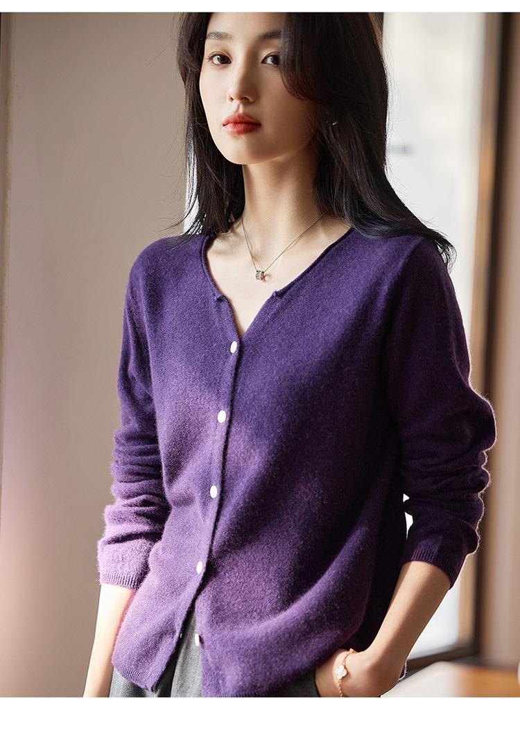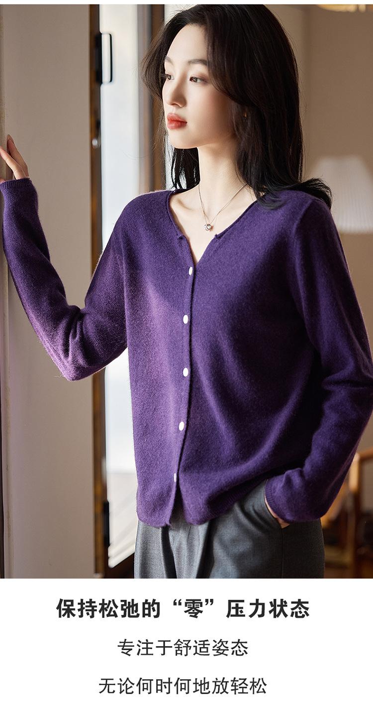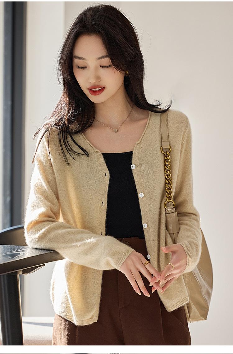 25 Otoño/Invierno Nuevo Cárdigan de Punto de Lana Pura con Cuello en V Manga Larga para Mujer Color Sólido Borde Enrollado Holgado Versátil Top Ropa Exterior