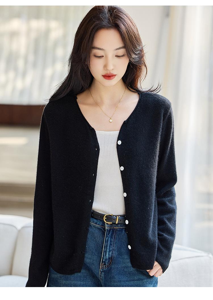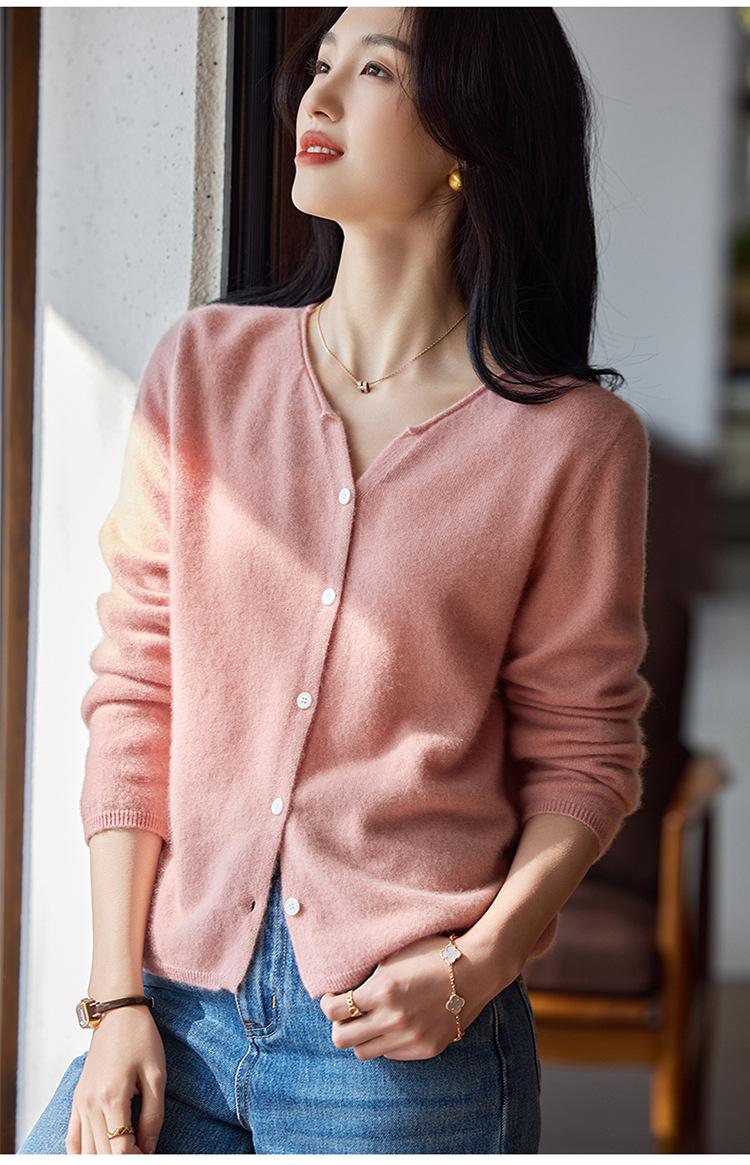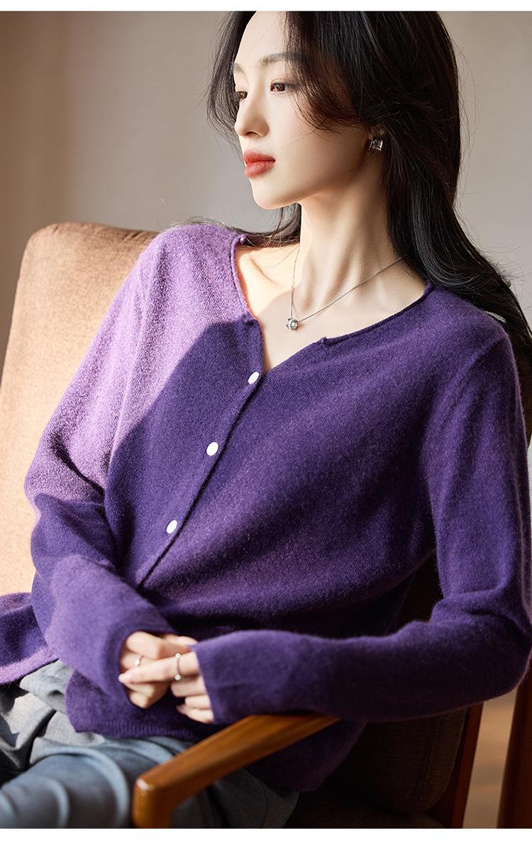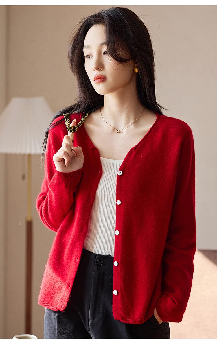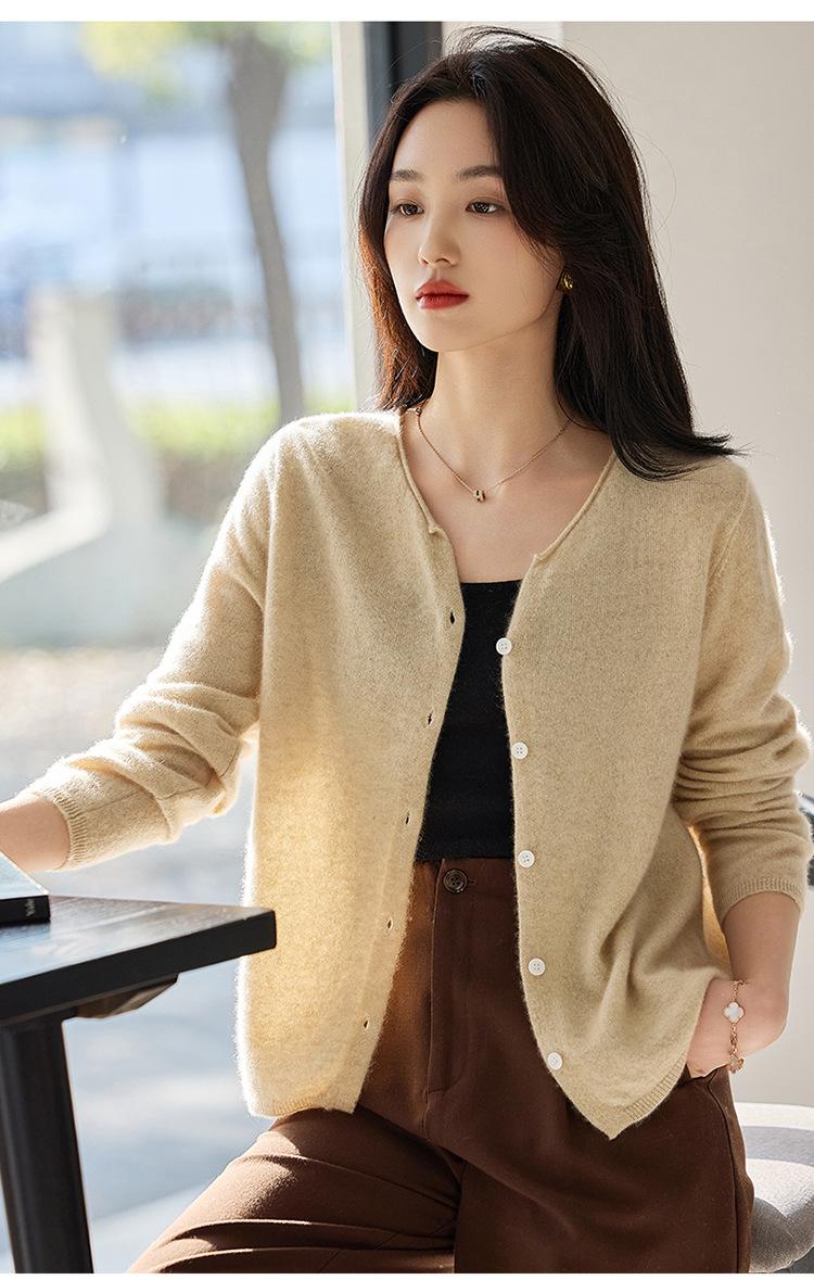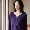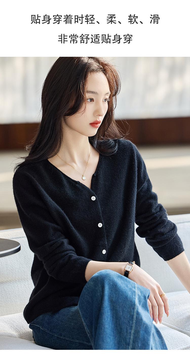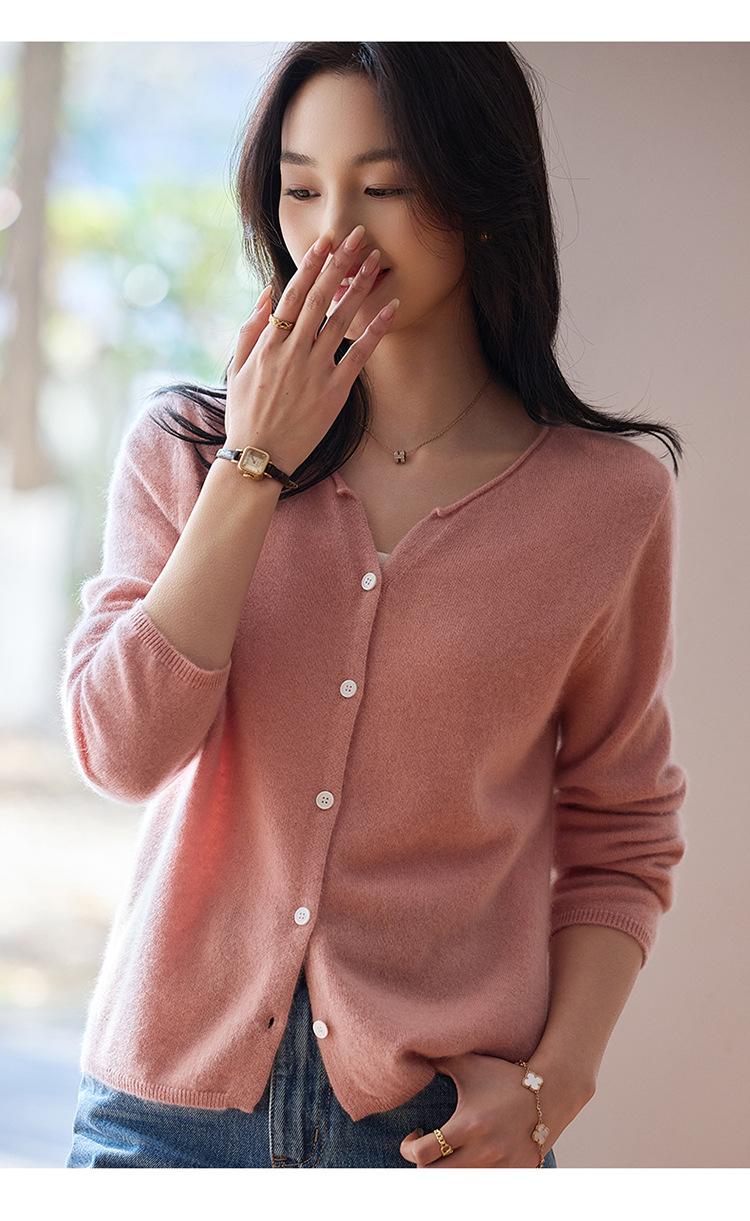 25 Otoño/Invierno Nuevo Cárdigan de Punto de Lana Pura con Cuello en V Manga Larga para Mujer Color Sólido Borde Enrollado Holgado Versátil Top Ropa Exterior