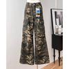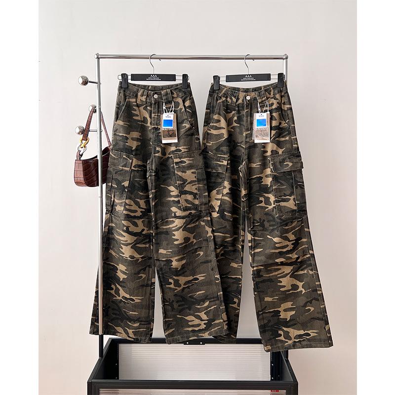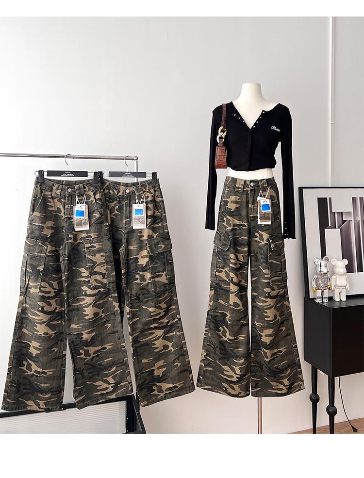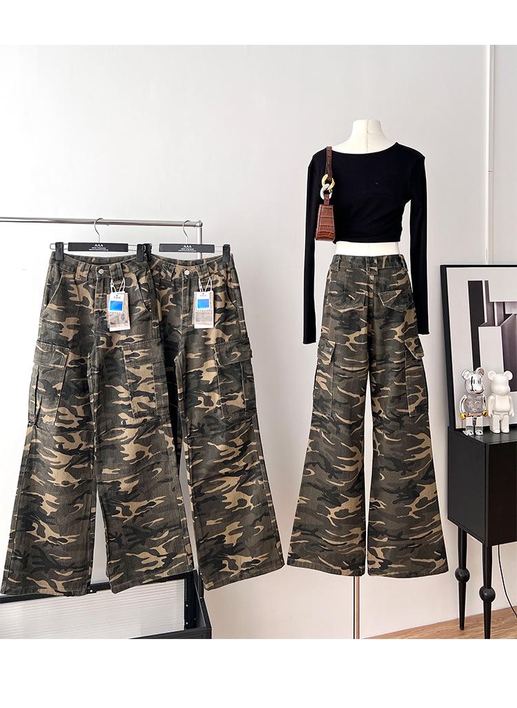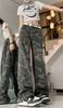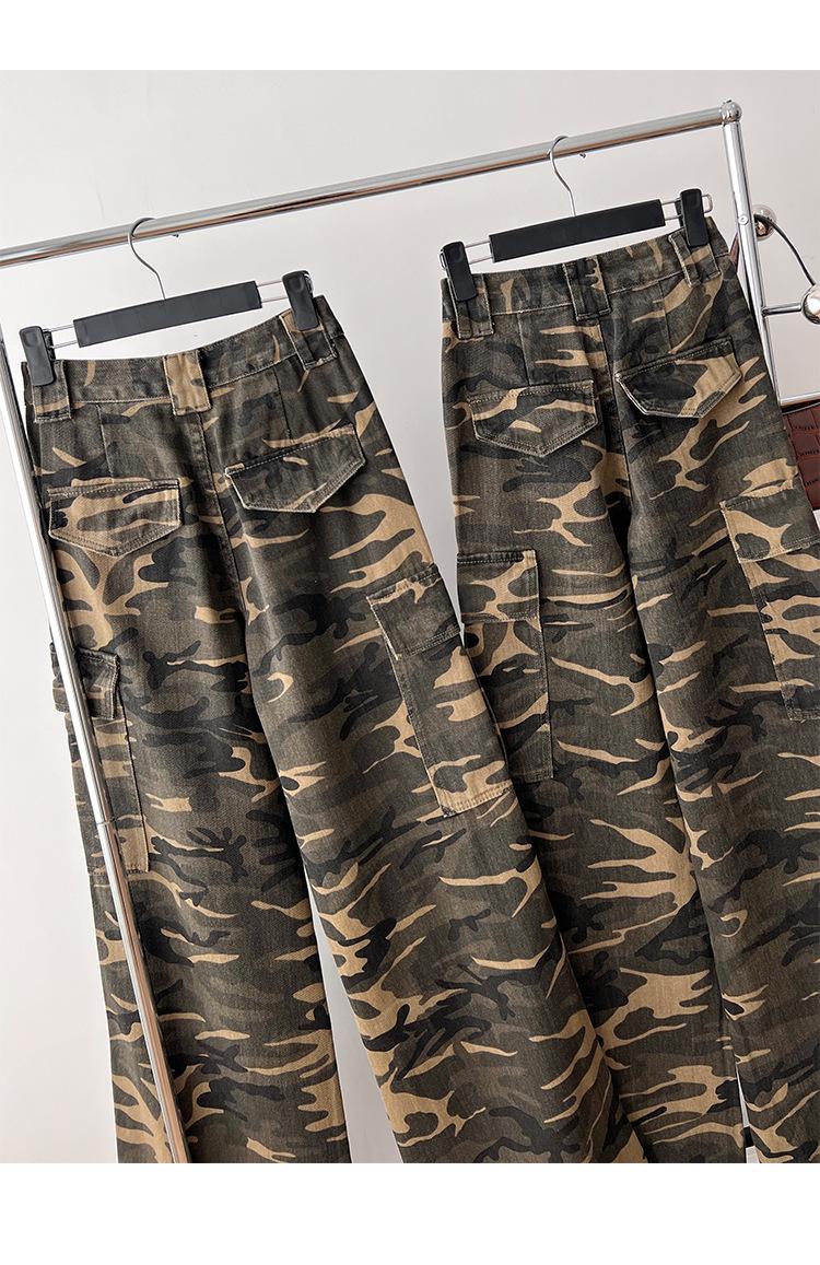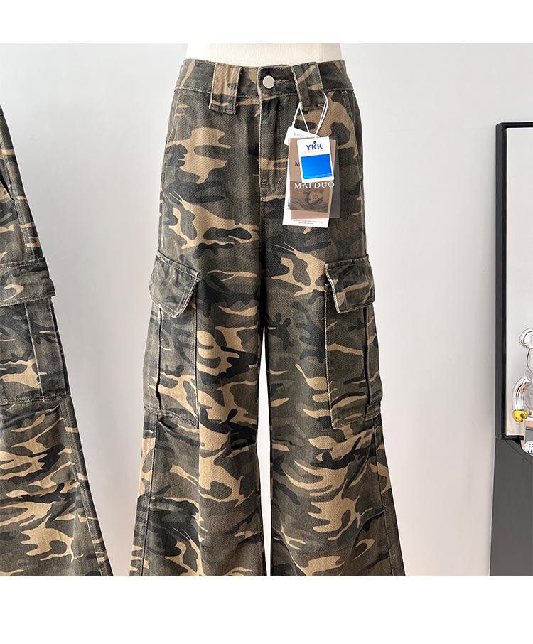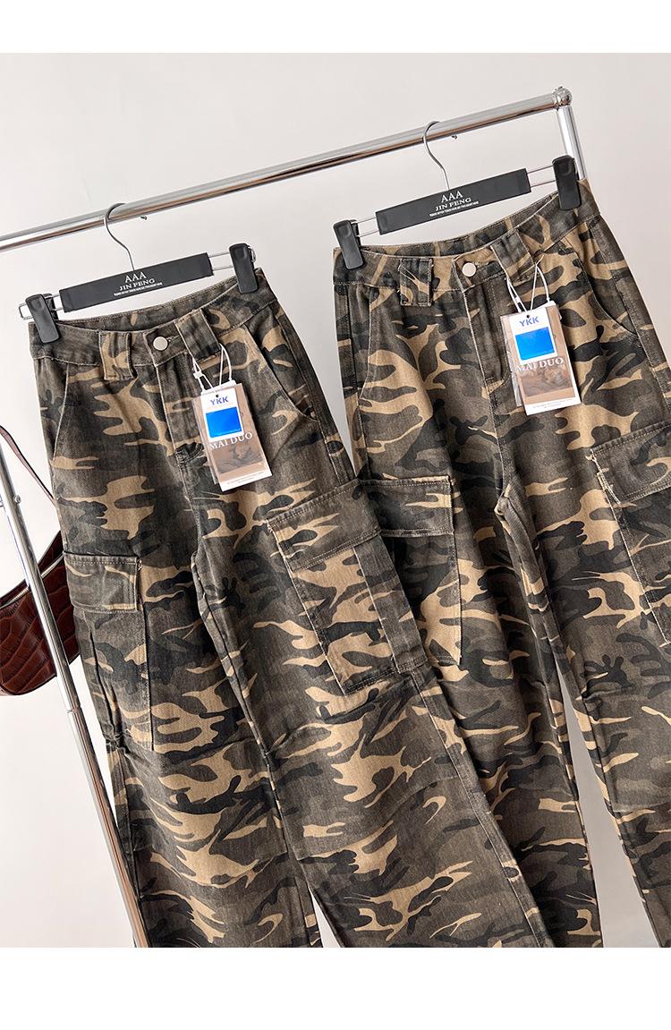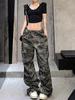 Pantalones Cargo Camuflaje de Diseño Lavado Retro Americano para Mujeres Altas, Pantalones Casuales de Pierna Recta Holgados Multibolsillo de Pierna Ancha