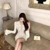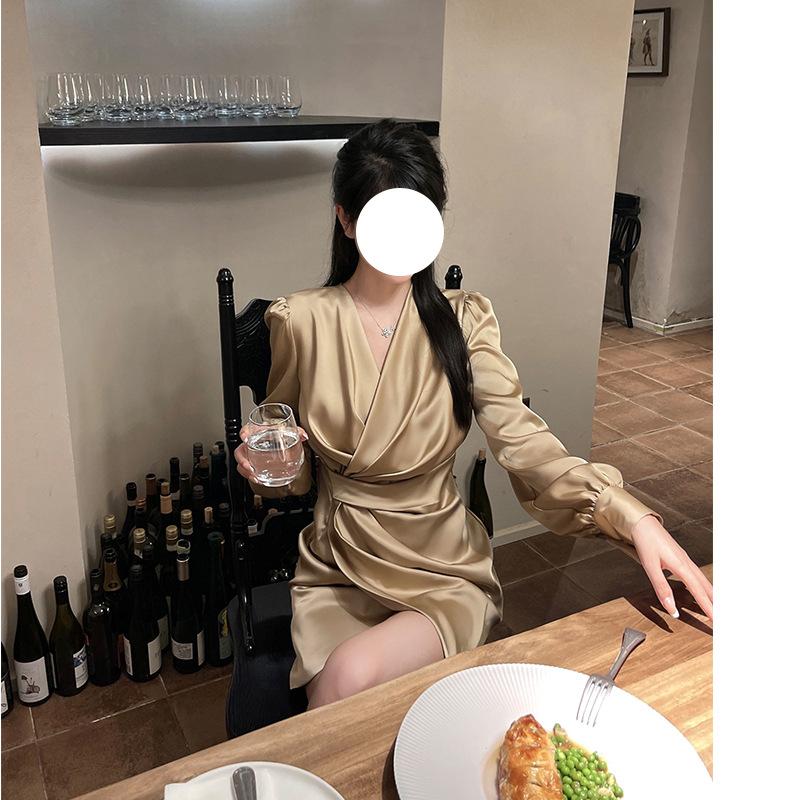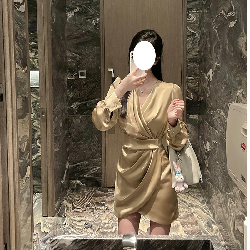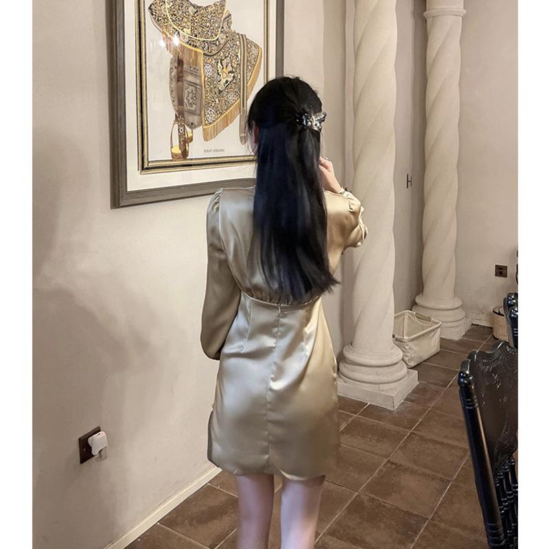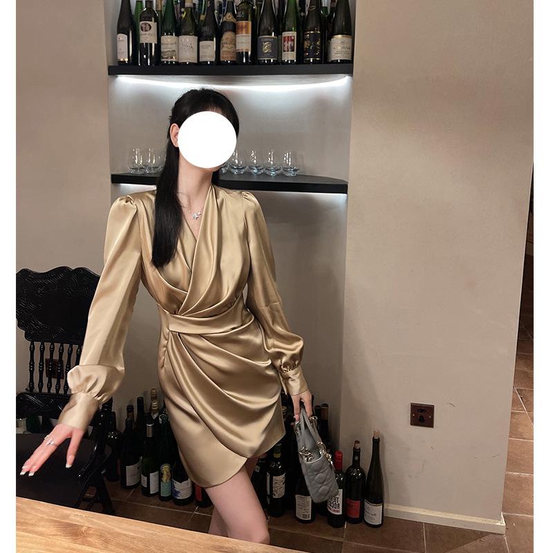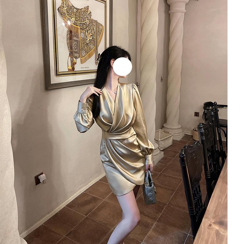 Vestido de Satén Dorado de Manga Larga con Cuello en V y Diseño Fruncido, Vestido Corto y Ajustado Bodycon para Mujer