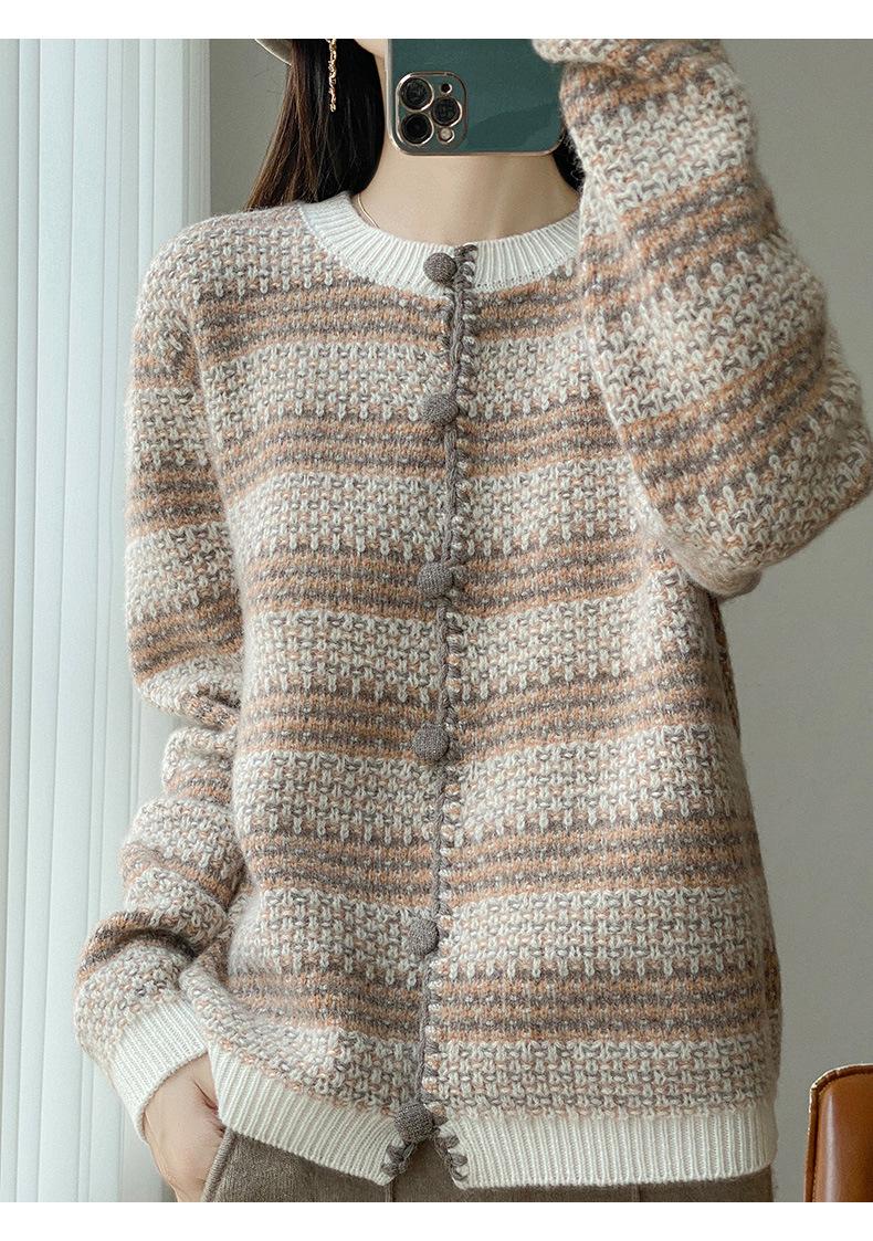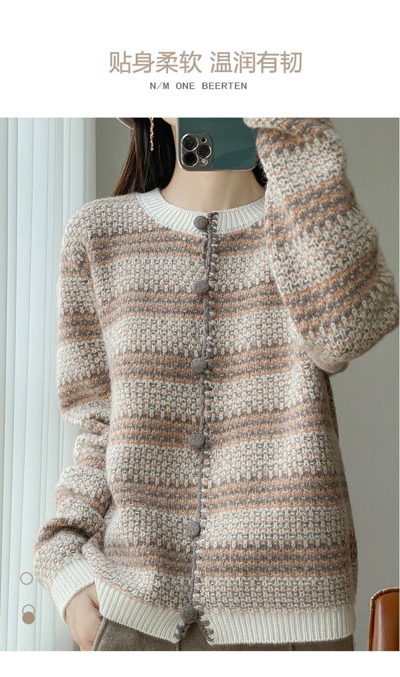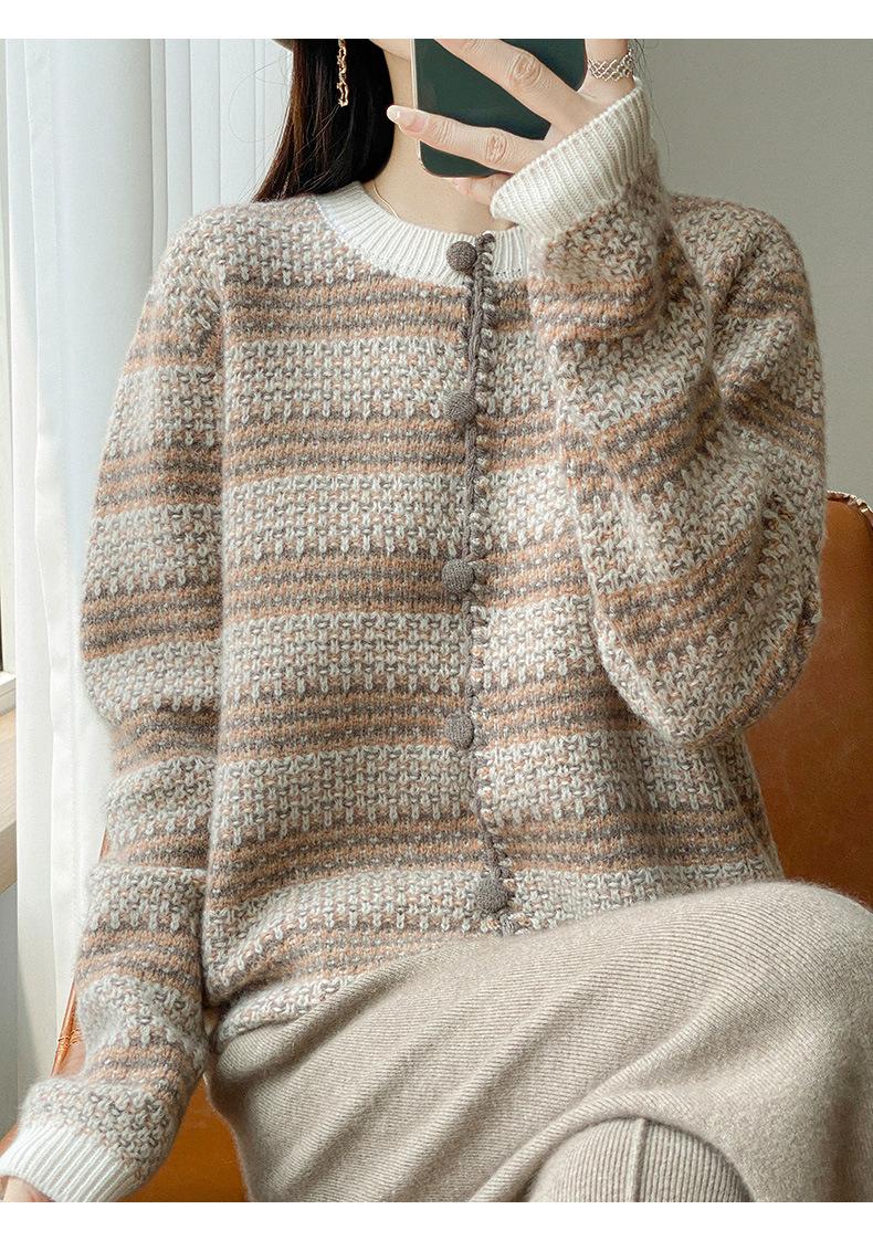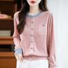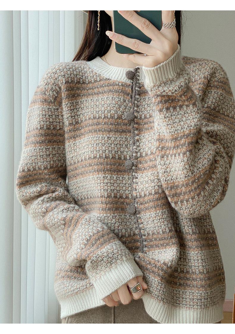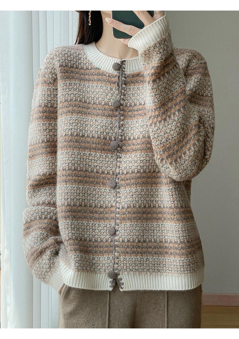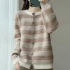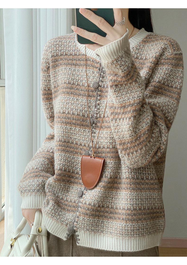 Cárdigan de Punto de Lana Pura de Cuello Redondo Nuevo Otoño/Invierno 2025 Manga Larga Mujer Bloque de Color Suelto Versátil Top Prenda Exterior