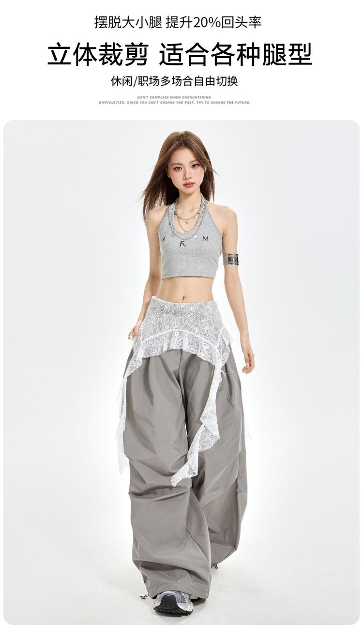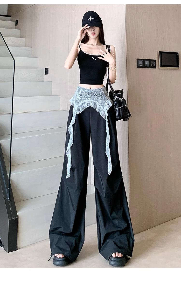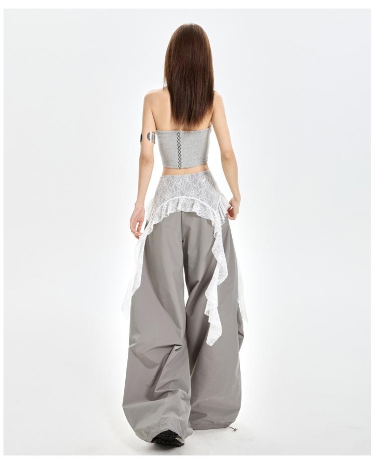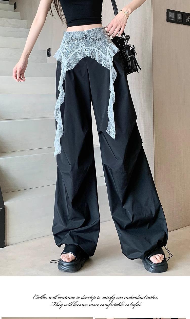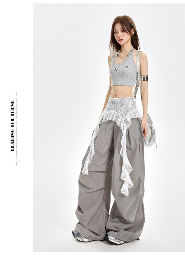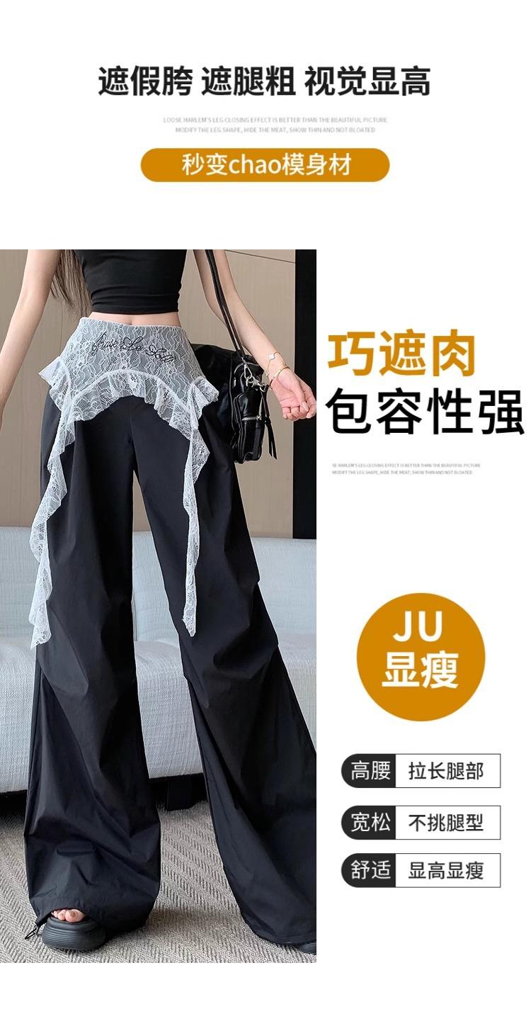 2025 Nuevo Verano Versátil Encaje Patchwork Suelto Casual Falso Dos Piezas Cargo Pierna Ancha Pantalones Largos Tendencia de Mujer