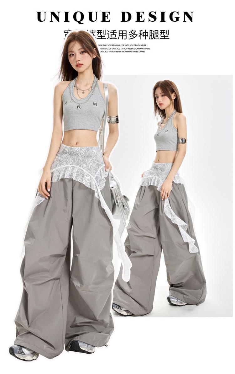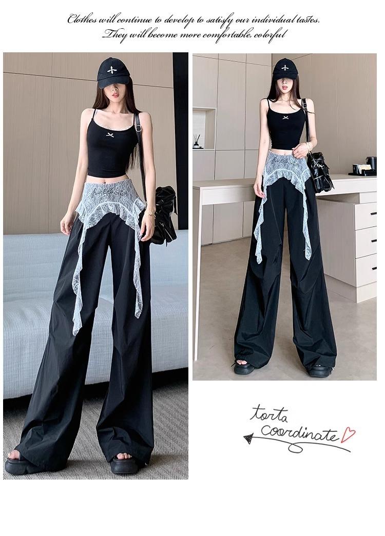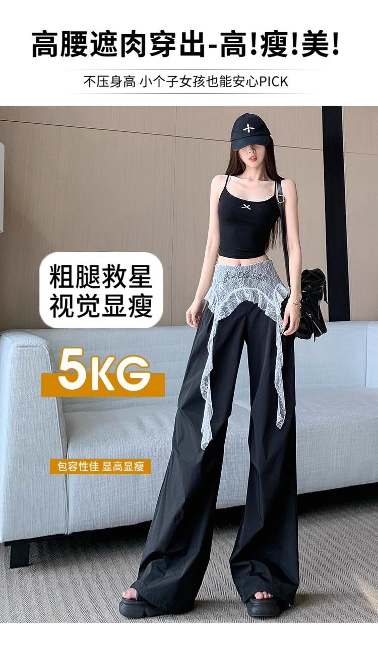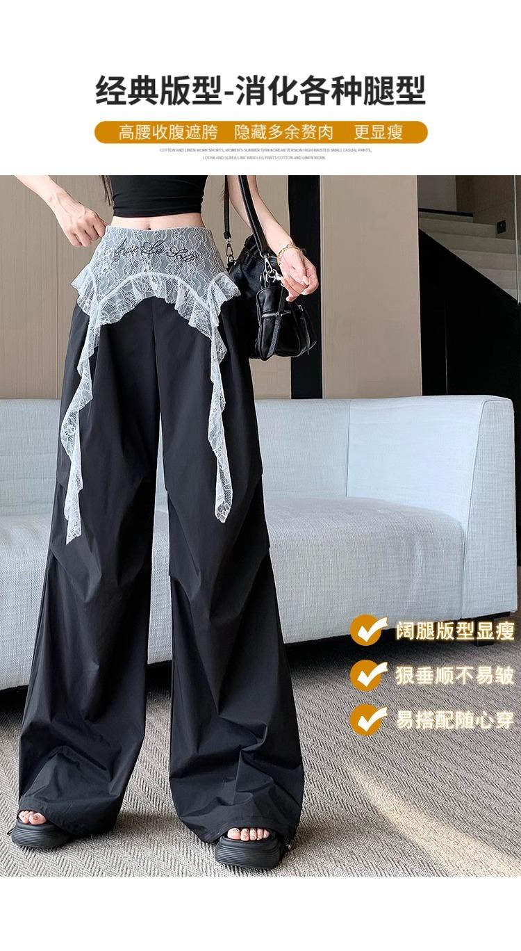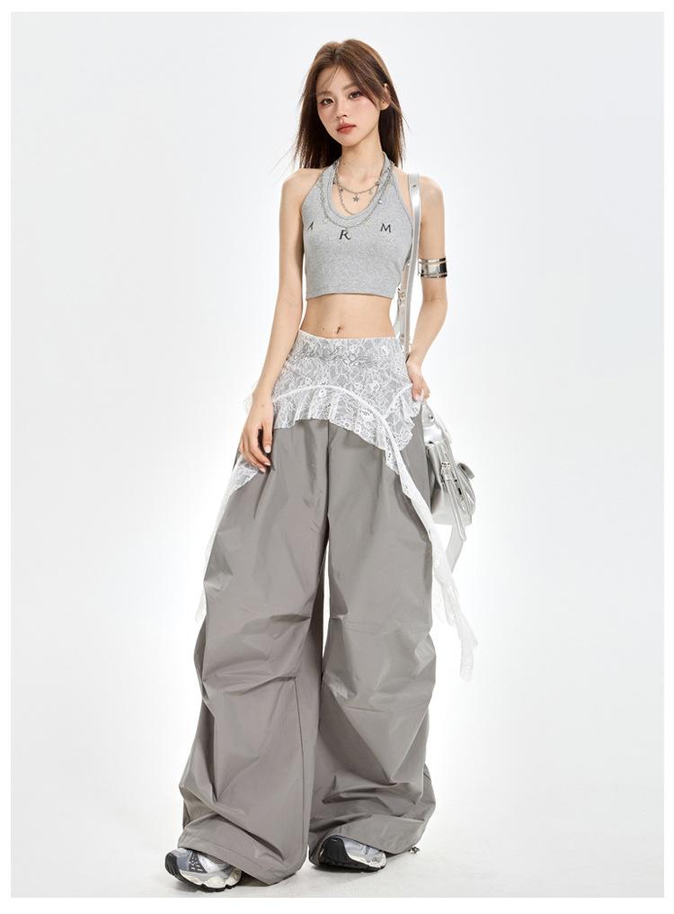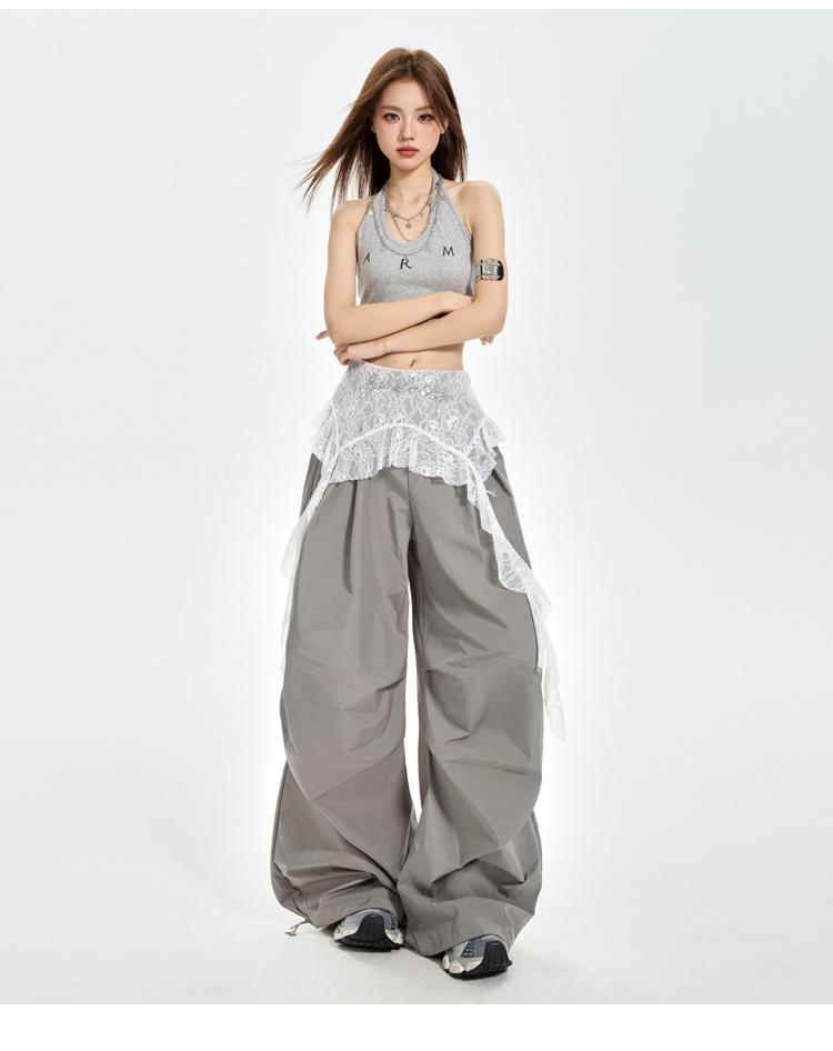 2025 Nuevo Verano Versátil Encaje Patchwork Suelto Casual Falso Dos Piezas Cargo Pierna Ancha Pantalones Largos Tendencia de Mujer