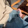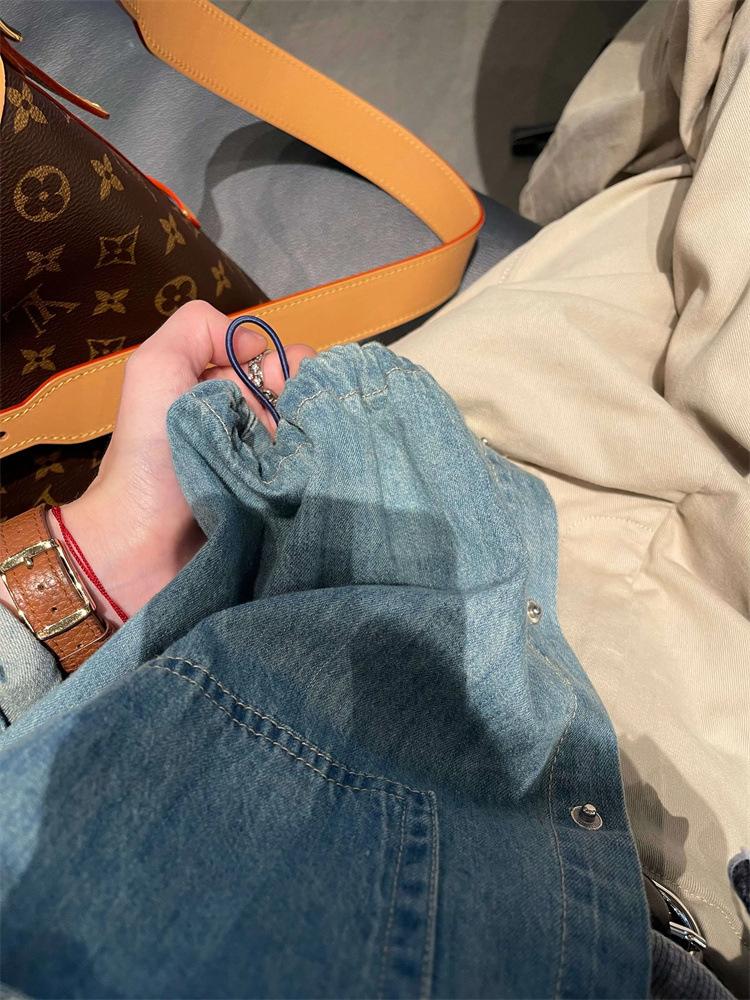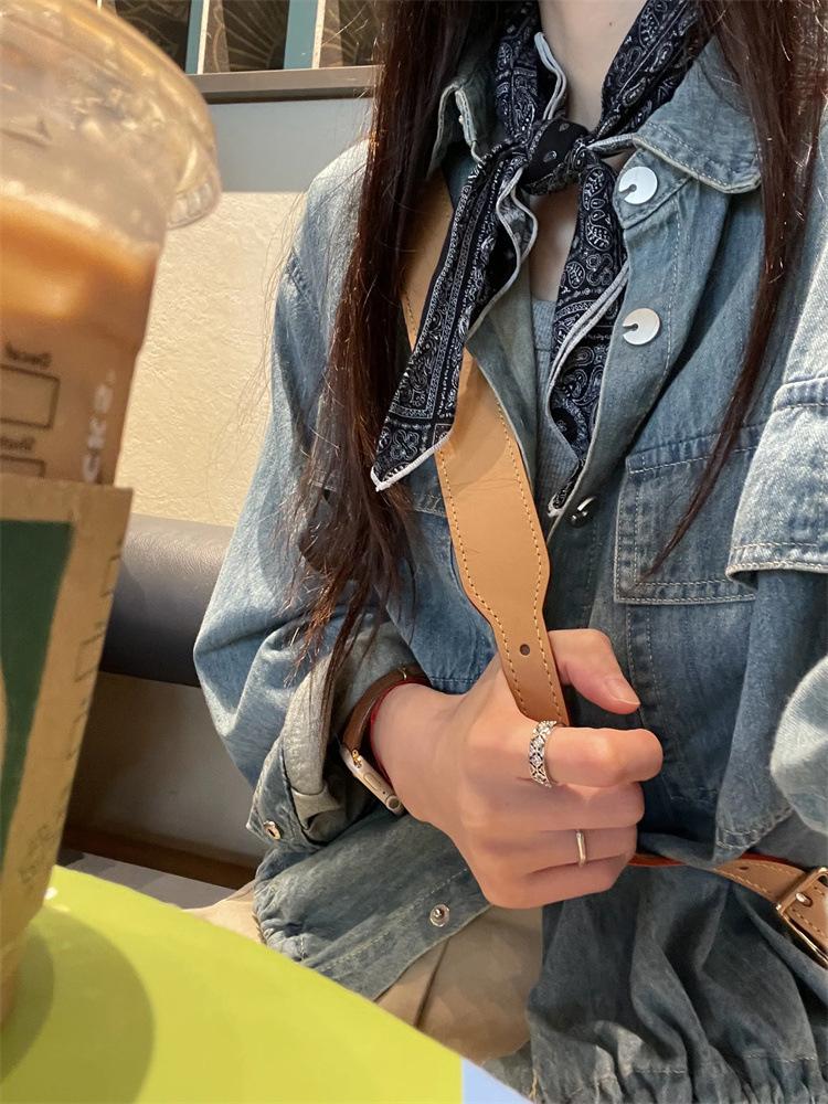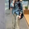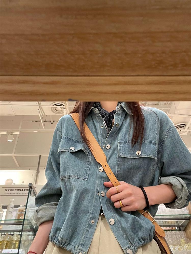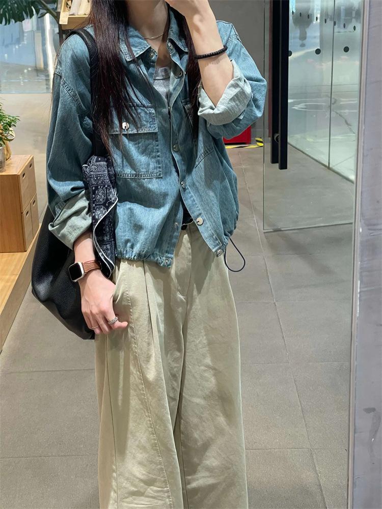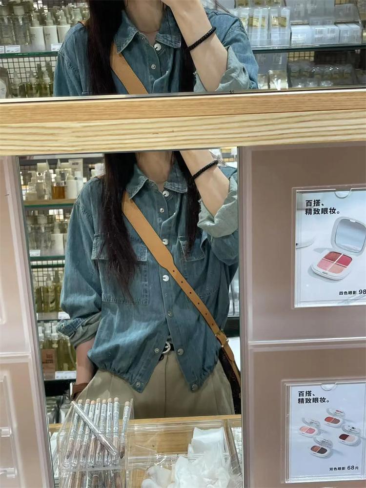 Camisa de mezclilla lavable retro con cuello vuelto y cordón para mujer, otoño, petite, corta, abotonada, a la moda, versátil, prenda exterior