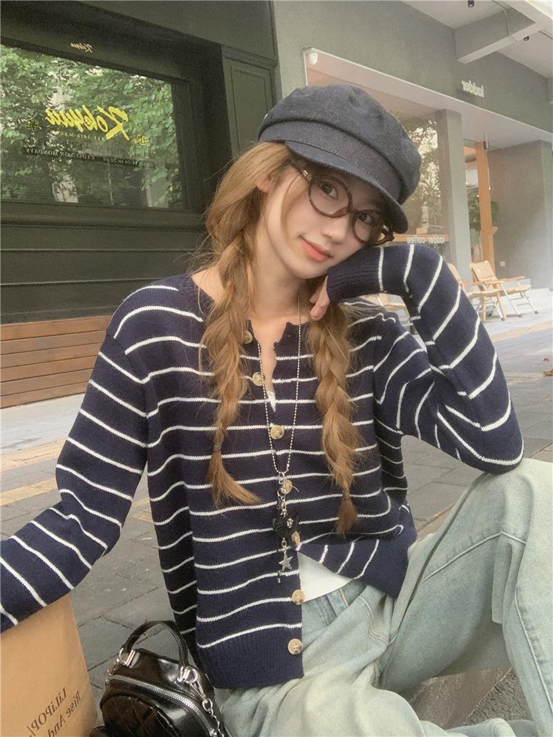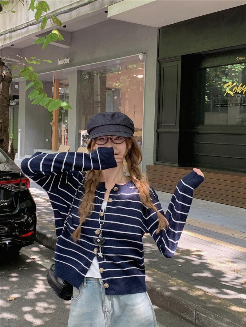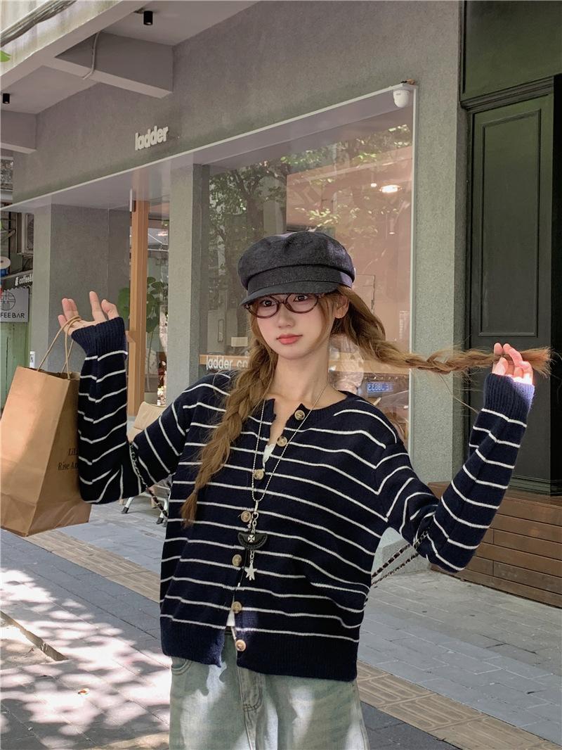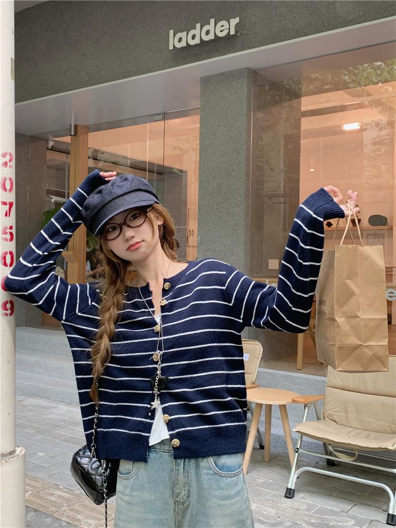 Foto Real Primavera y Otoño Nuevo Estilo Coreano Casual Versátil Cárdigan de Punto Rayado Ropa de Mujer