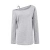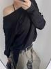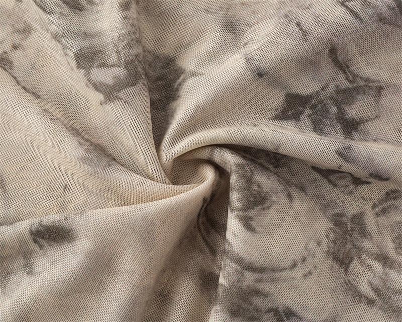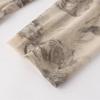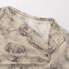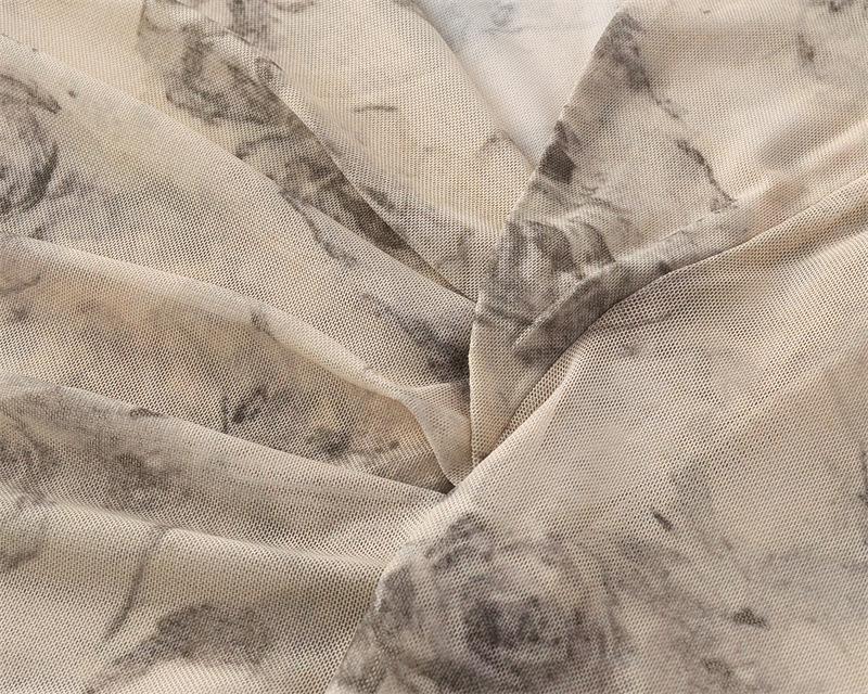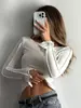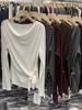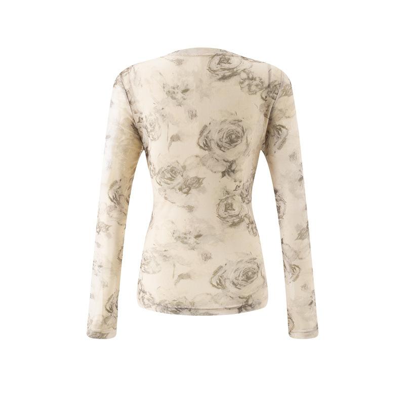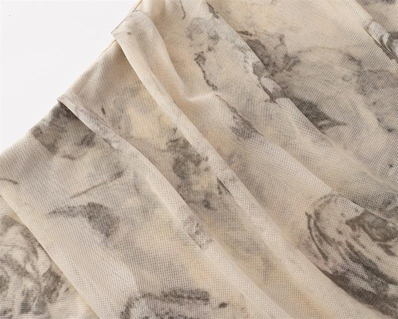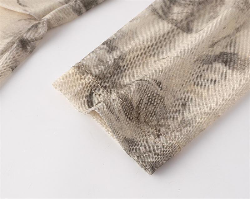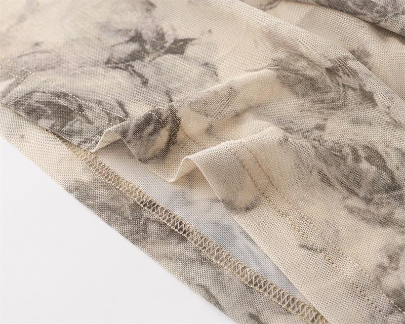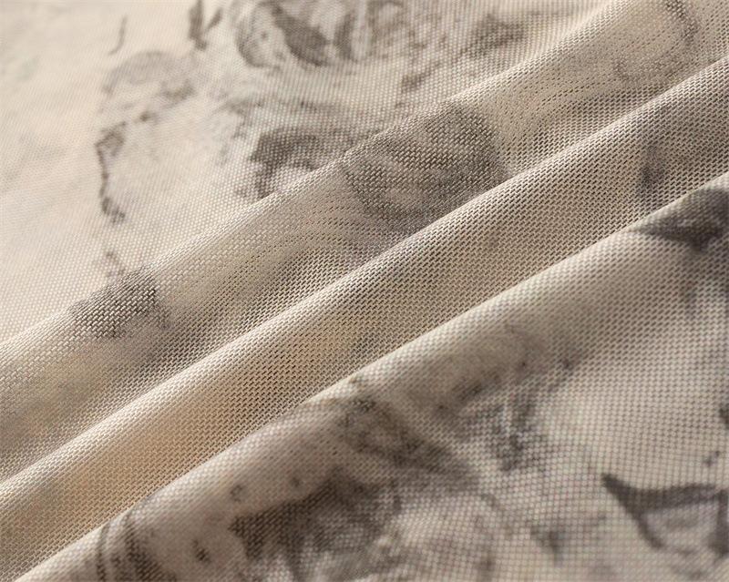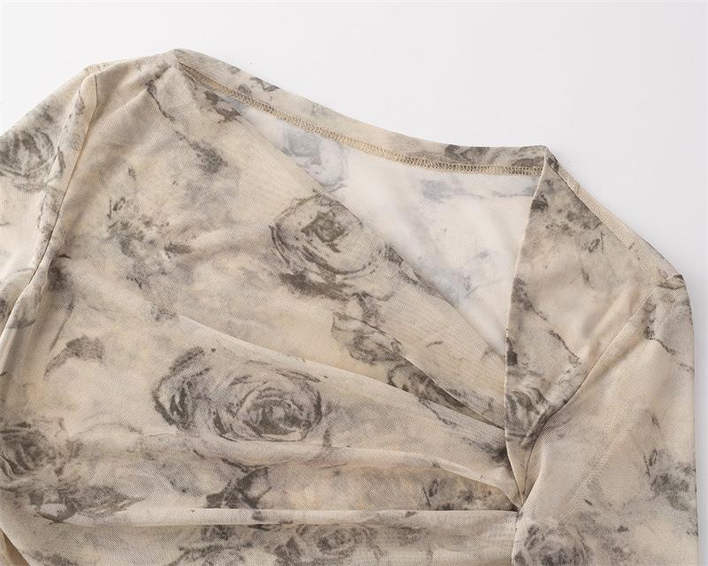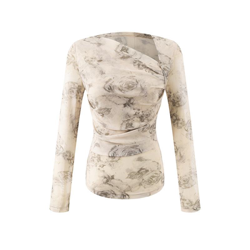 Camiseta de malla de manga larga estampada plisada asimétrica con sentido del diseño de estilo europeo y americano, nueva de otoño, versátil, entallada, para mujer