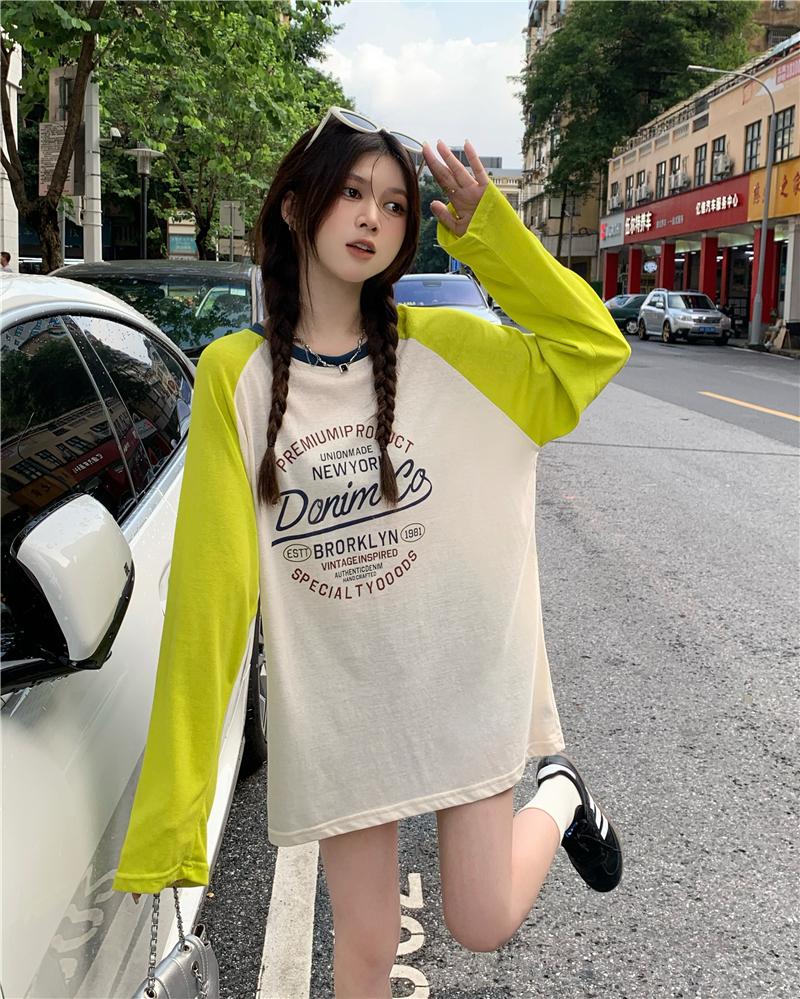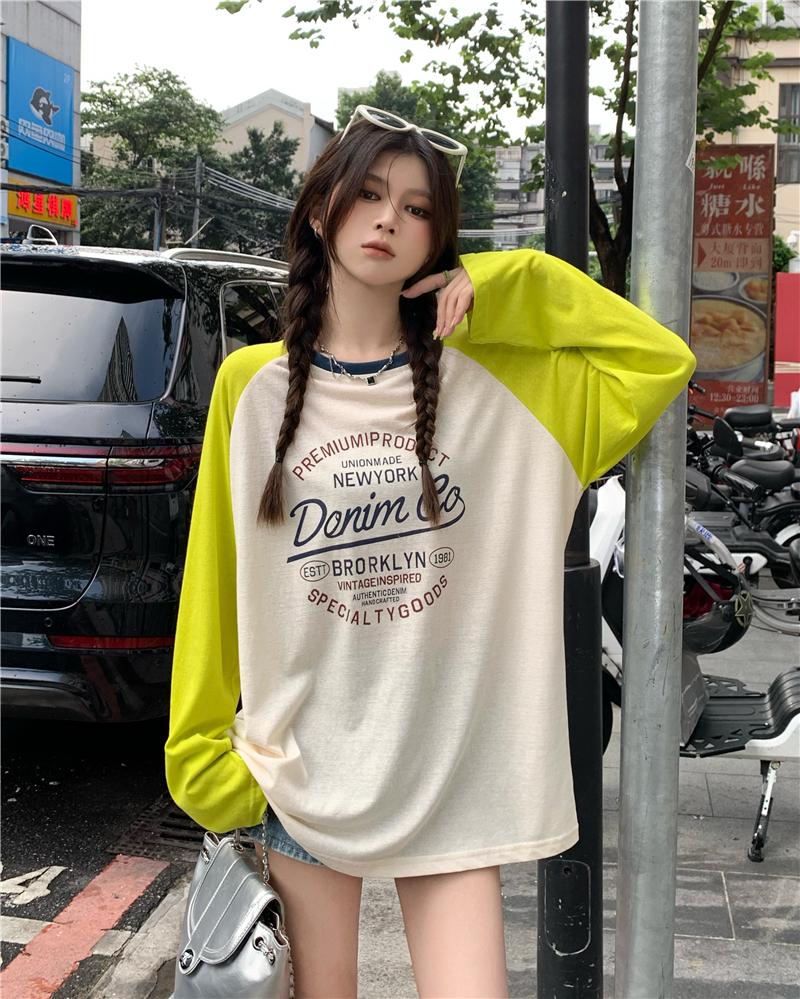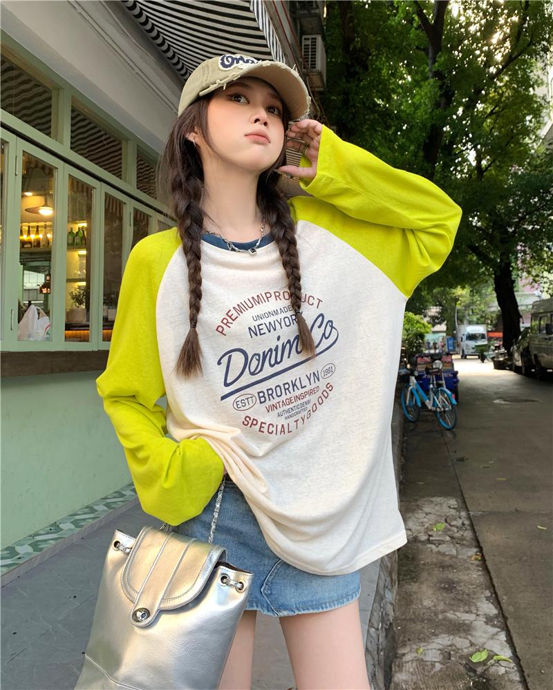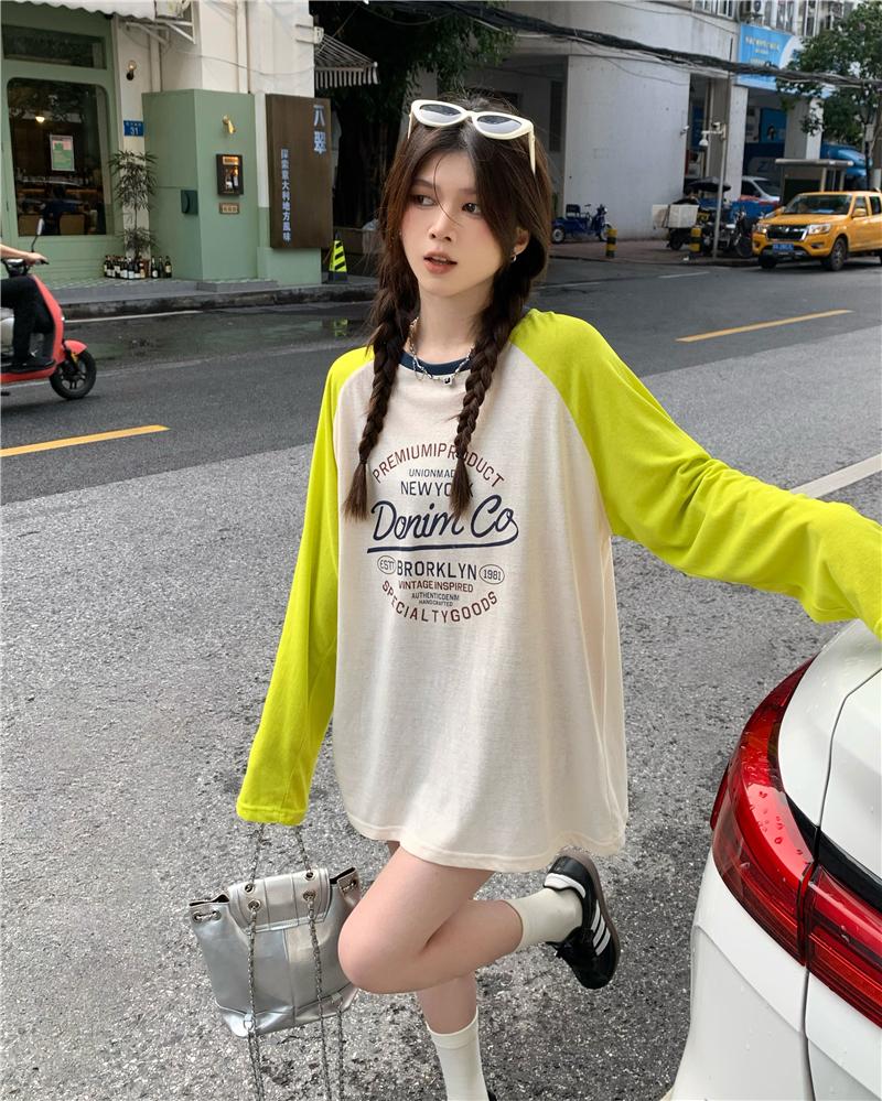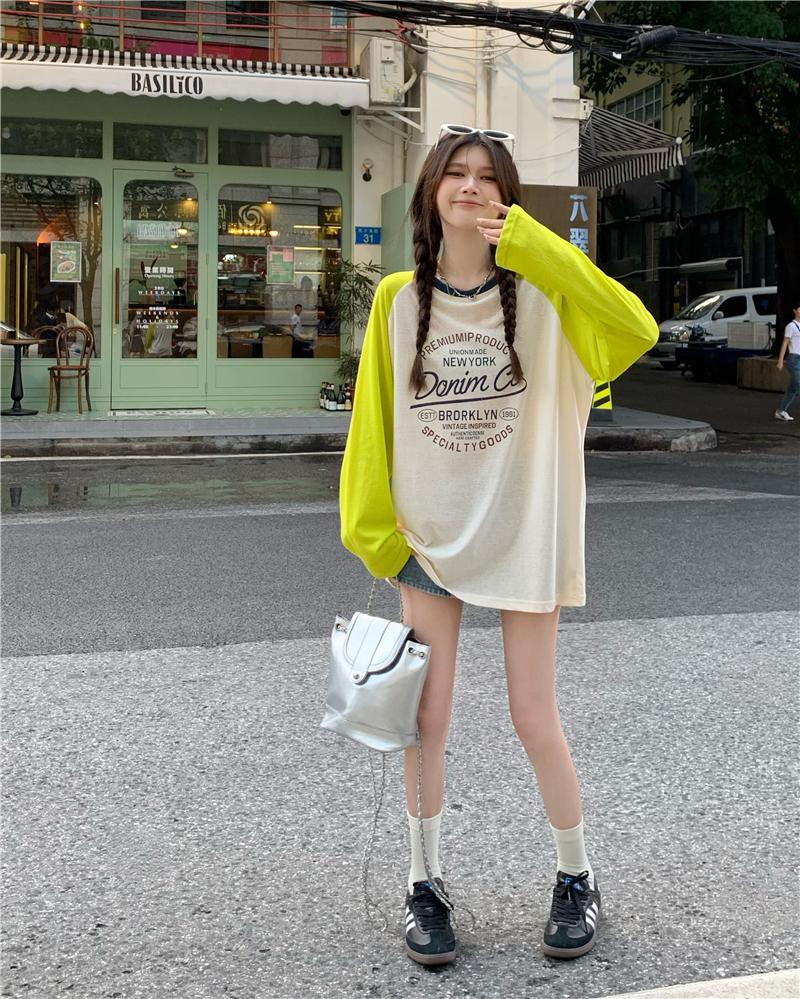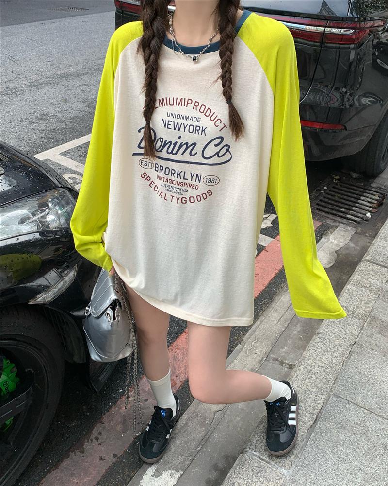 Playera de Manga Raglán Contrastante Estilo Coreano para Mujer, Blusa Holgada de Verano Estilo Lazy con Estampado de Letras, Top de Alta Gama