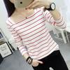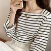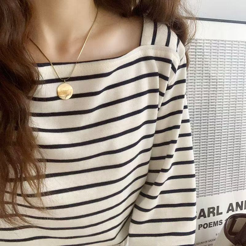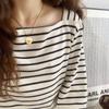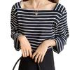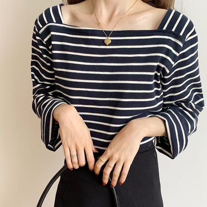 Camiseta de Manga Larga a Rayas con Cuello Cuadrado Francés para Primavera y Otoño para Mujer, Holgada, Adelgazante, con Sentido del Diseño de Moda, Chic, Versátil, a la Moda