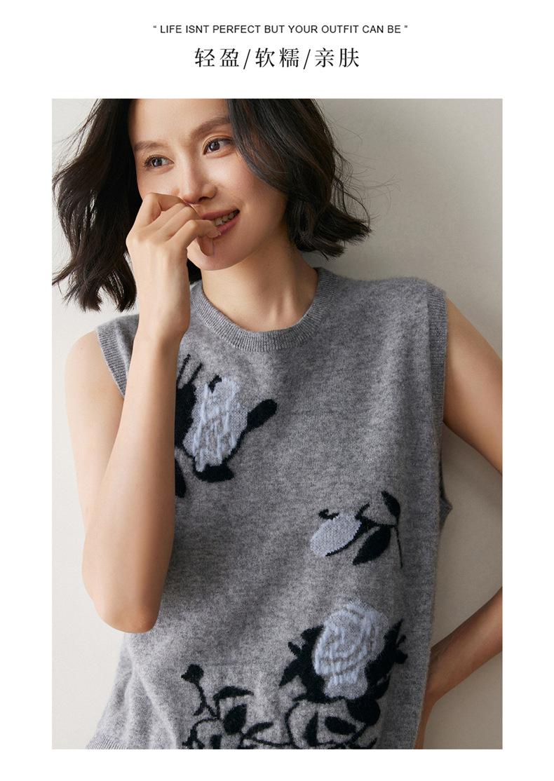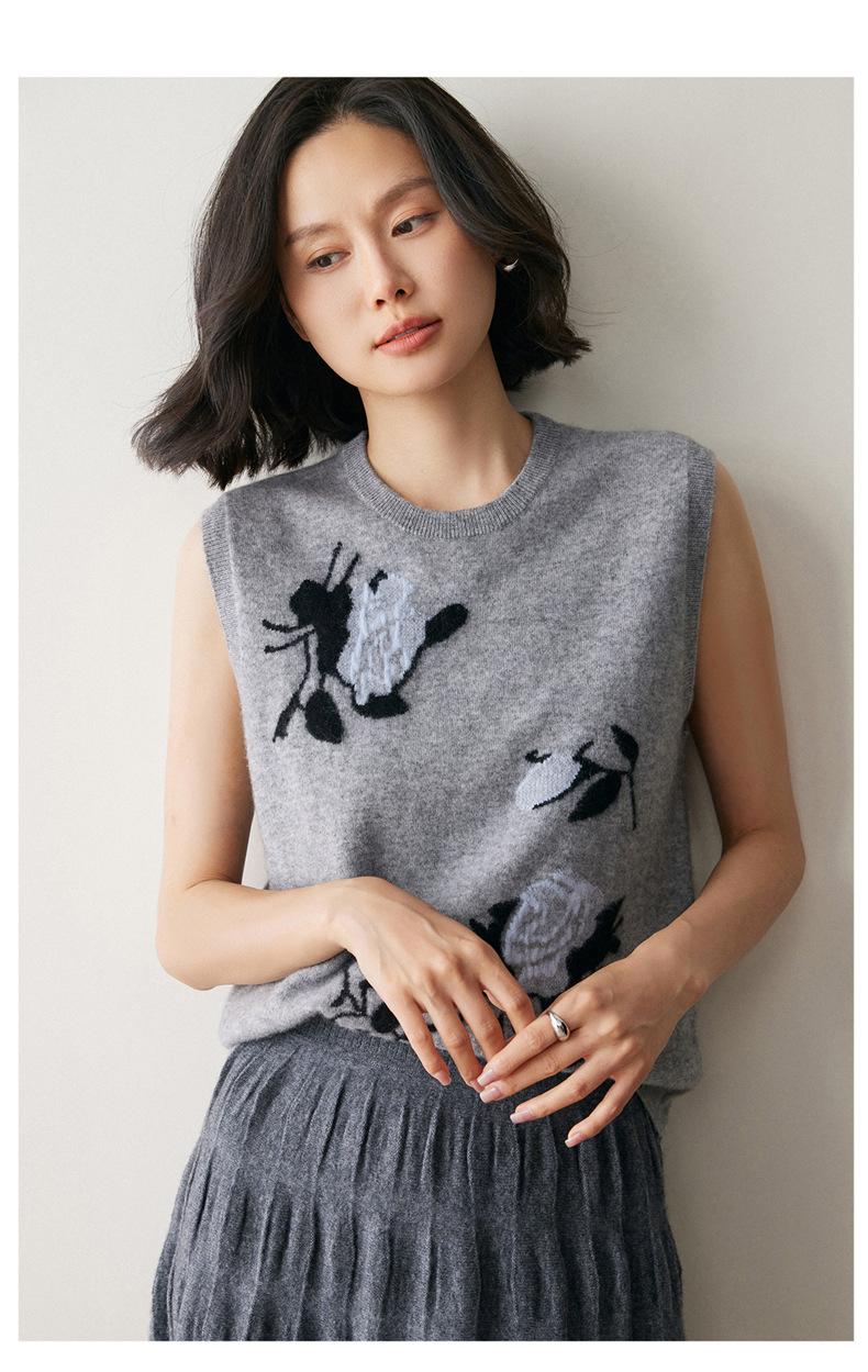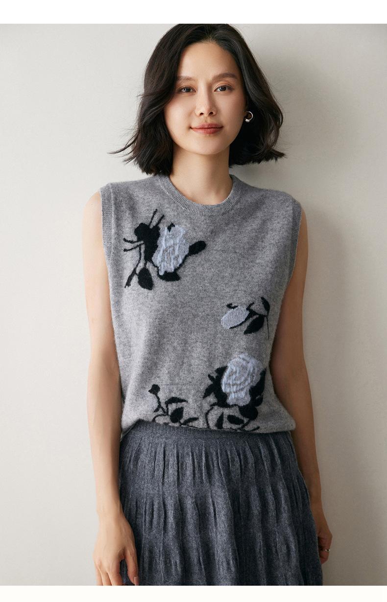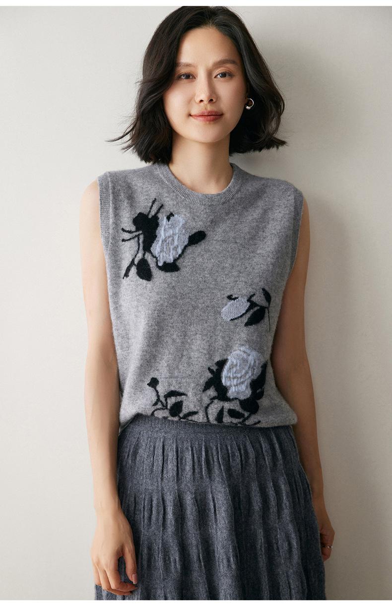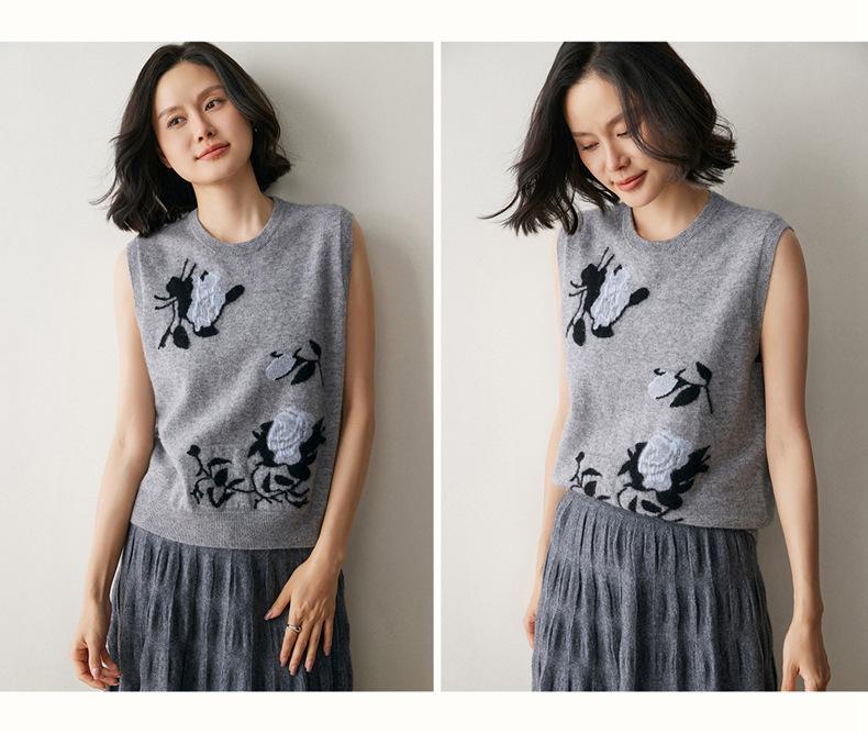 Chaleco de punto de cuello redondo jacquard celadón de camelia para mujer, nuevo, de cachemira, temperamento, adelgazante, versátil, sin mangas