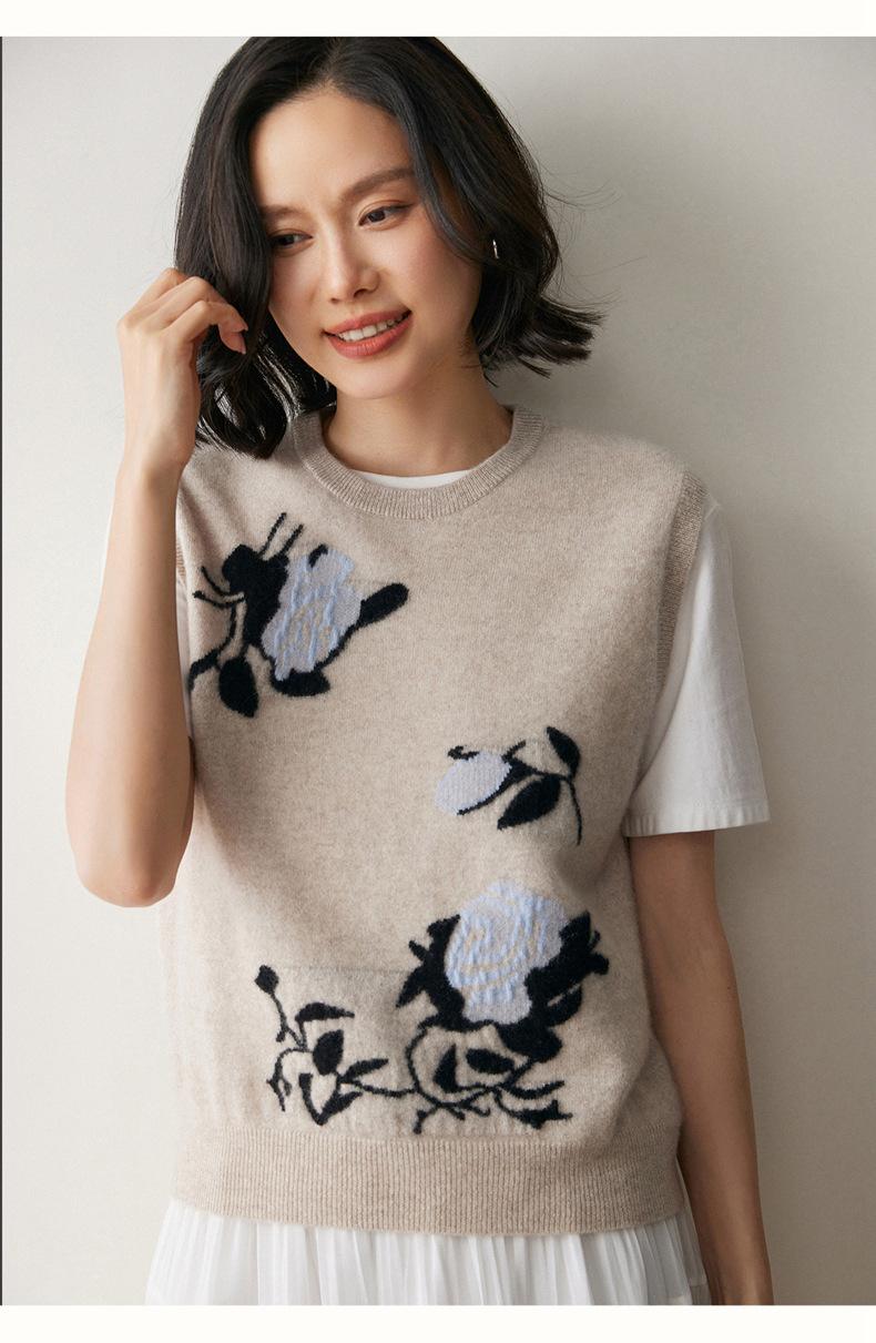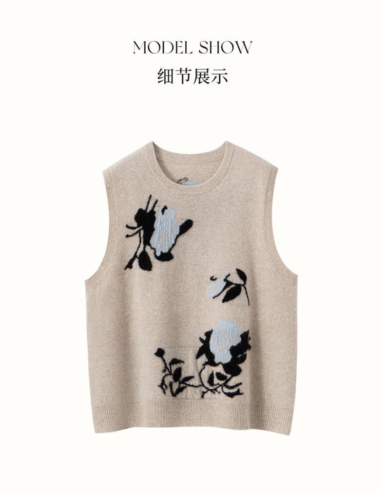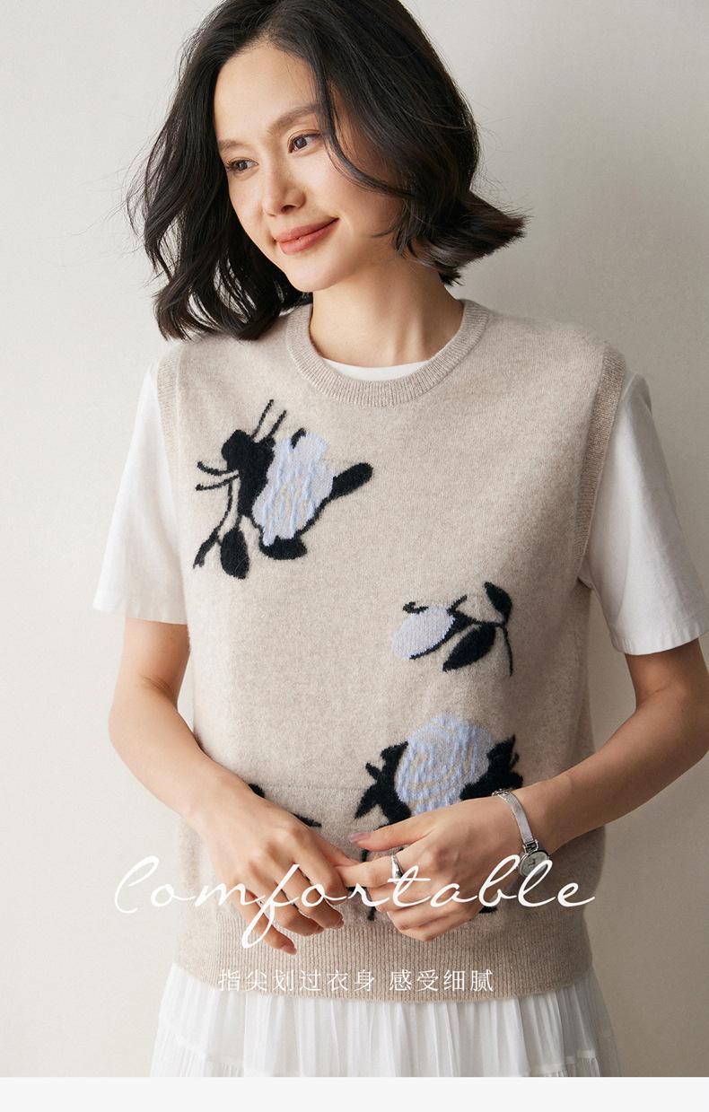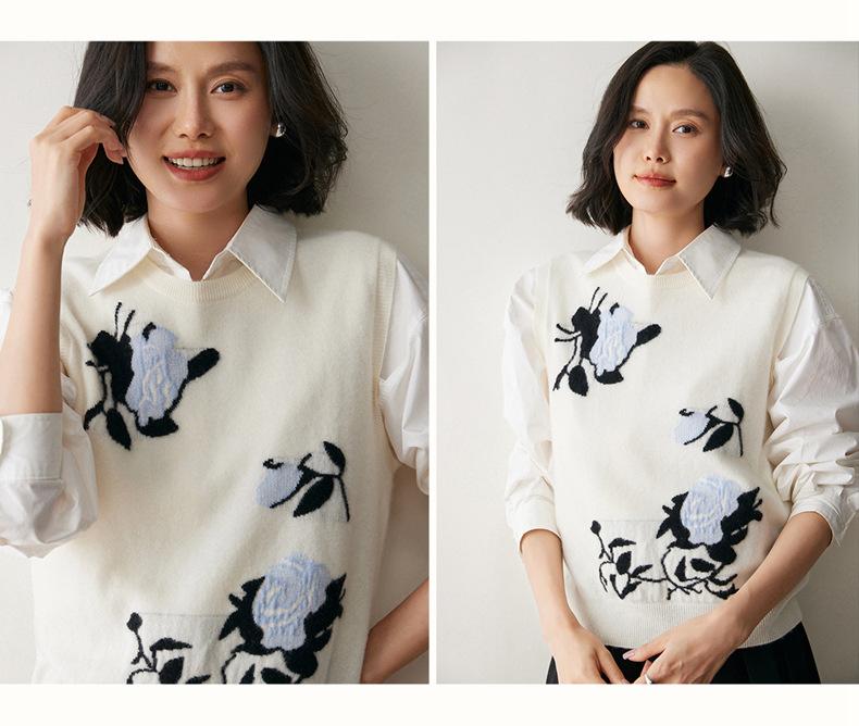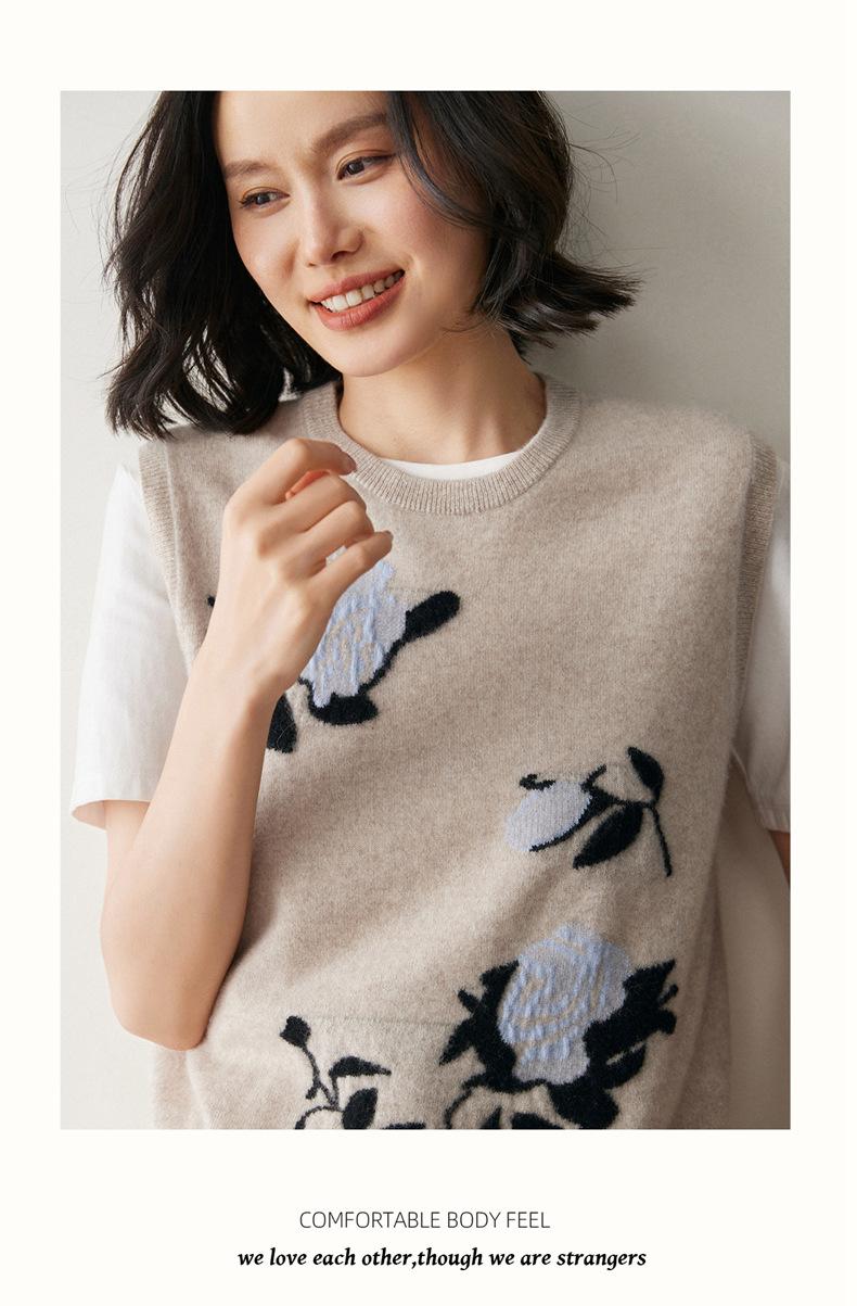 Chaleco de punto de cuello redondo jacquard celadón de camelia para mujer, nuevo, de cachemira, temperamento, adelgazante, versátil, sin mangas