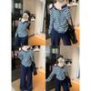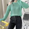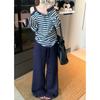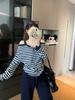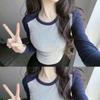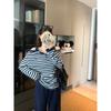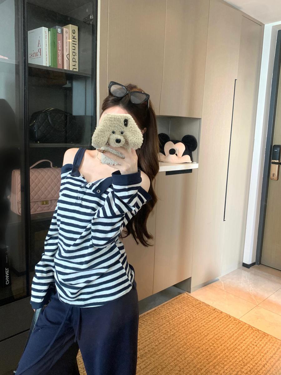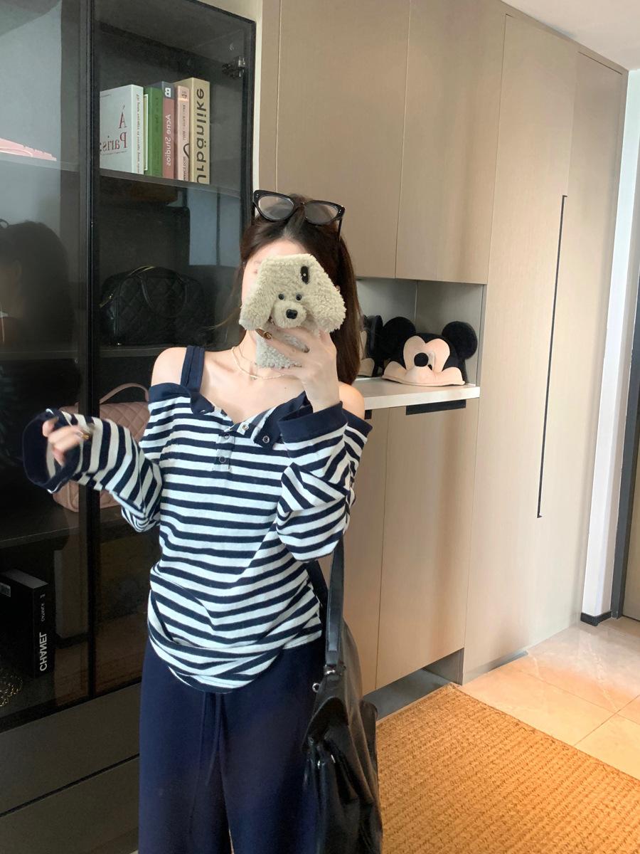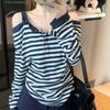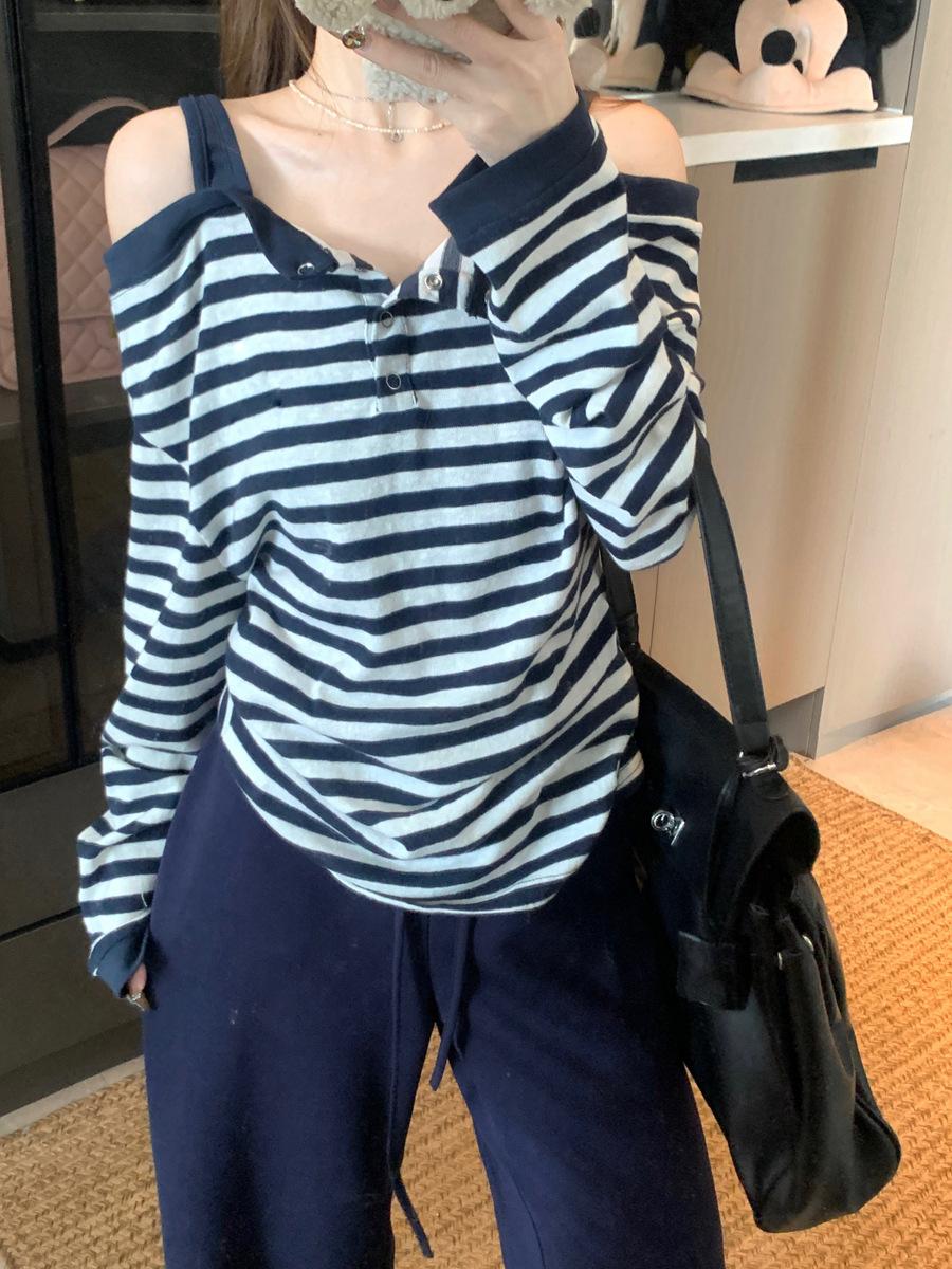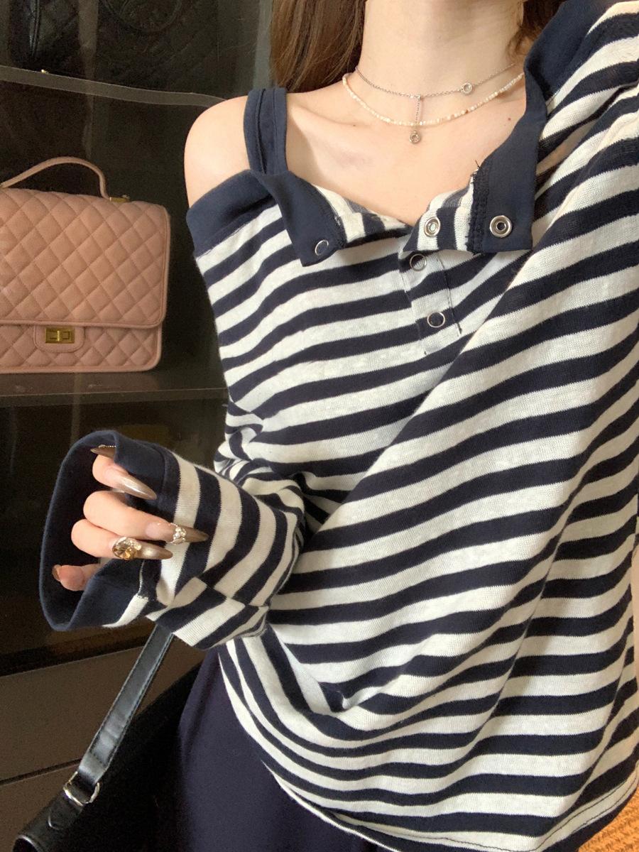 Foto Real Camiseta de Manga Larga con Hombros Descubiertos Estilo Dulce y Picante a Rayas para Mujer Top Casual Adelgazante de Dos Piezas Falsas Moderno 88549