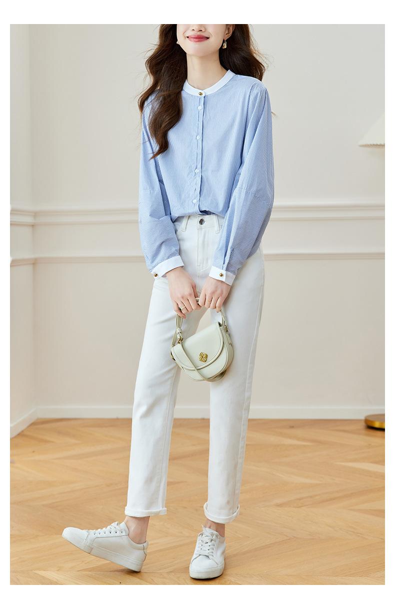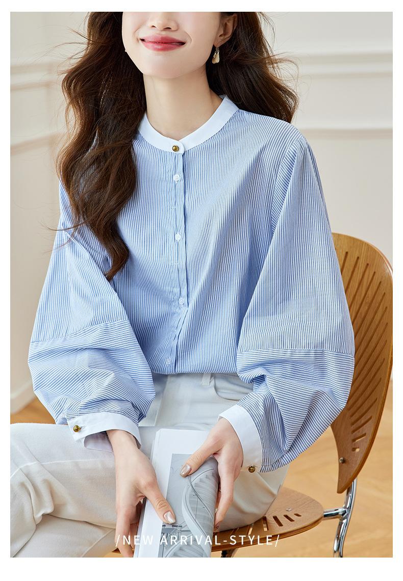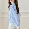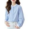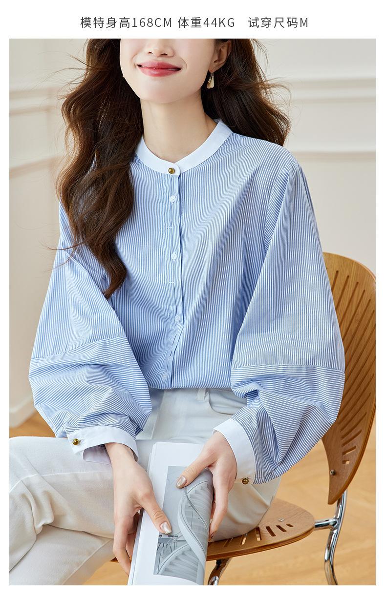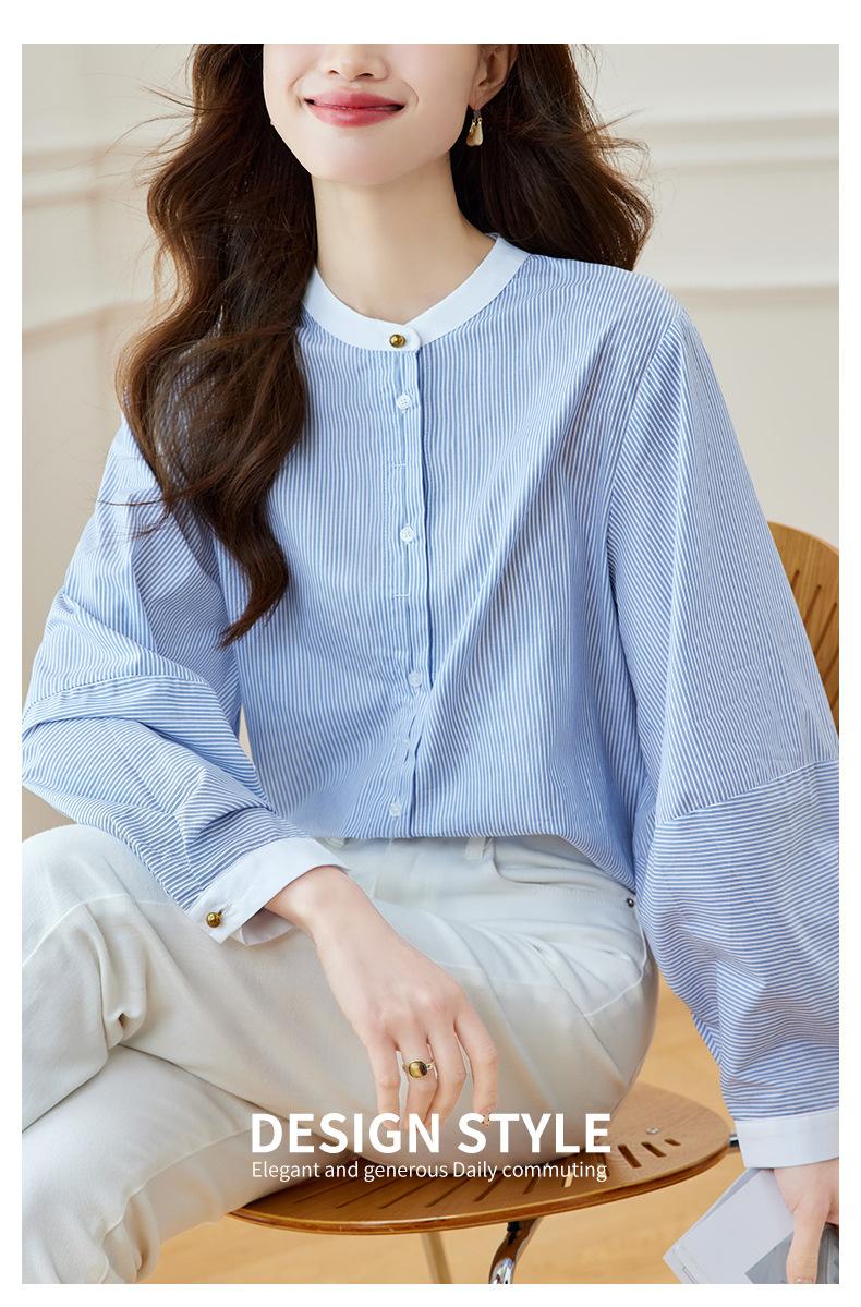 Camiseta de Cuello Redondo a Rayas Azules y Blancas Top Versátil Coreano Lazy Otoño Diseño de Moda Sentido Camisa Holgada A6150