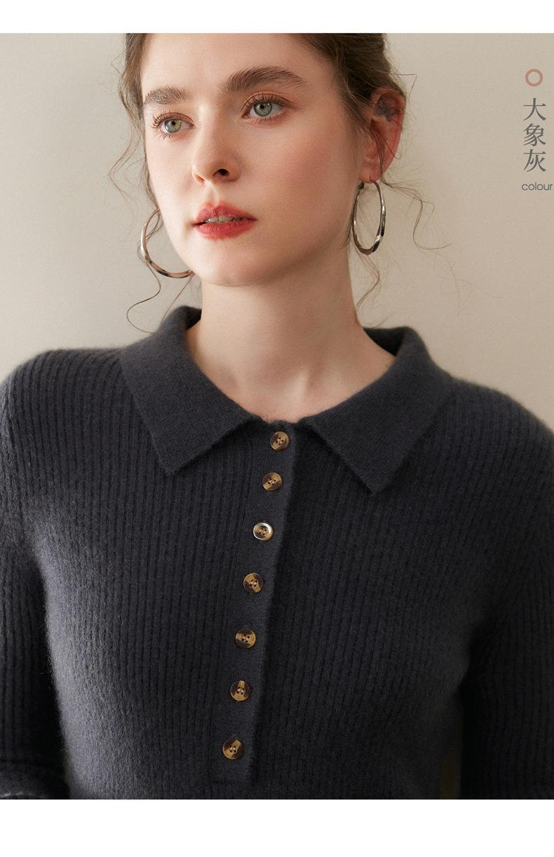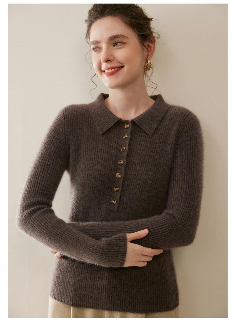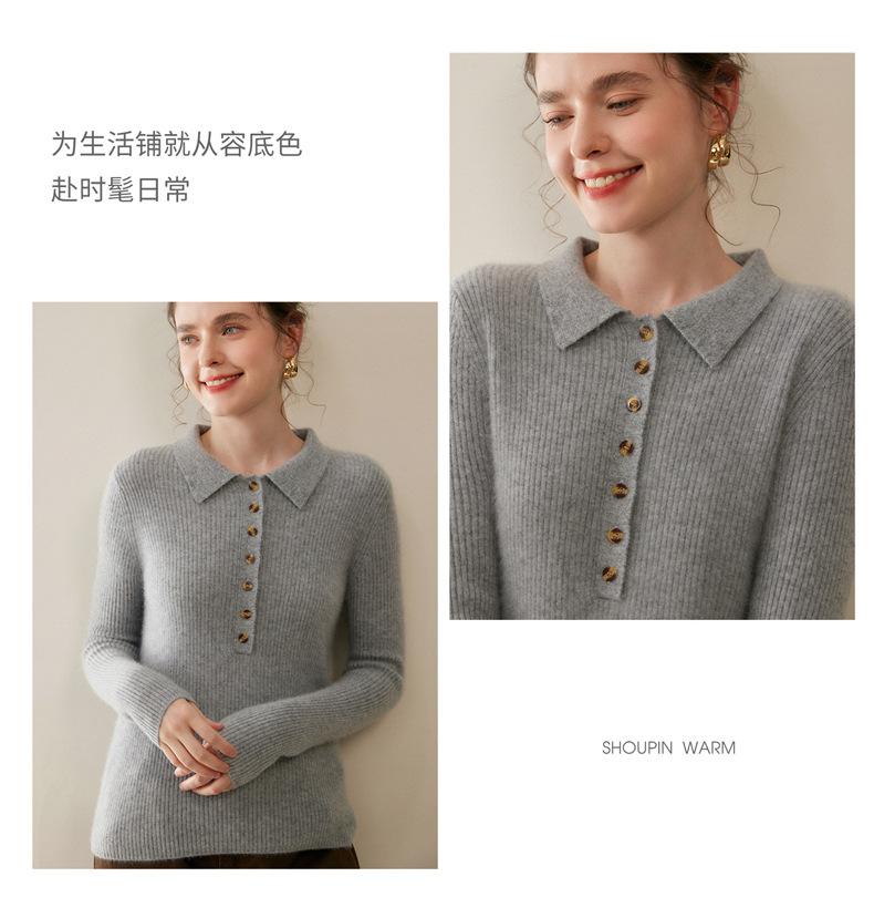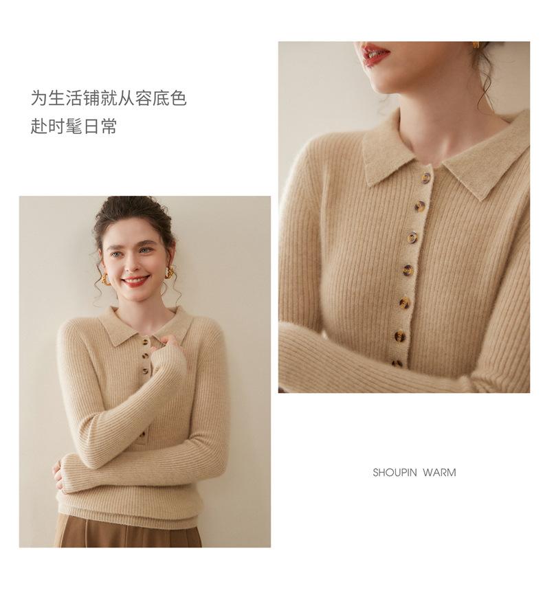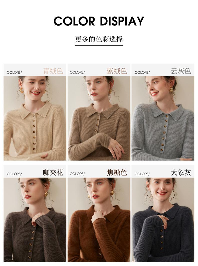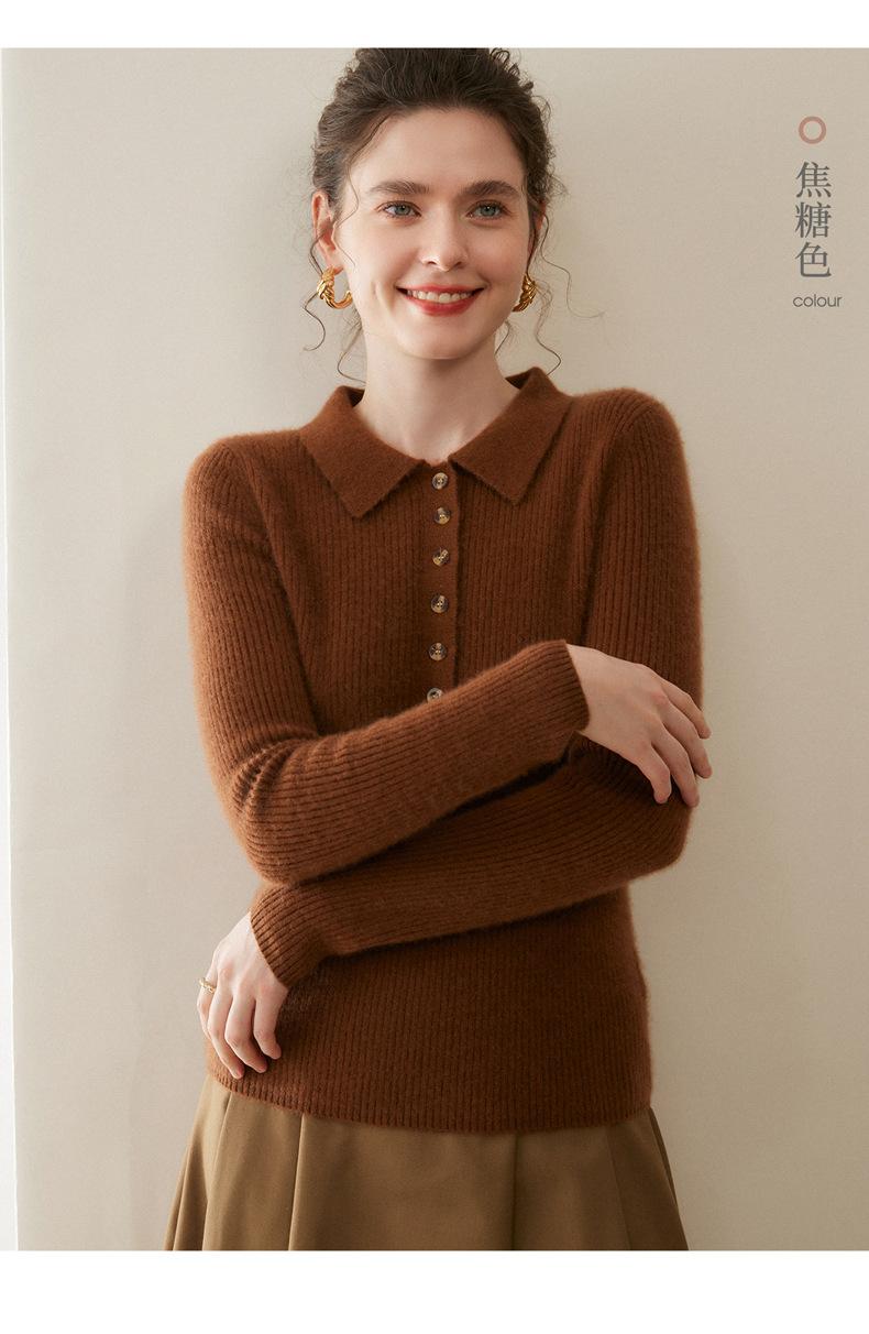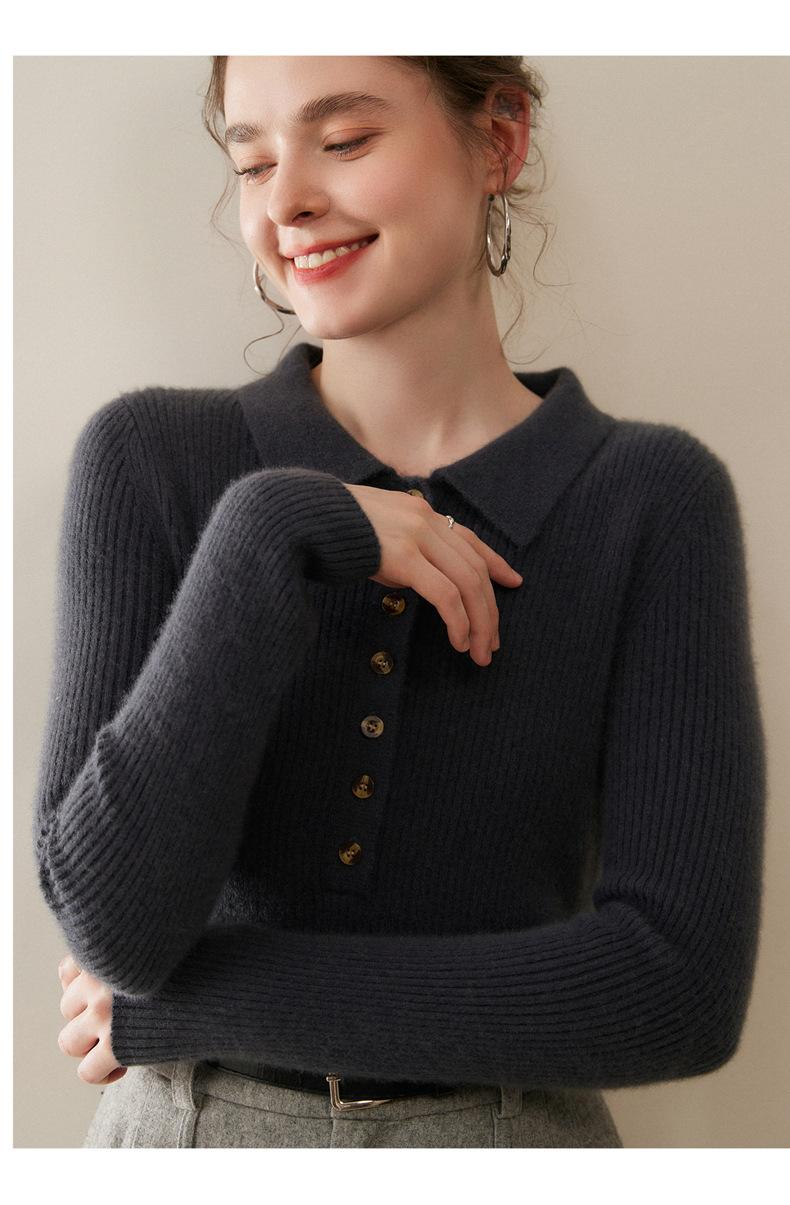 Suéter de cachemira para mujer otoño e invierno 100% cachemira temperamento nuevo estilo cuello POLO manga larga jersey corte ajustado suéter de punto