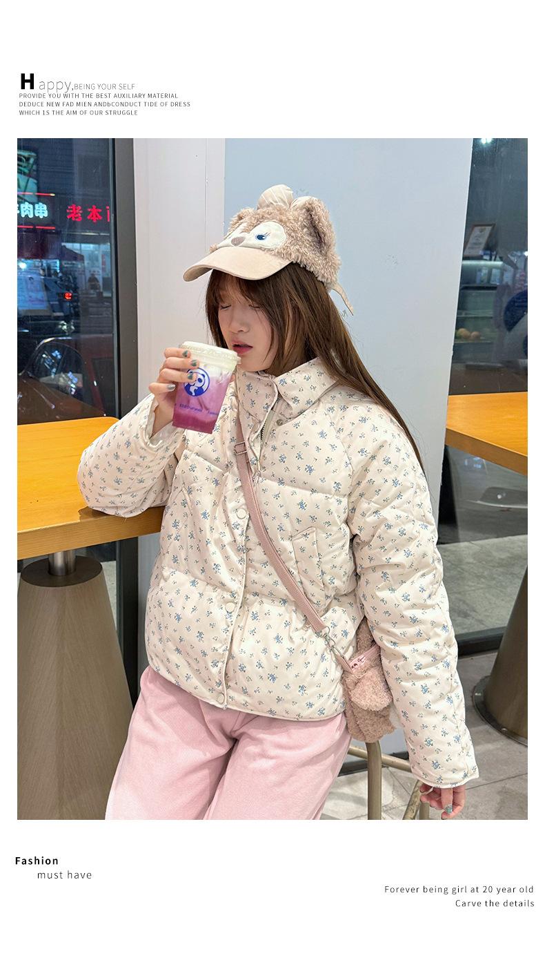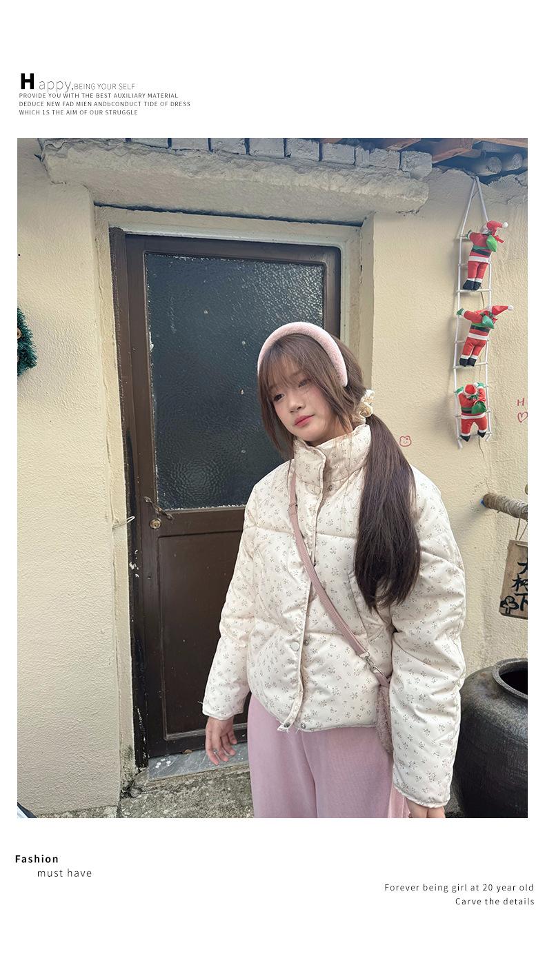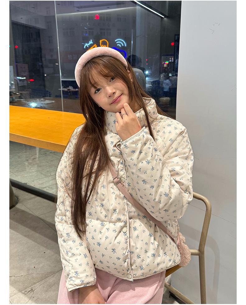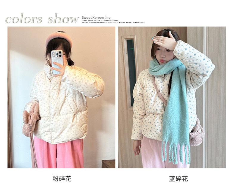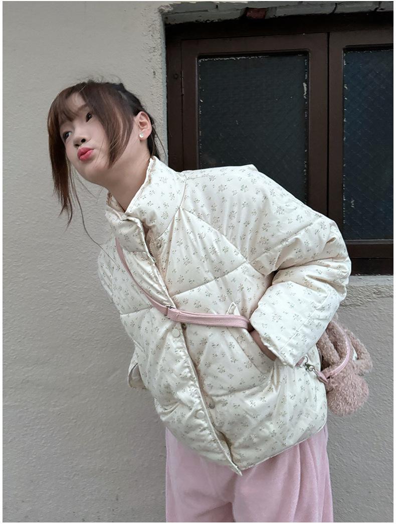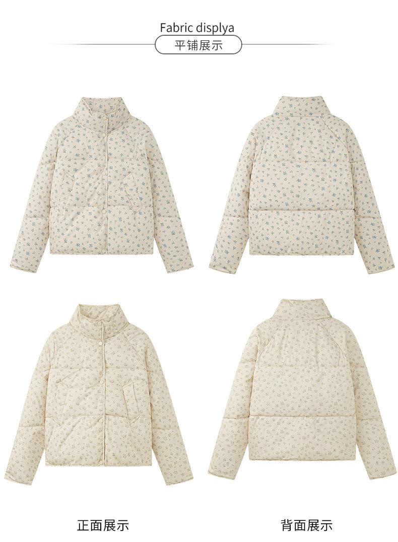 2025 Nueva Chaqueta Corta de Algodón Acolchado con Estampado Floral Invierno Nuevo Pequeño Fresco Dulce Cuello Alto Engrosado Chaqueta Acolchada Abrigo