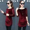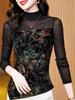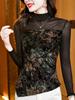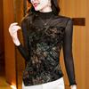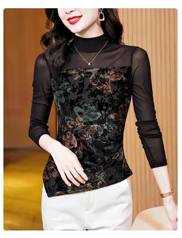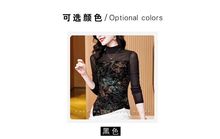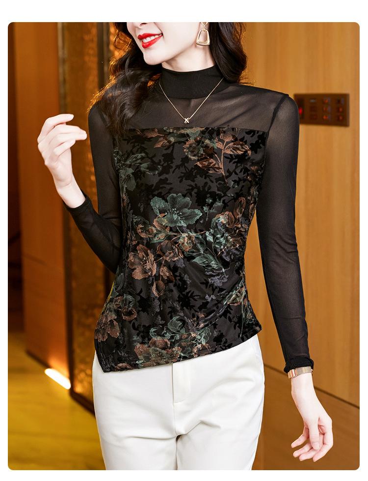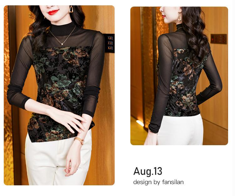 Camiseta de manga larga de terciopelo de alta gama de lujo ligero francés con malla empalmada para mujer, corte ajustado, adelgazante, camiseta básica versátil