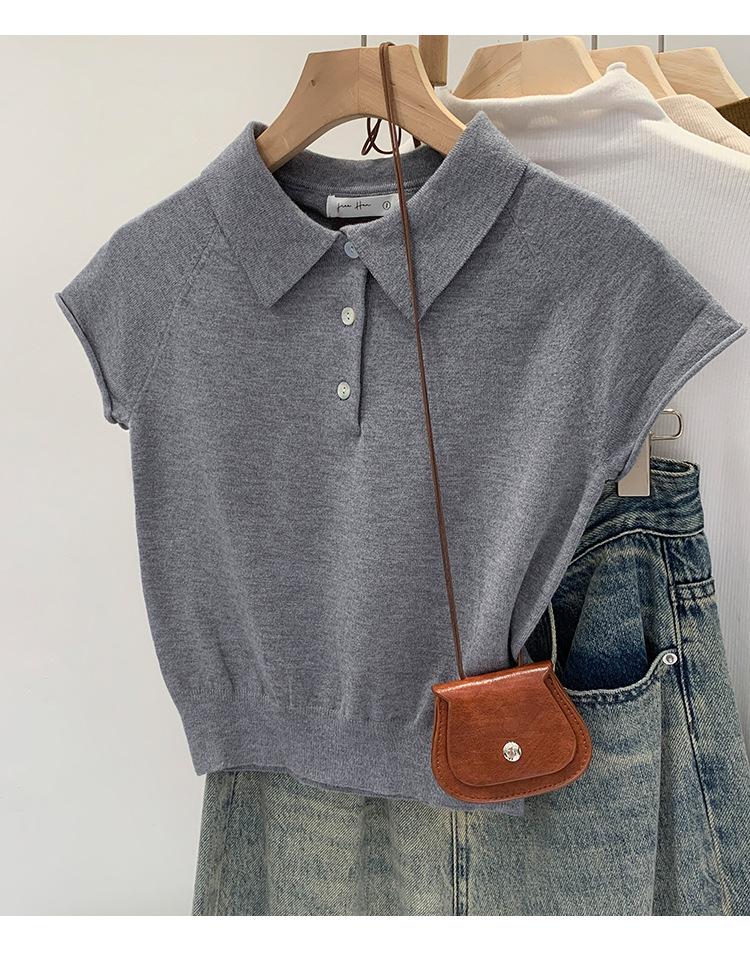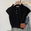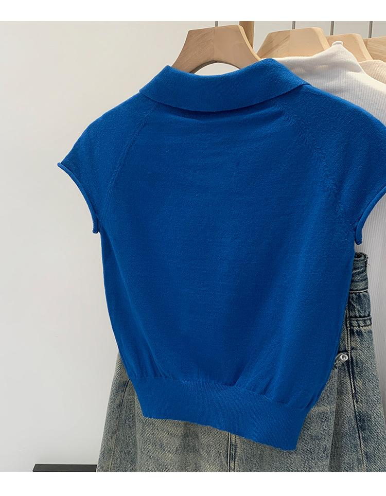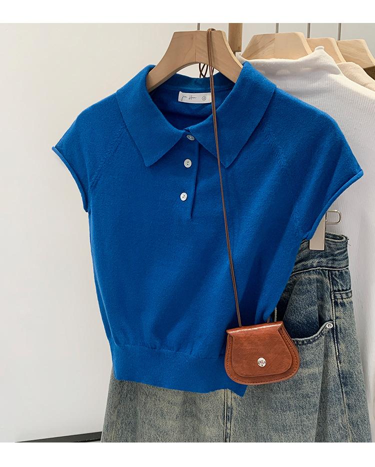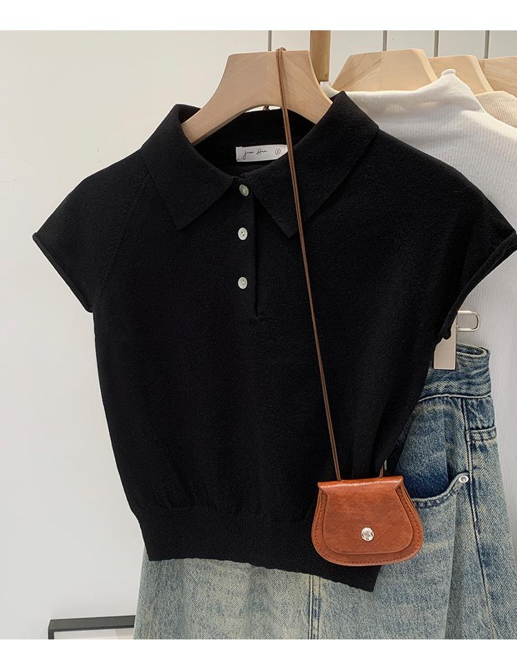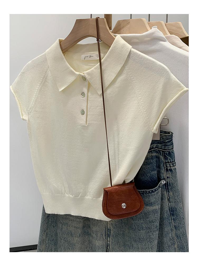 Polo de Fondo Alto con Cuello de Polo Manga Raglán Tejido de Manga Corta para Mujer Verano Abotonado Top Corto Elegante Versátil Camiseta Básica