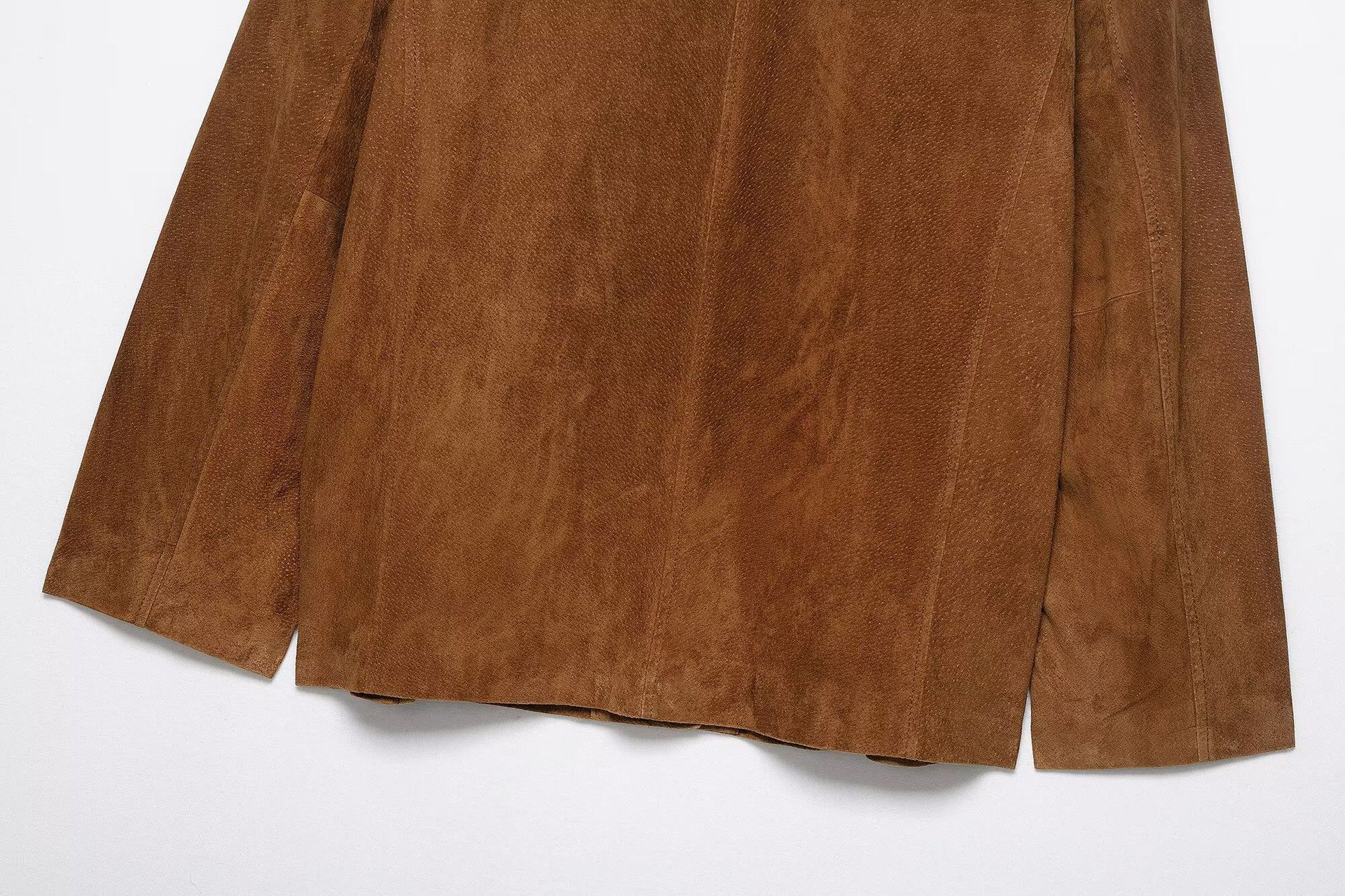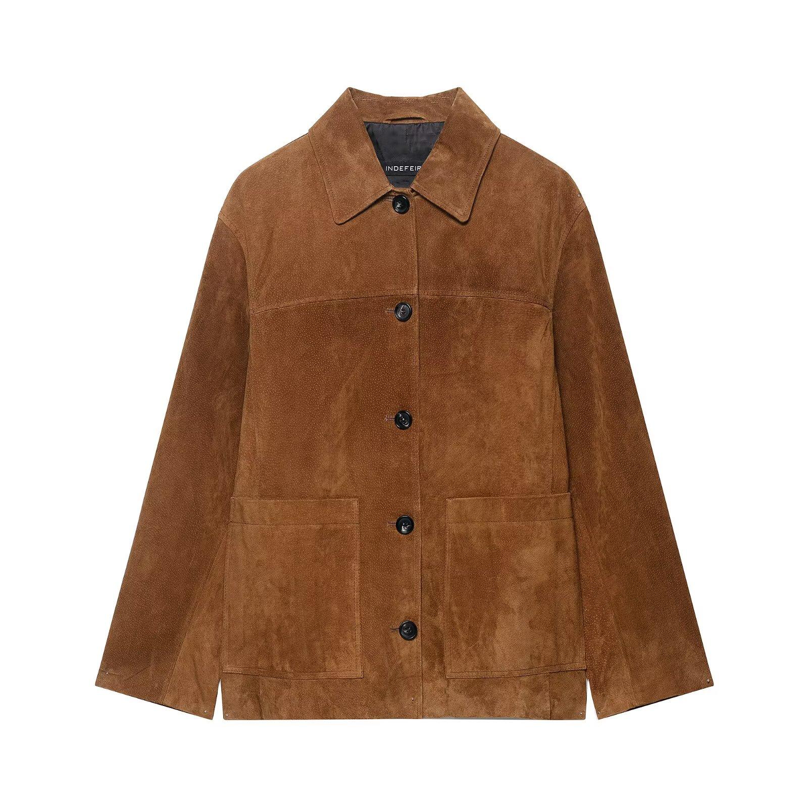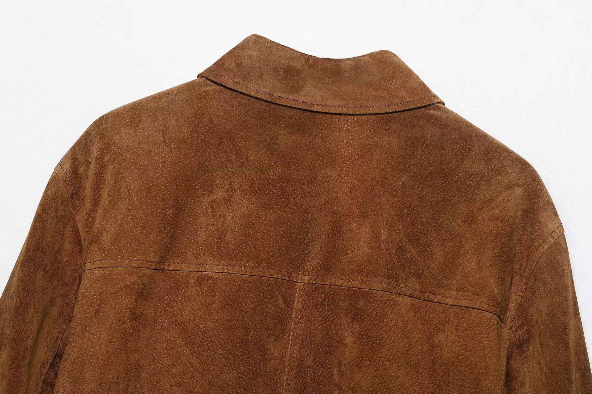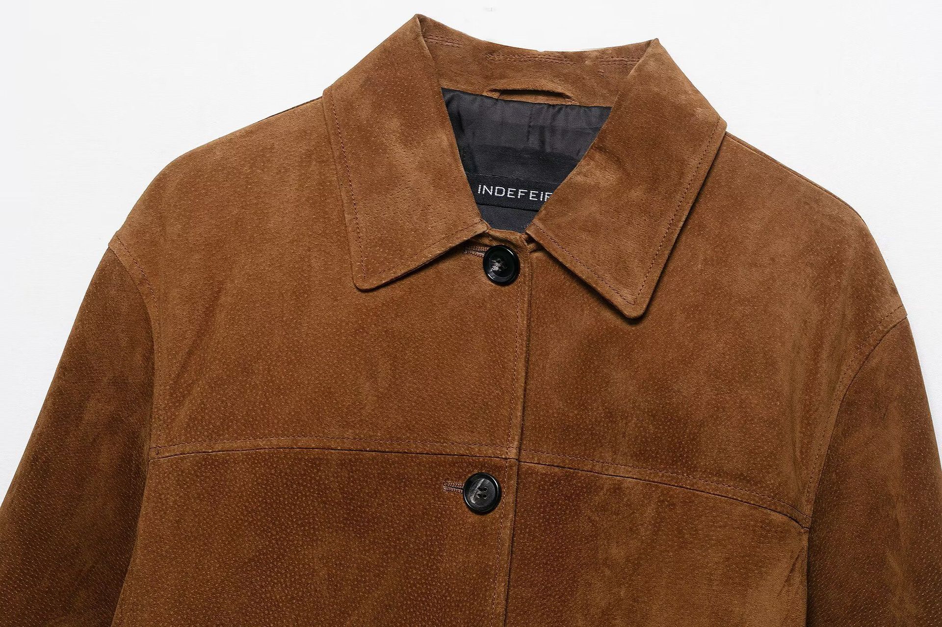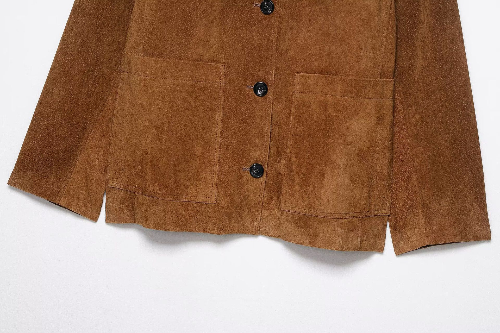 Ropa de mujer de comercio exterior transfronterizo de Amazon 2025 otoño nuevo gamuza decoración de bolsillo suelto casual solapa abrigo de manga larga