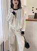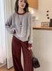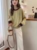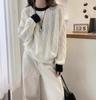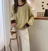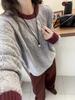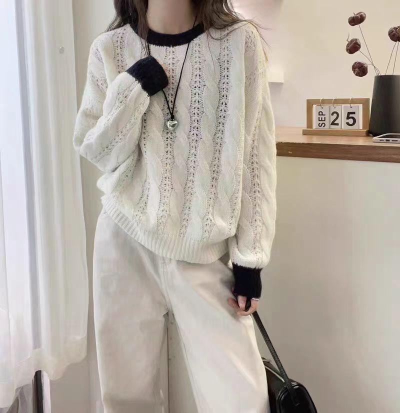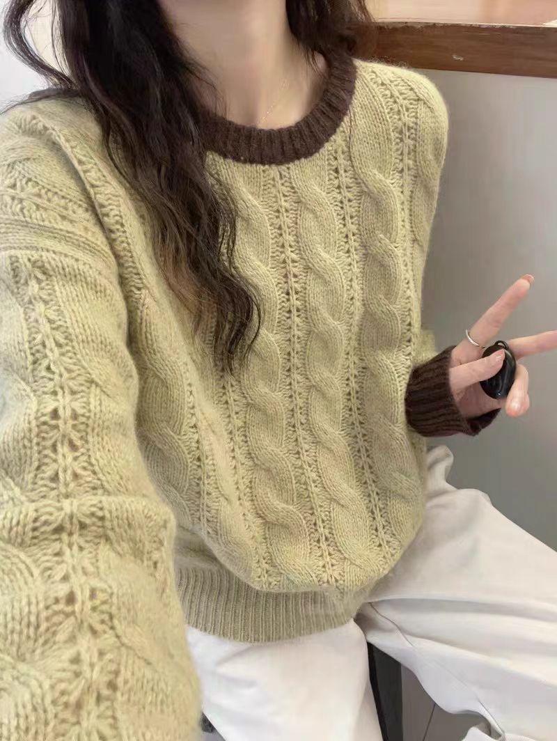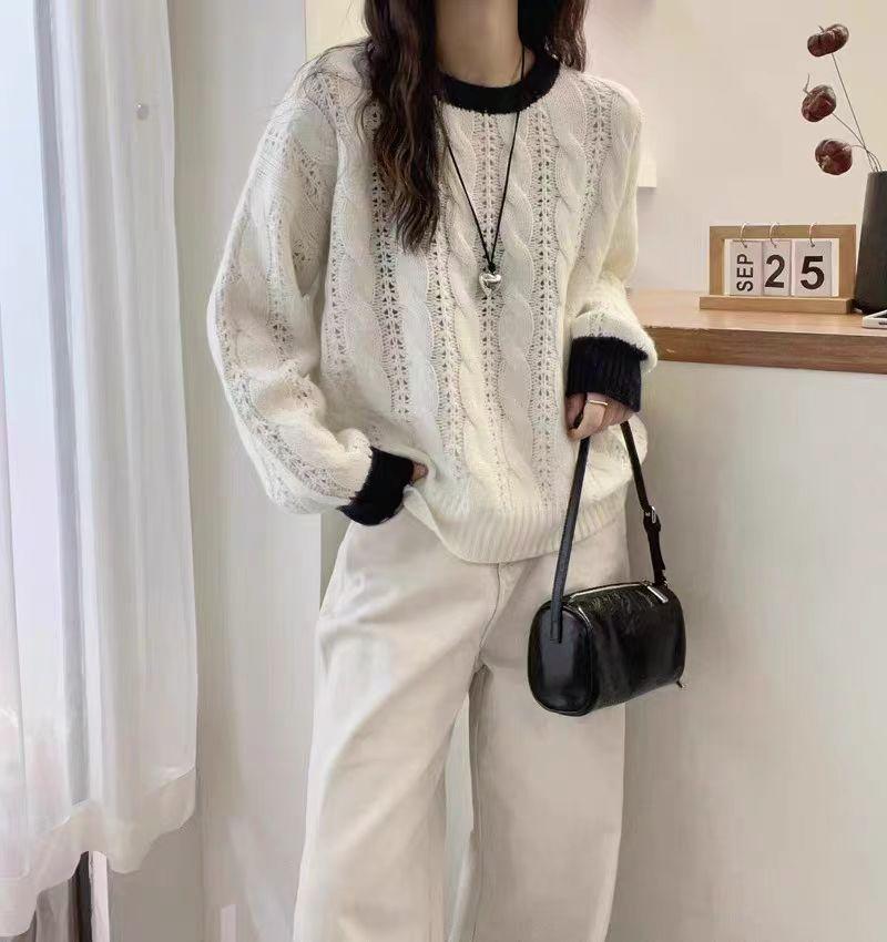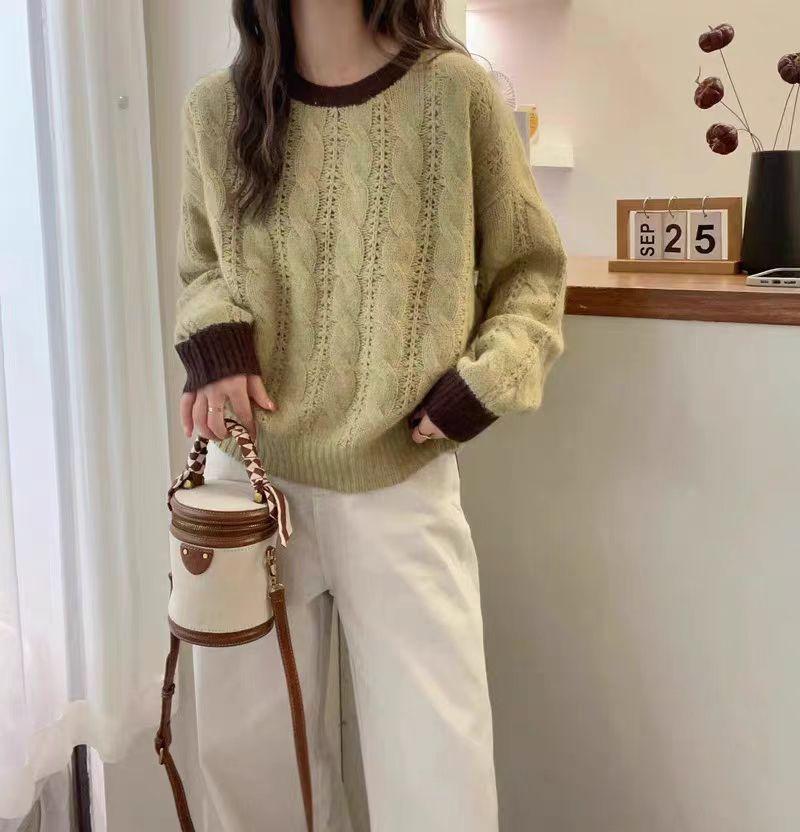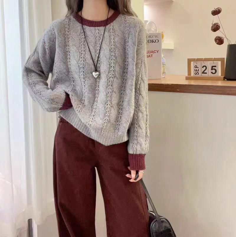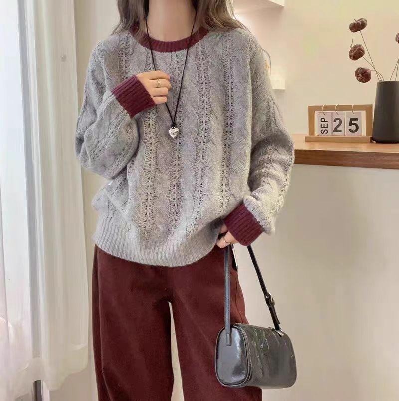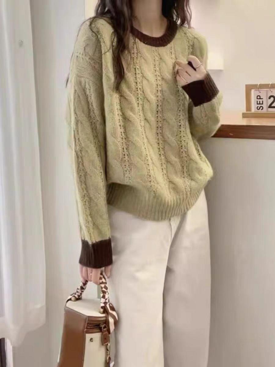 Nuevo Suéter de Punto de Lana para Mujer Cuello Redondo Calado Suelto Color Block Punto Cable Tejido Coreano Estilo Perezoso