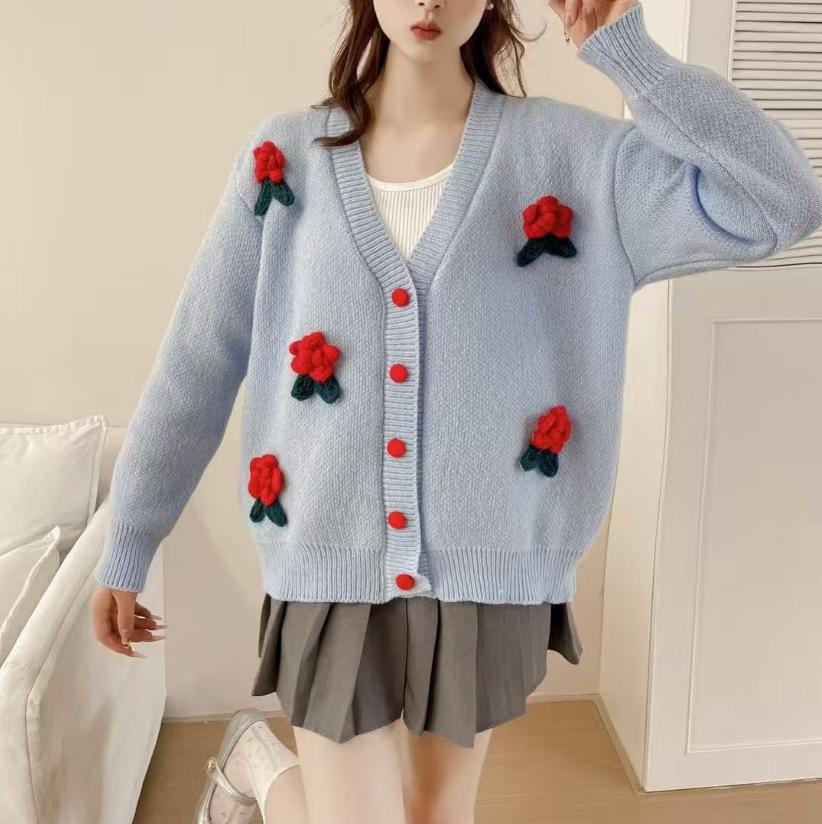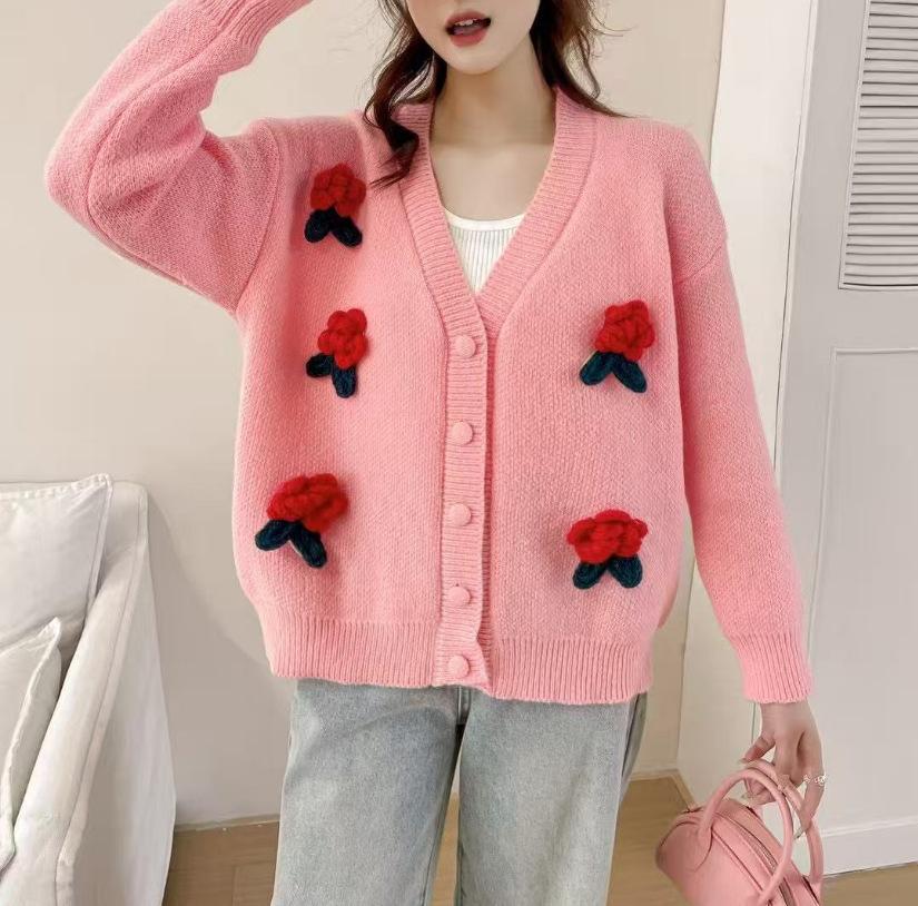 Cárdigan de Punto Estilo Holgazán Europeo y Americano Abrigo para Mujer Otoño e Invierno Nuevo Diseño Suelto Sentido Suéter de Flores Abrigo Top