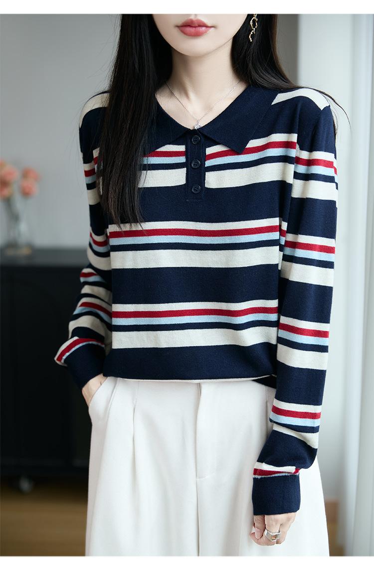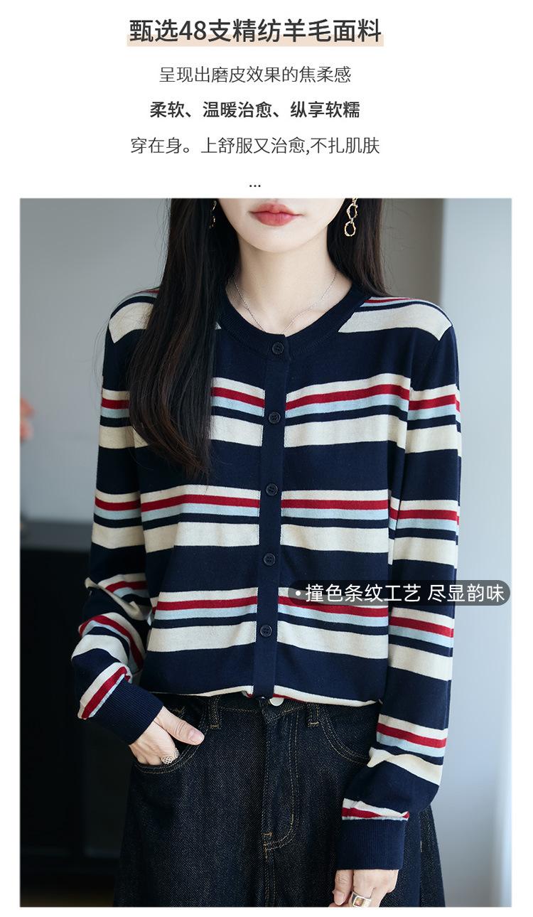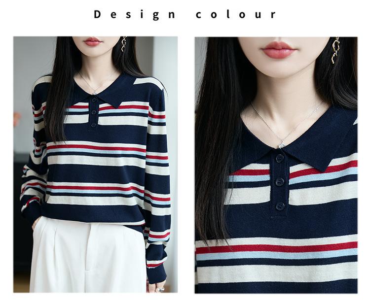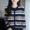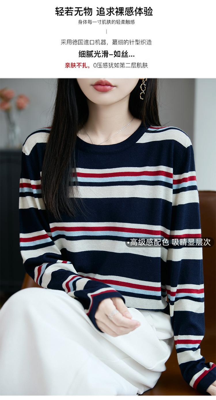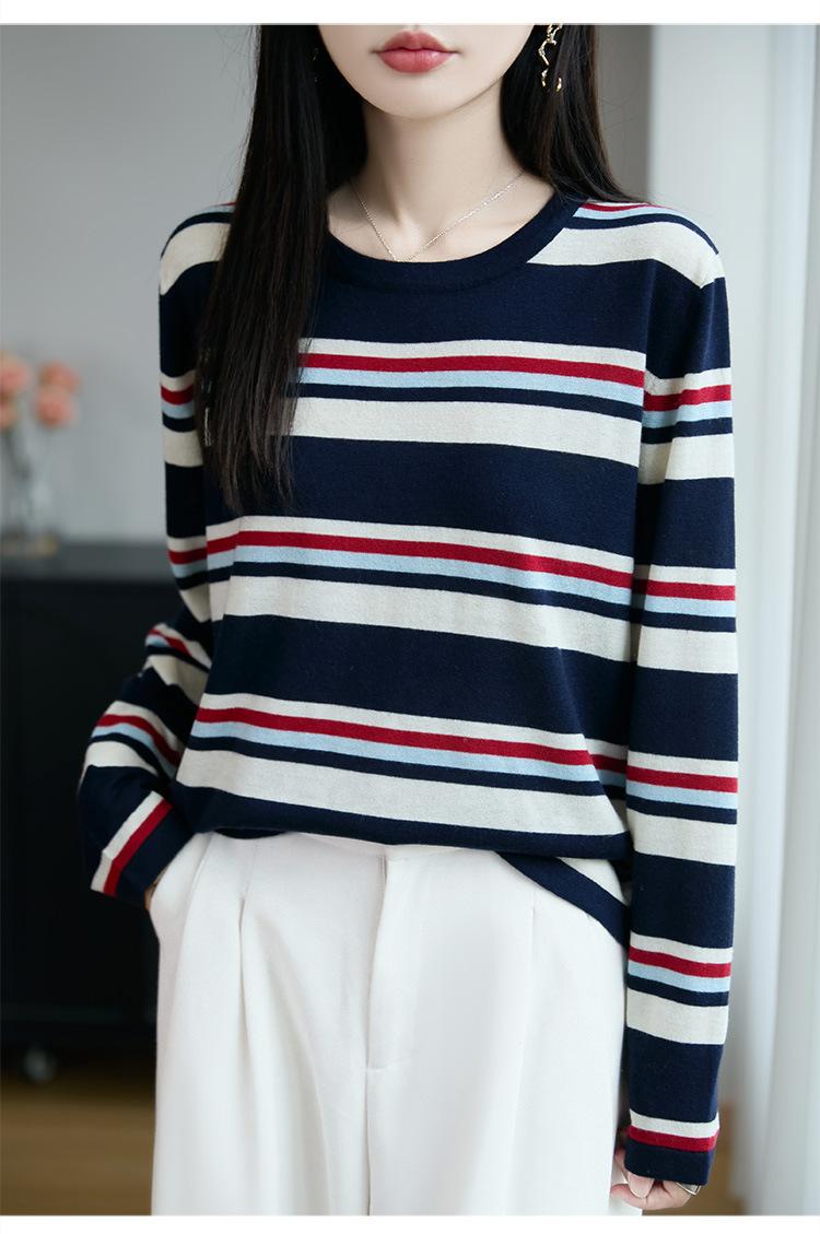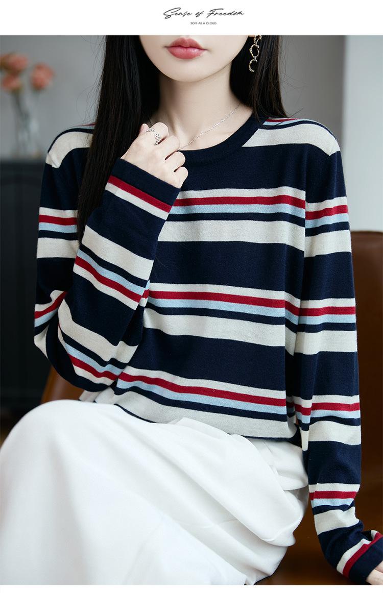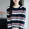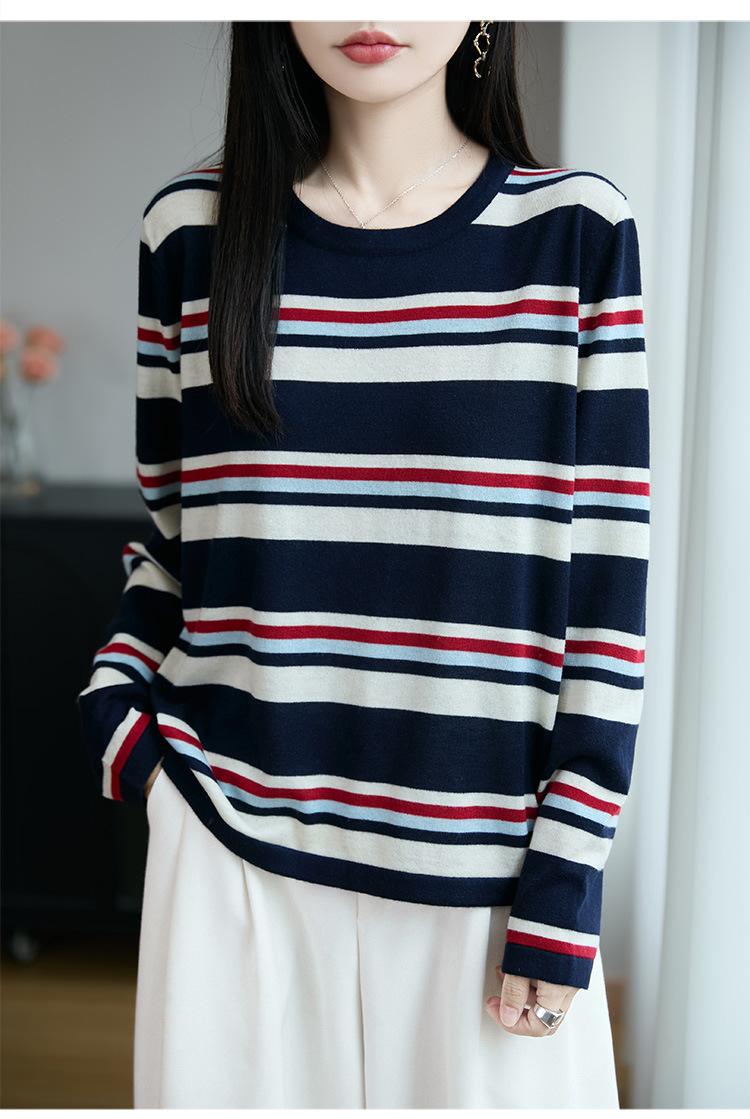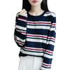 Suéter de Punto de Lana Merino Fina de Otoño Temprano 2025 Cuello Redondo Manga Larga para Mujer Bloque de Color Rayado Suelto Jersey Capa Base