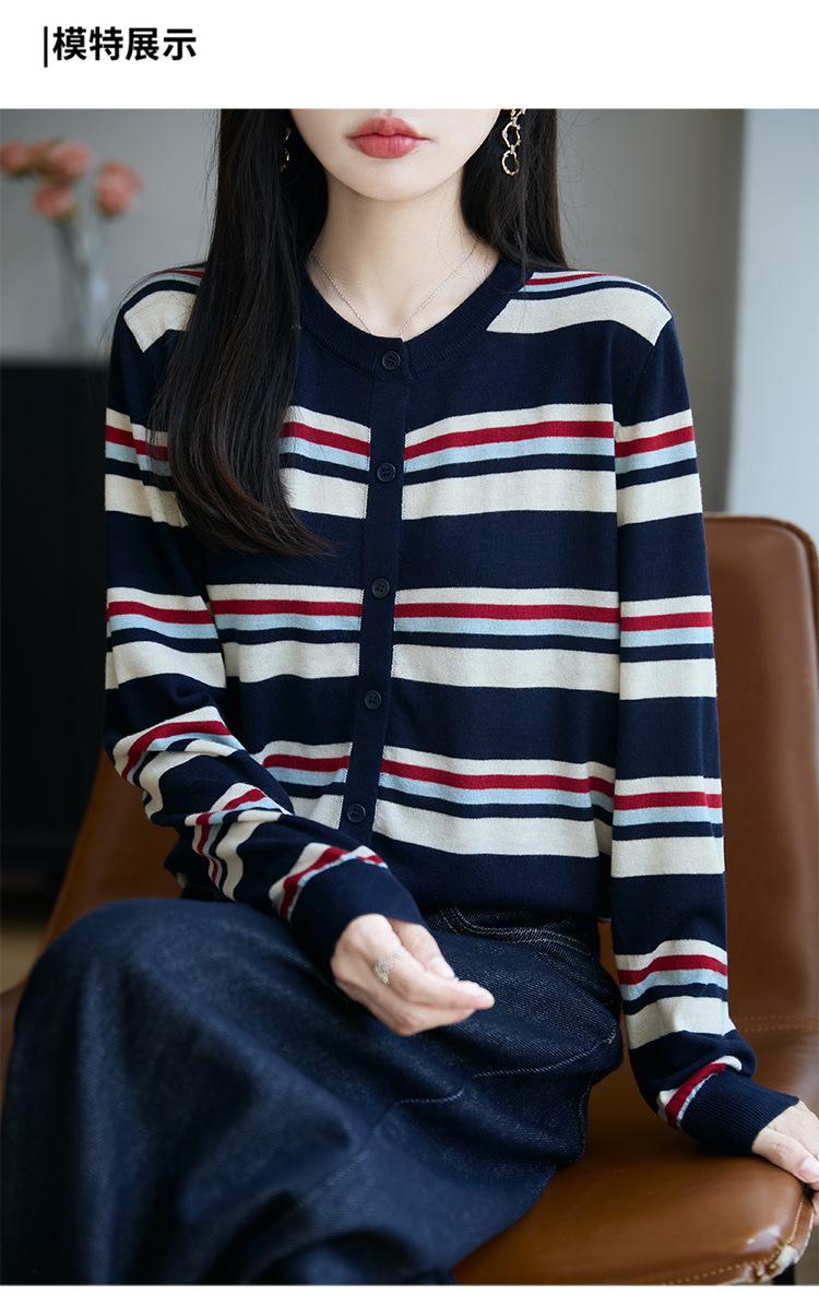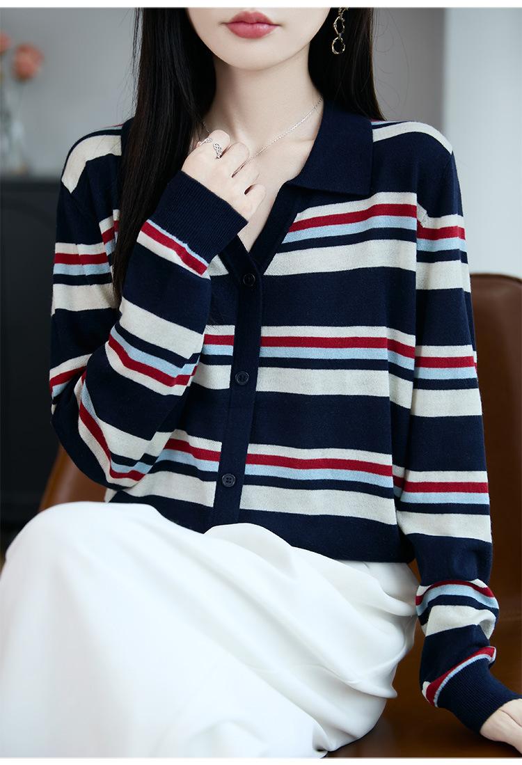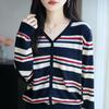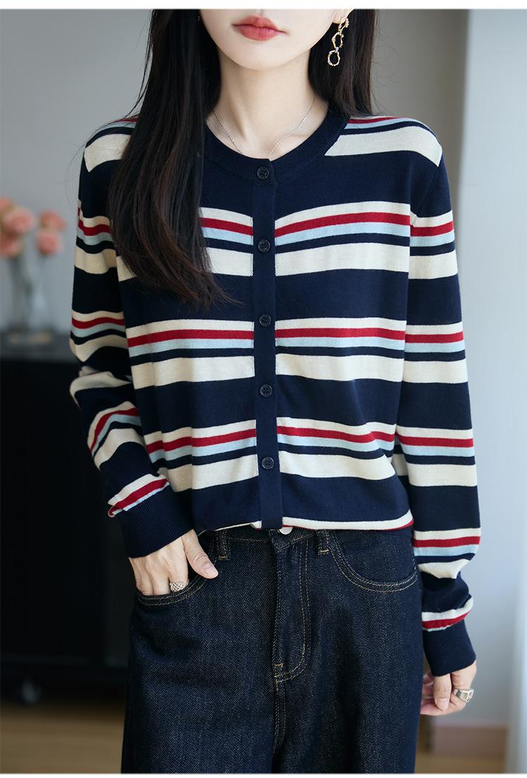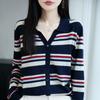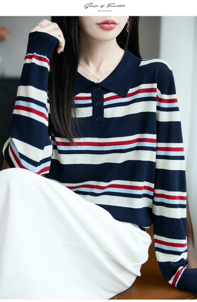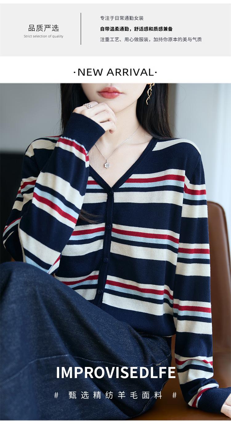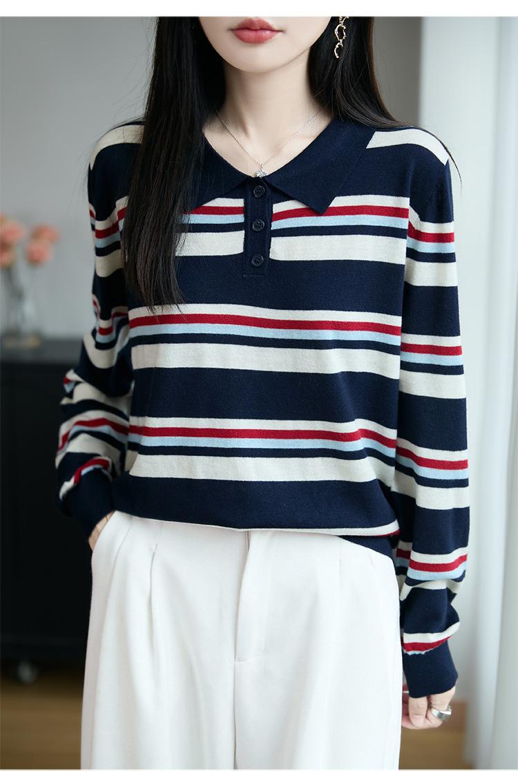 Suéter de Punto de Lana Merino Fina de Otoño Temprano 2025 Cuello Redondo Manga Larga para Mujer Bloque de Color Rayado Suelto Jersey Capa Base