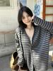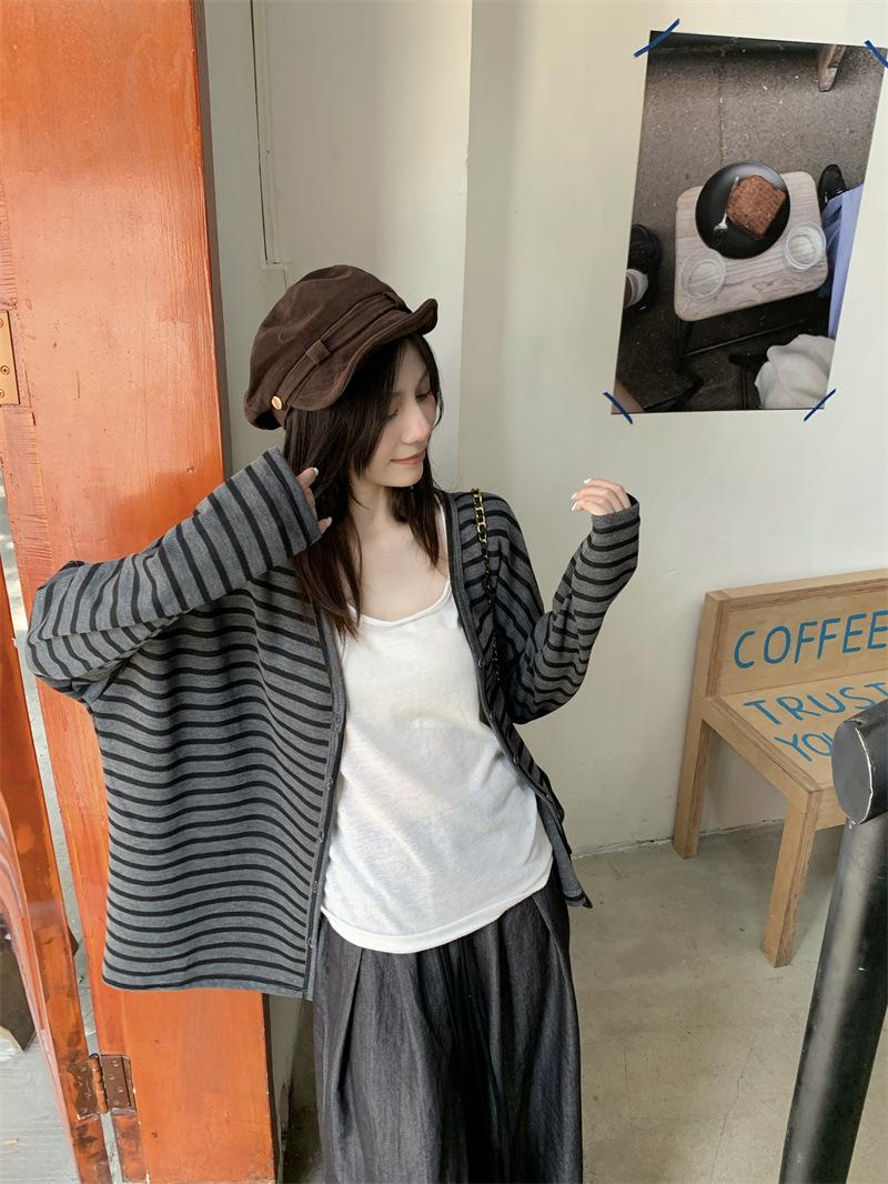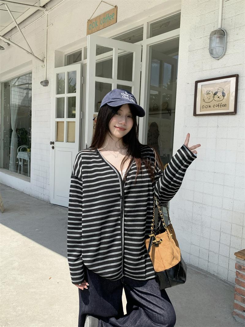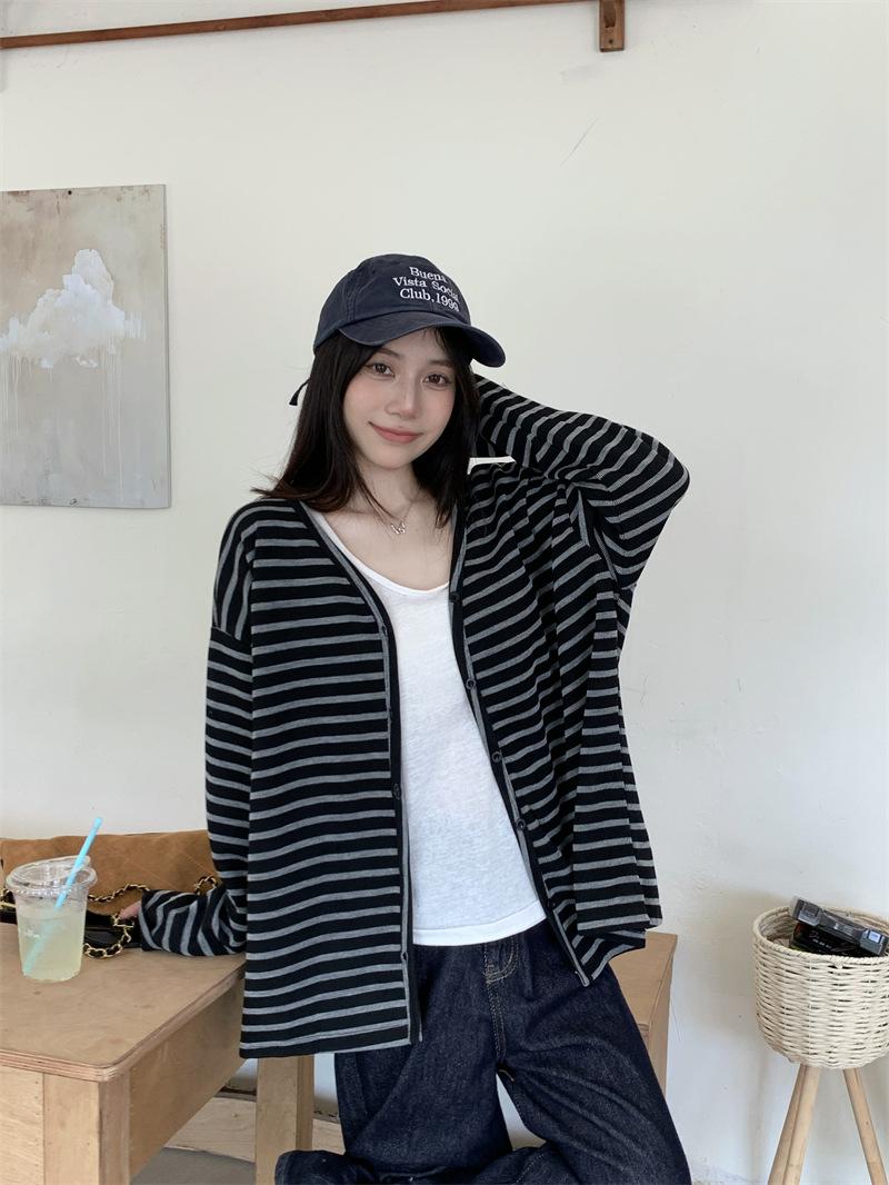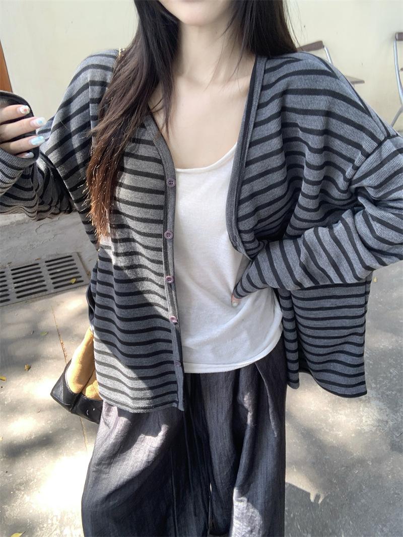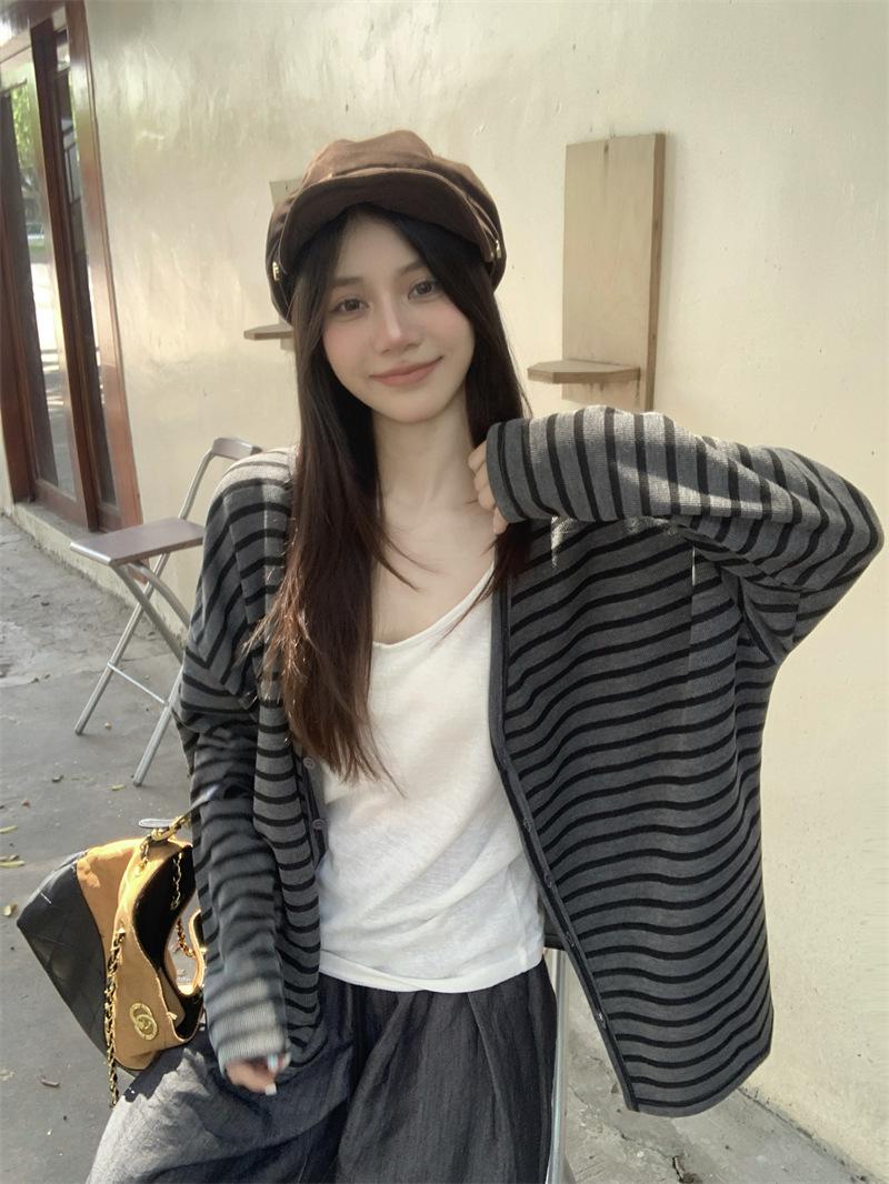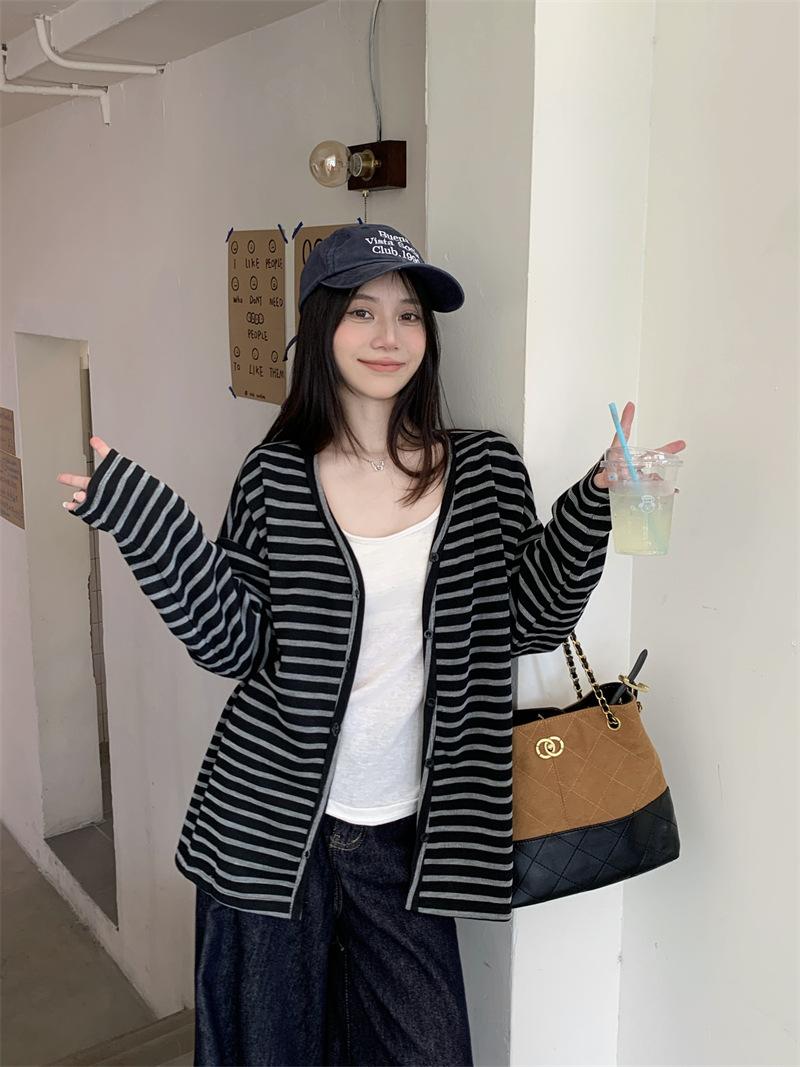 Foto Real Otoño 2025 Cárdigan de Punto Versátil a Rayas con Cuello en V Estilo Perezoso para Mujer Top de Estilo Coreano para Mujer