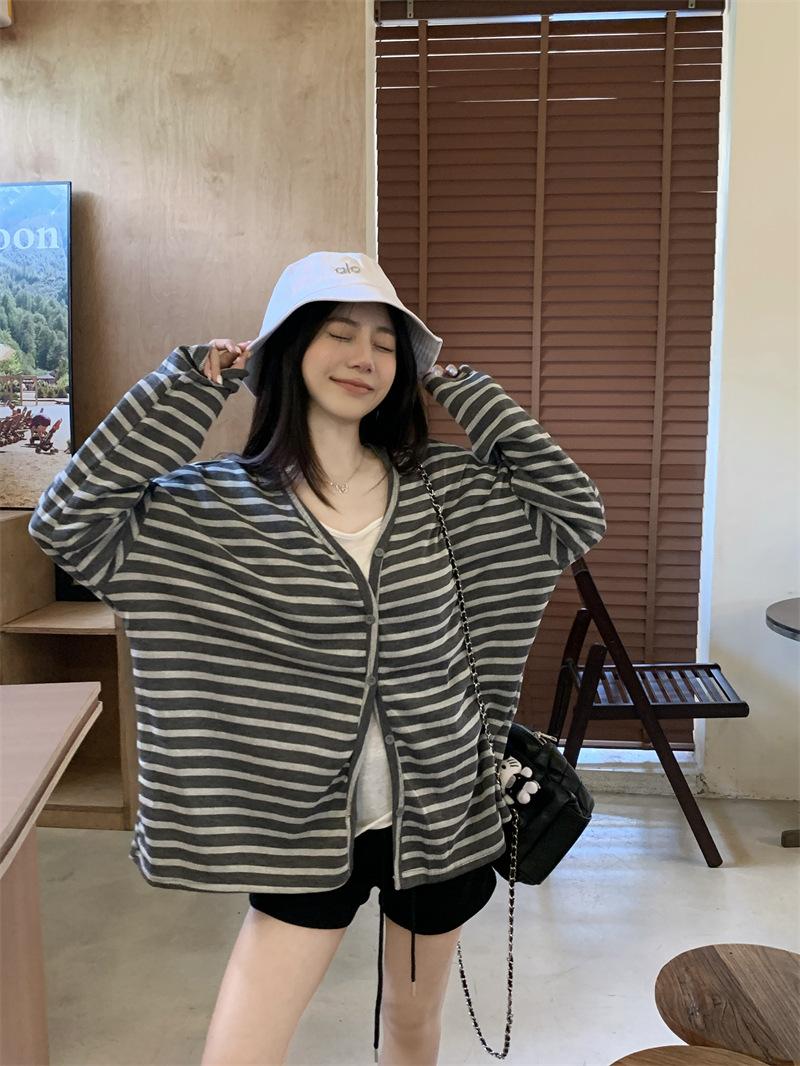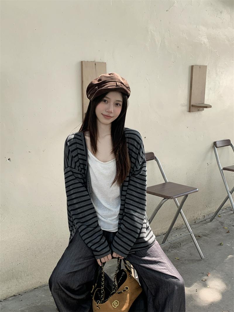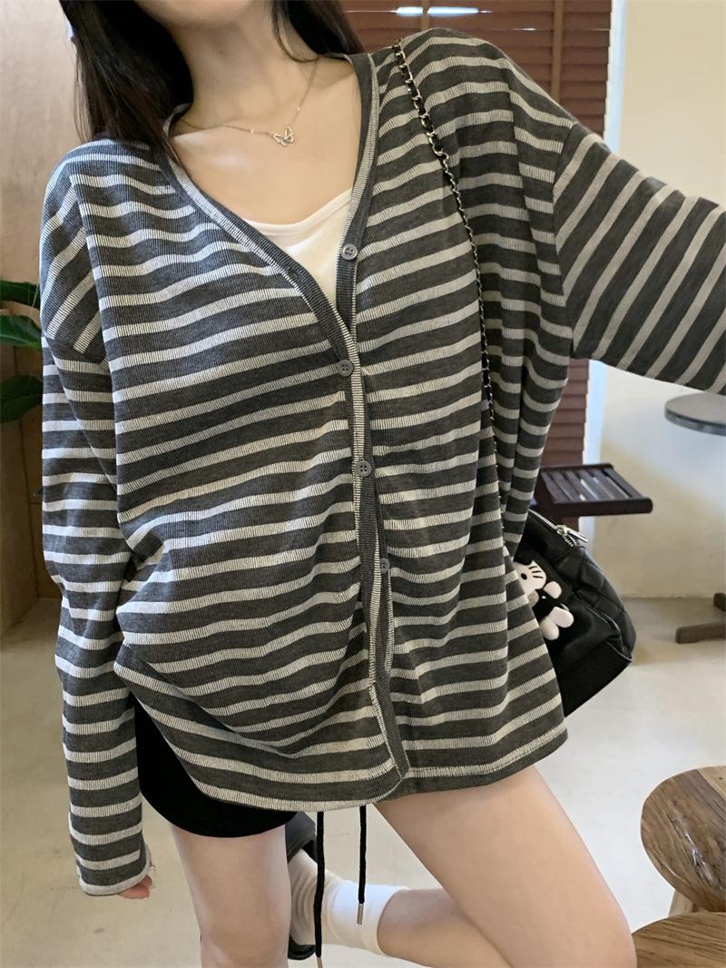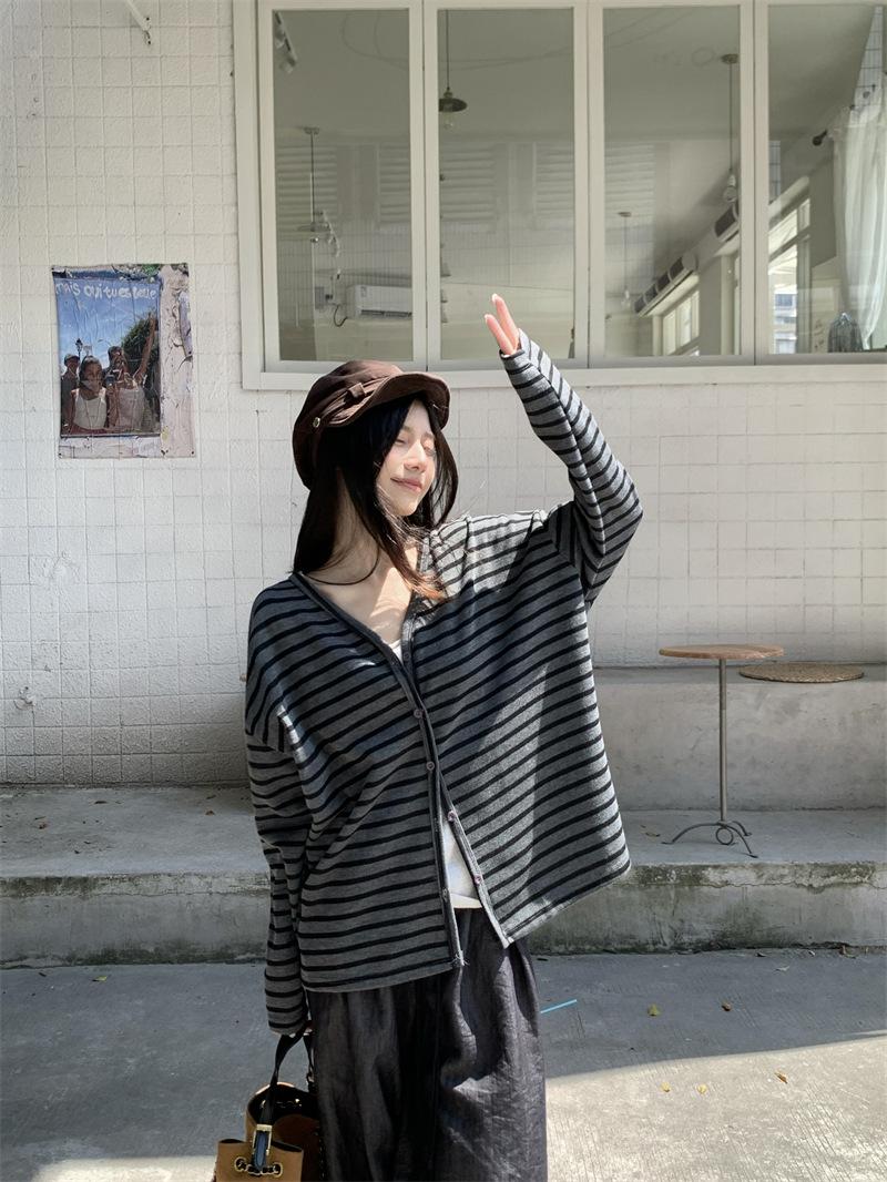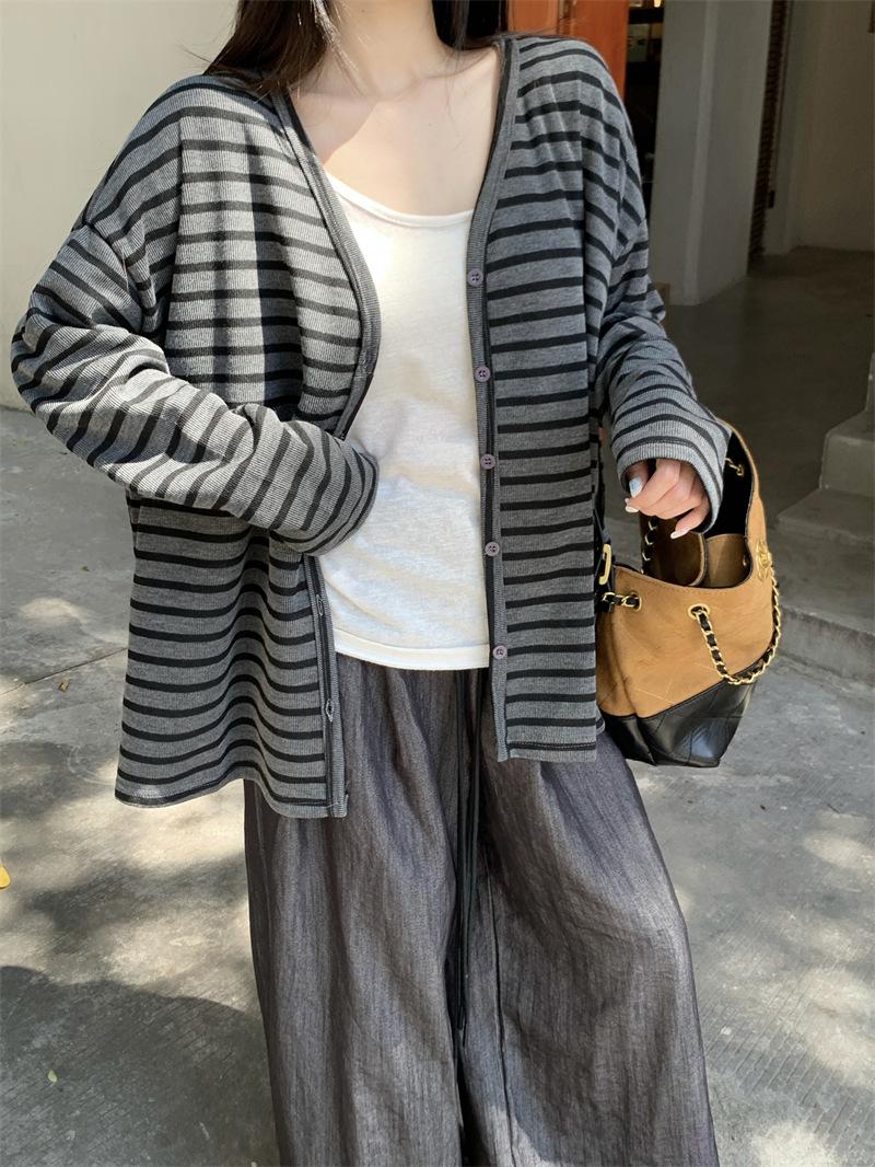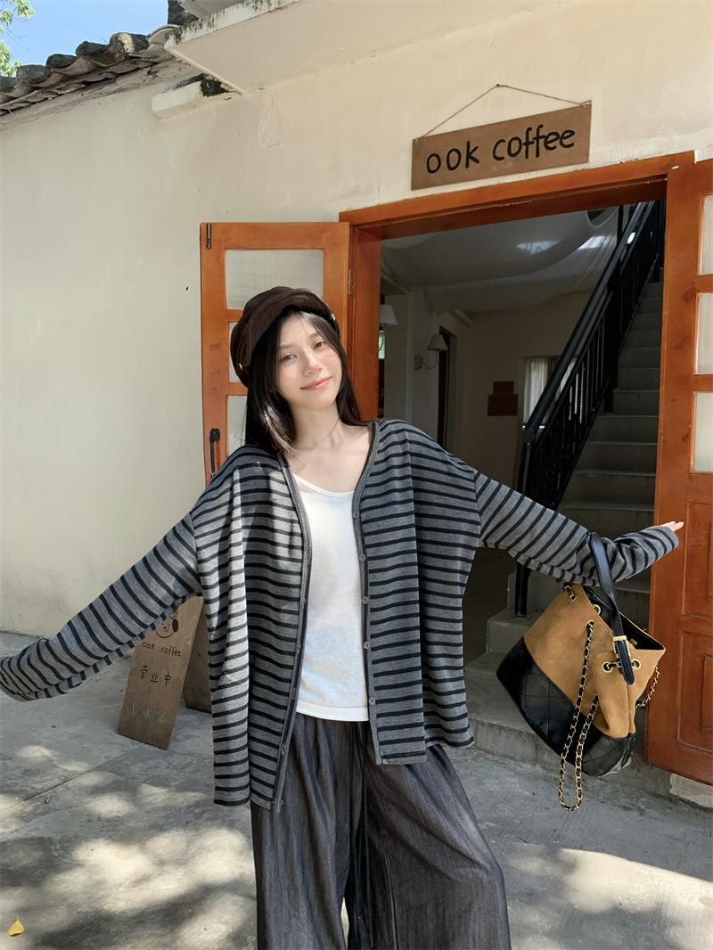 Foto Real Otoño 2025 Cárdigan de Punto Versátil a Rayas con Cuello en V Estilo Perezoso para Mujer Top de Estilo Coreano para Mujer