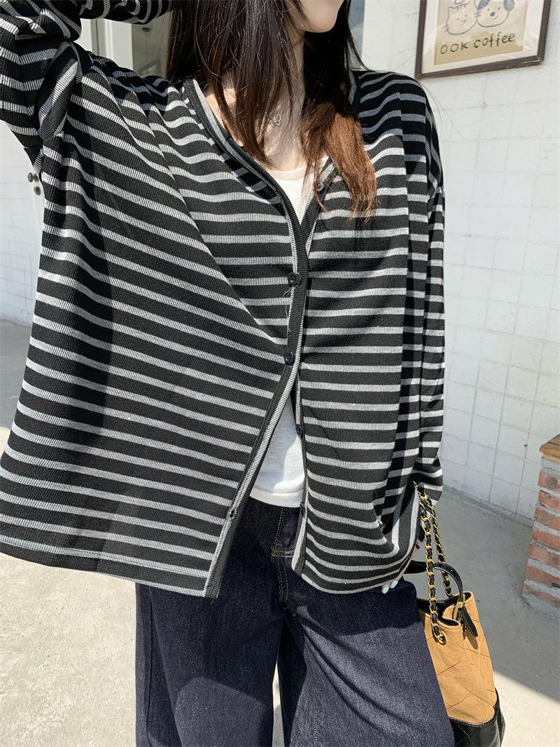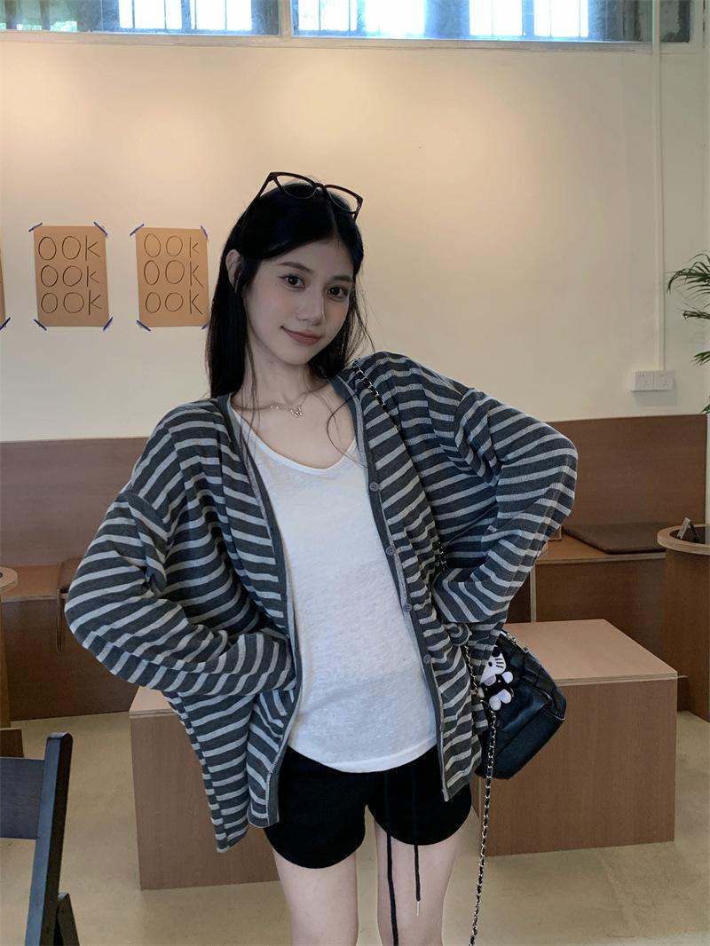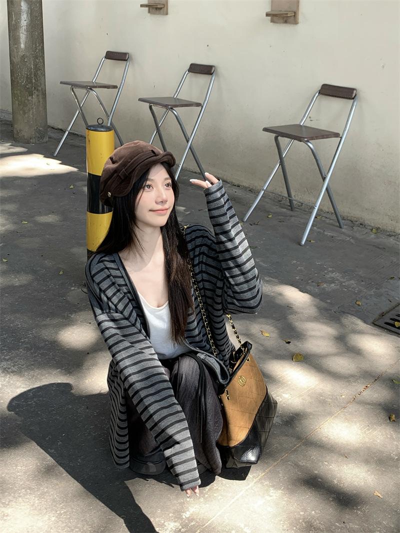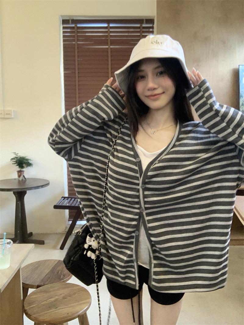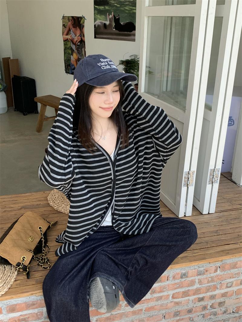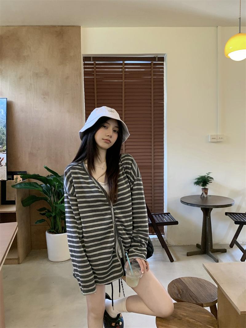 Foto Real Otoño 2025 Cárdigan de Punto Versátil a Rayas con Cuello en V Estilo Perezoso para Mujer Top de Estilo Coreano para Mujer
