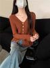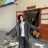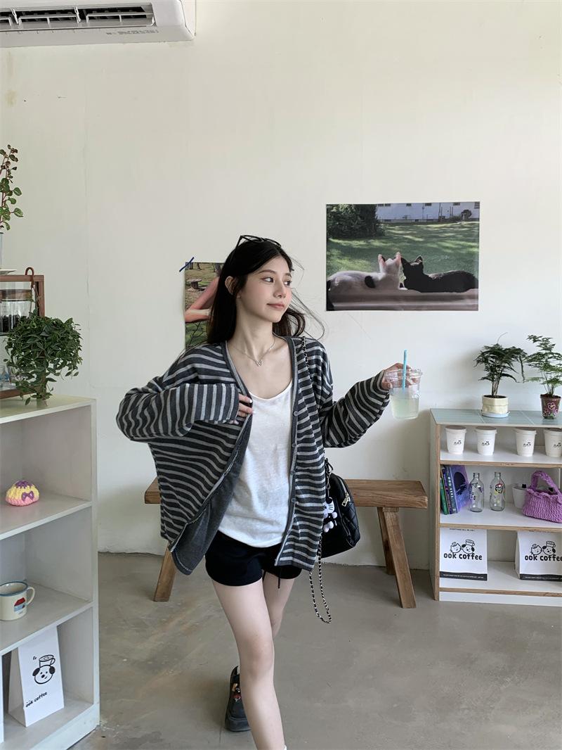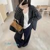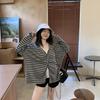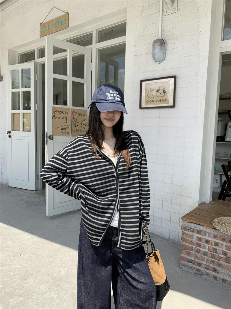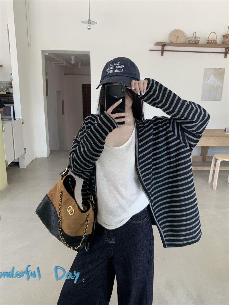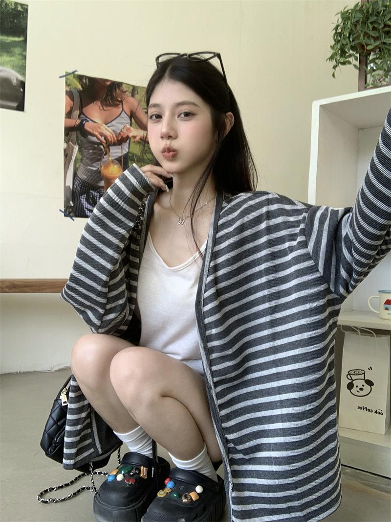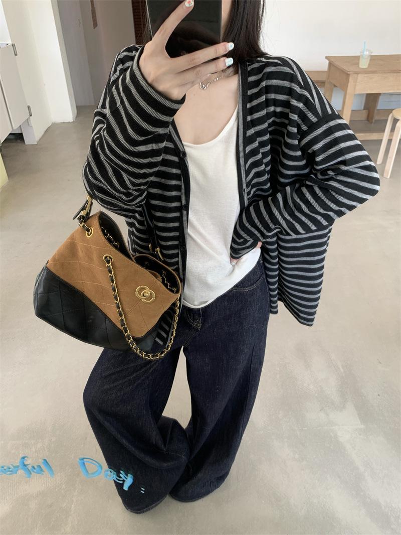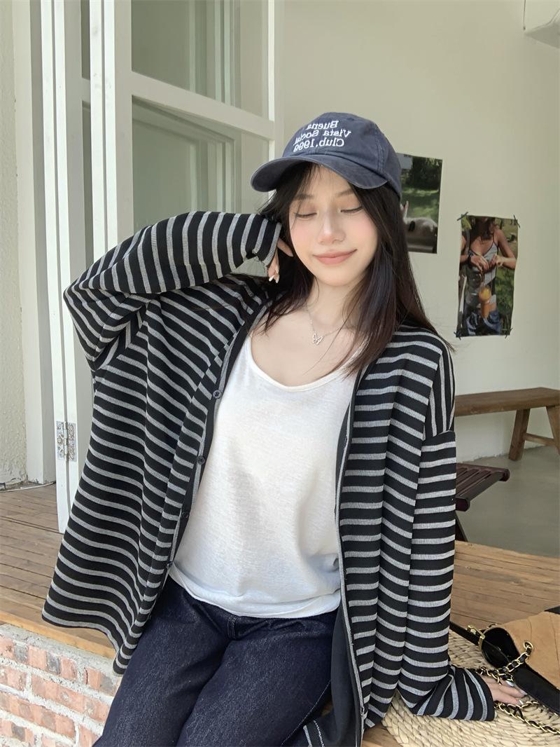 Foto Real Otoño 2025 Cárdigan de Punto Versátil a Rayas con Cuello en V Estilo Perezoso para Mujer Top de Estilo Coreano para Mujer
