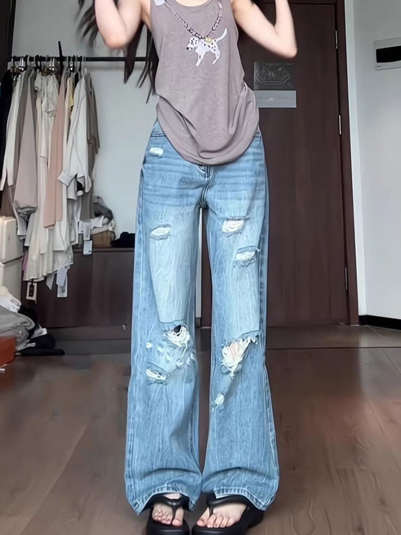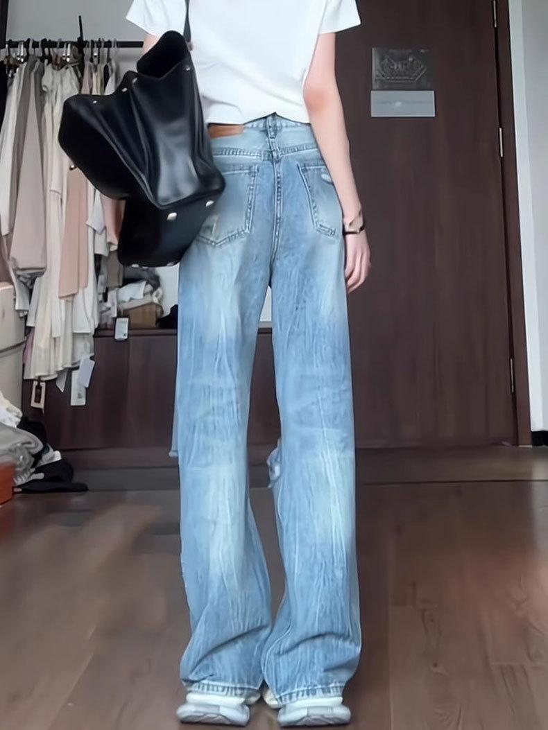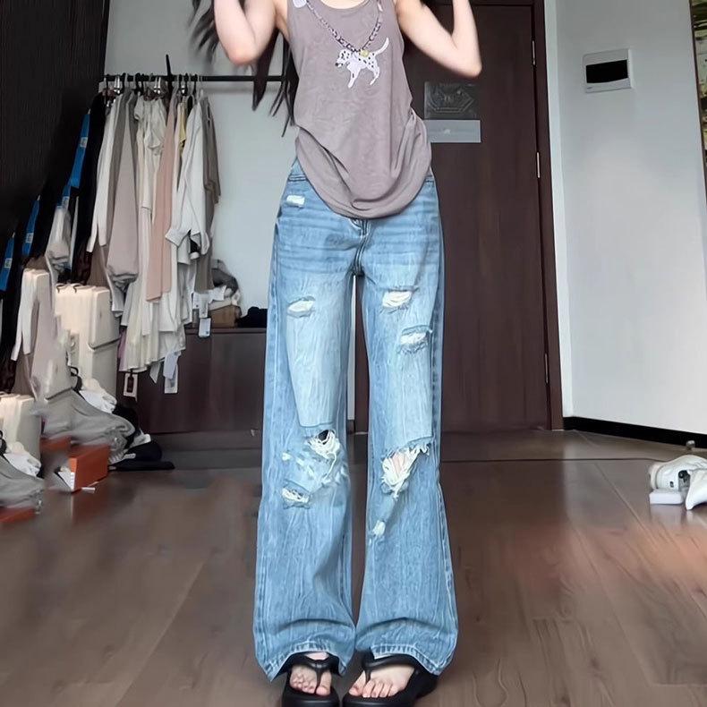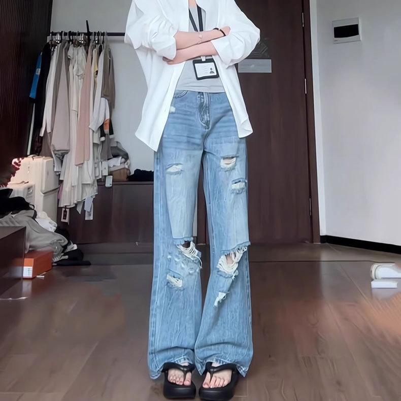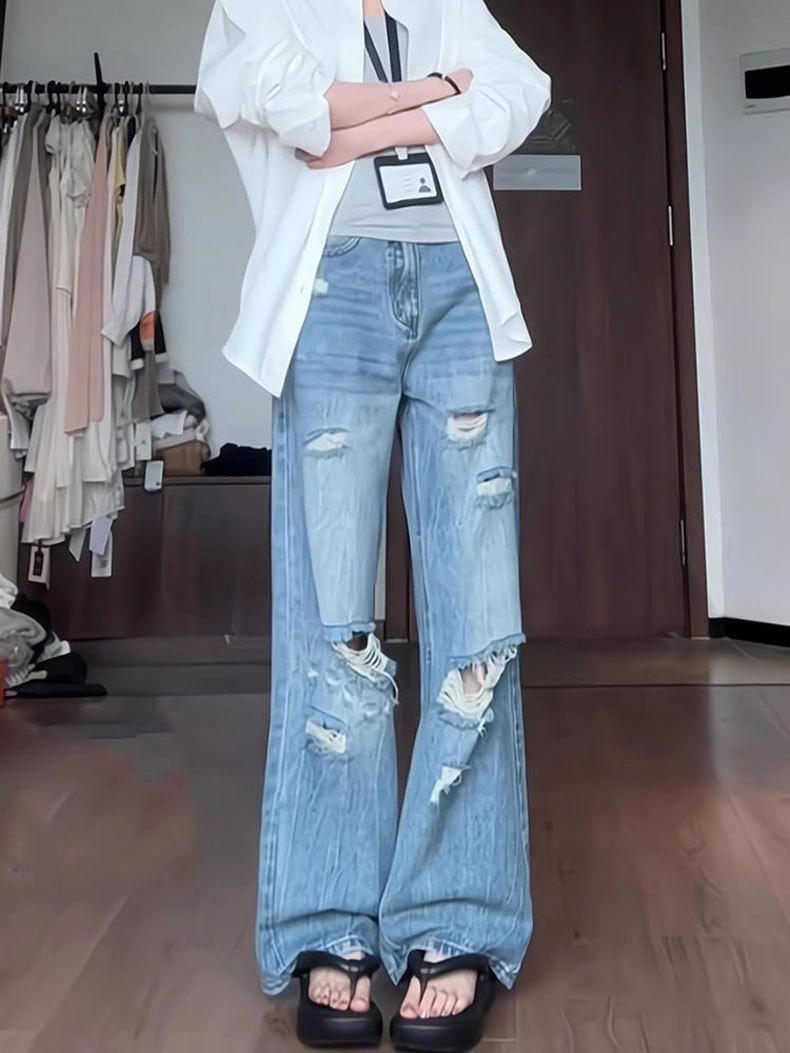 Jeans Azules Rotos de Pierna Recta para Mujer Otoño 2025 Nuevo Cuerpo en Forma de Pera Americano Cintura Alta Adelgazantes Pantalones de Pierna Ancha