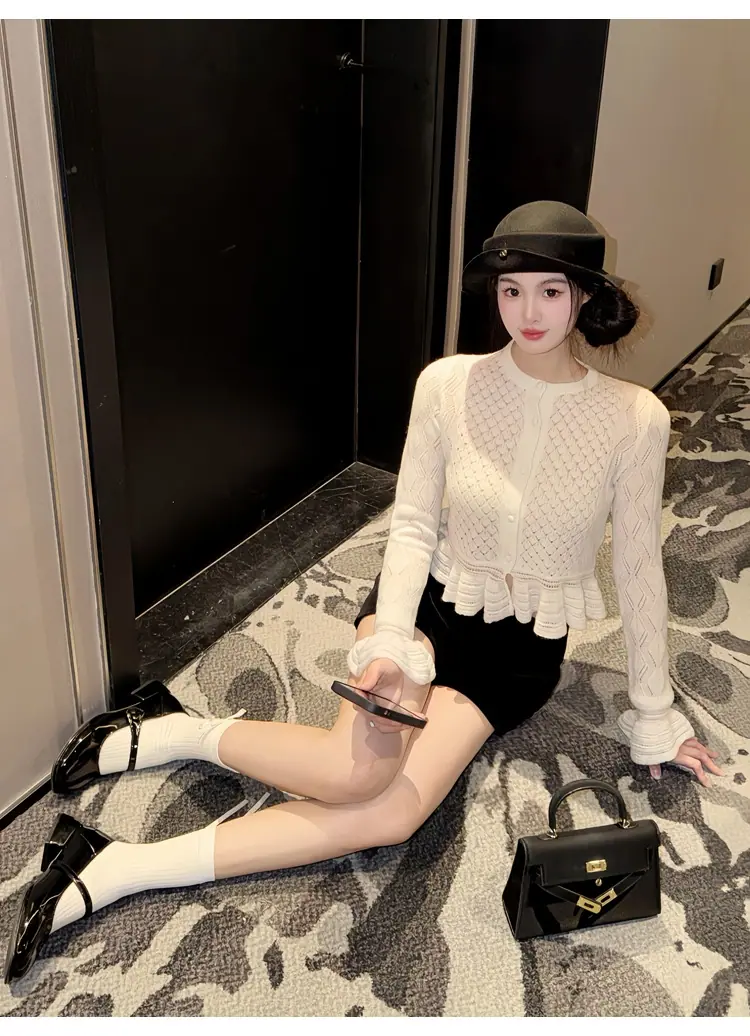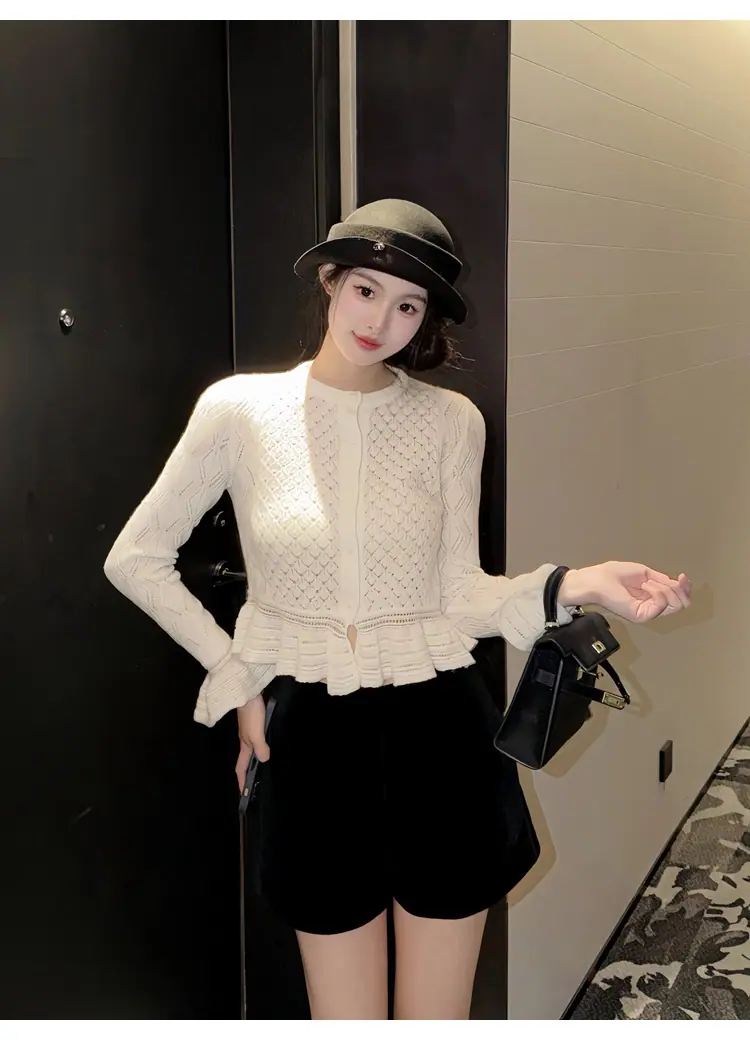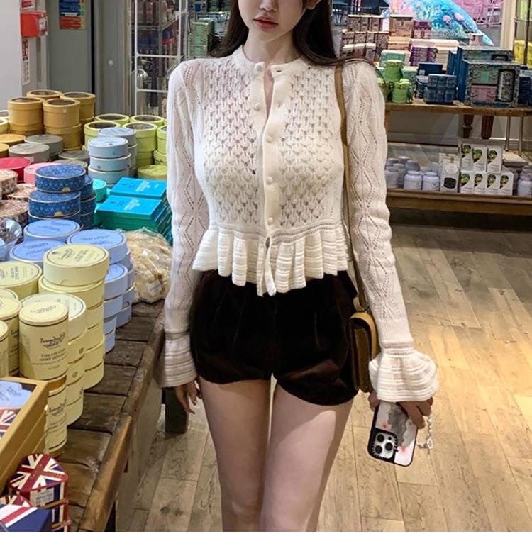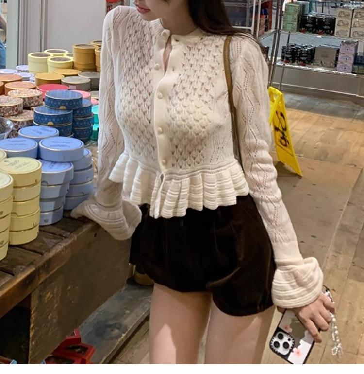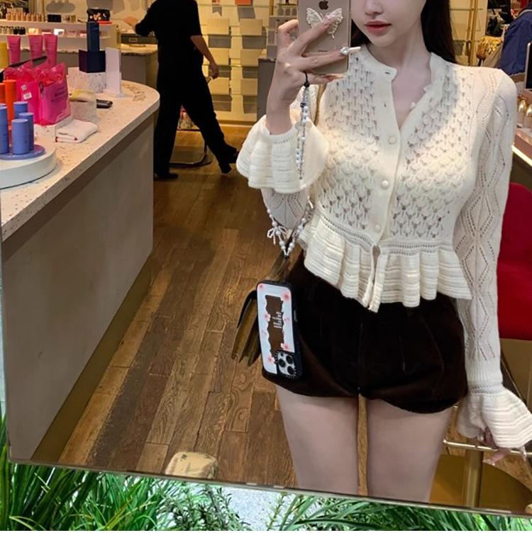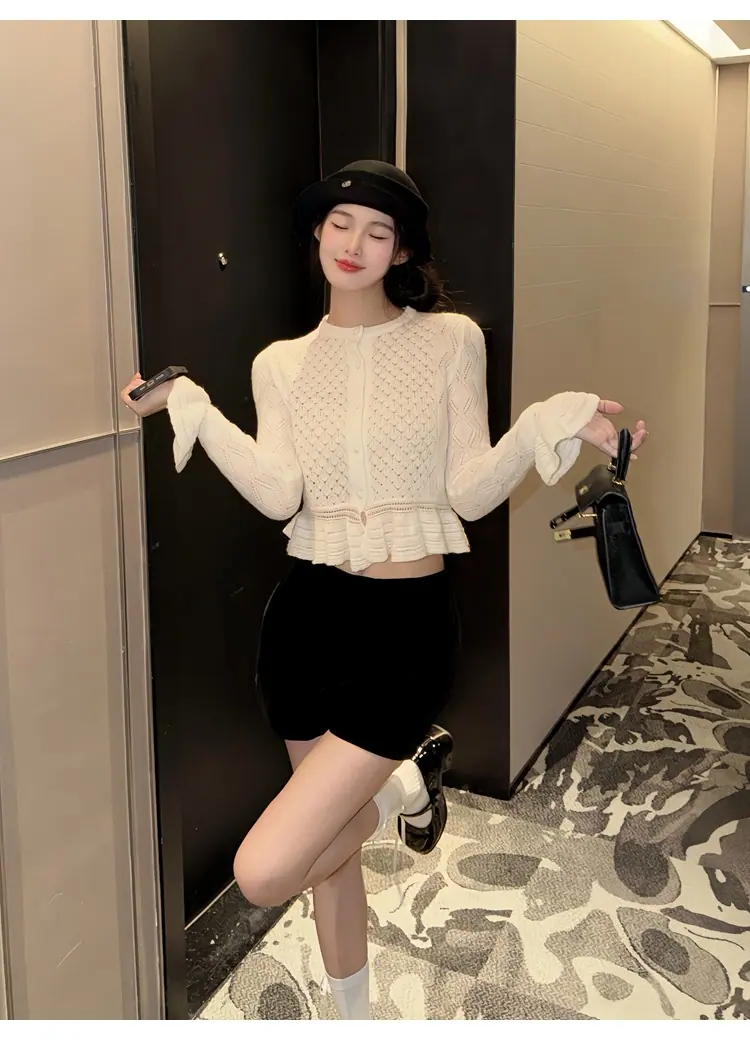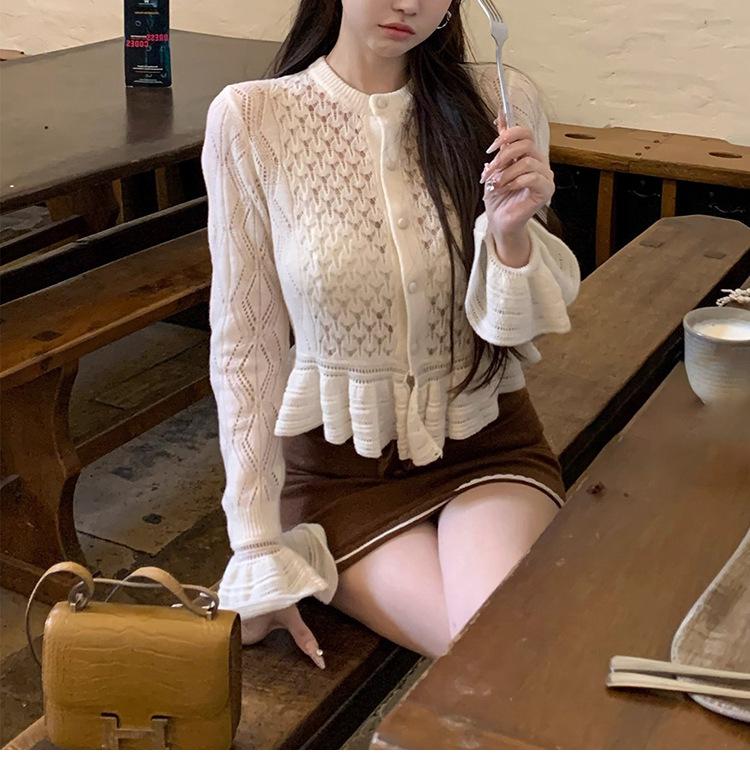 Cárdigan de punto de manga larga hueco corto con diseño de manga acampanada, súper hermoso para principios de otoño, abrigo suéter, top de otoño para mujer
