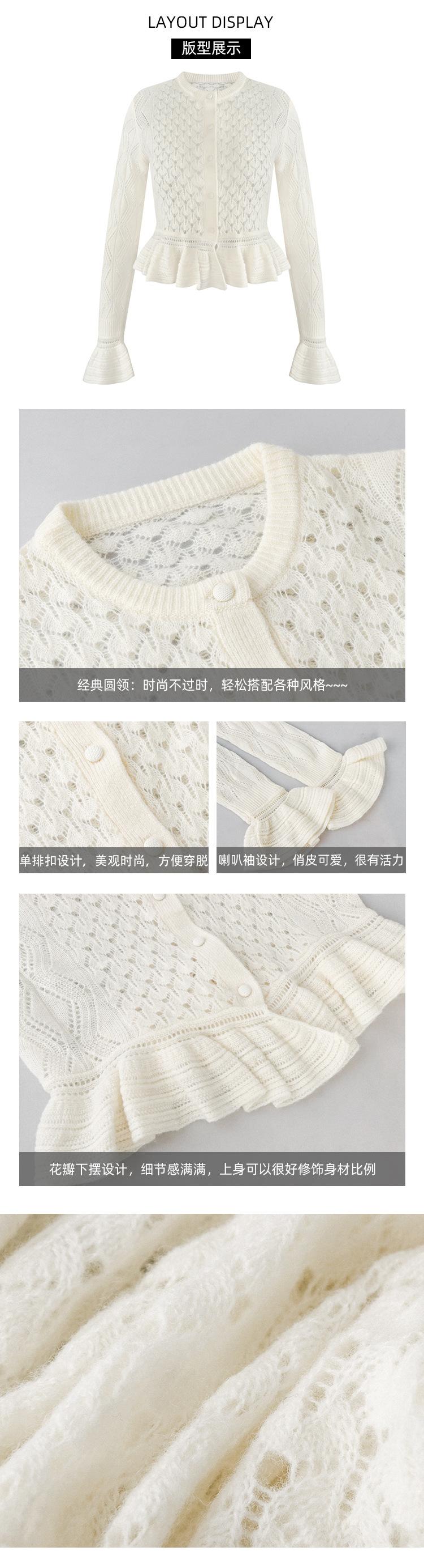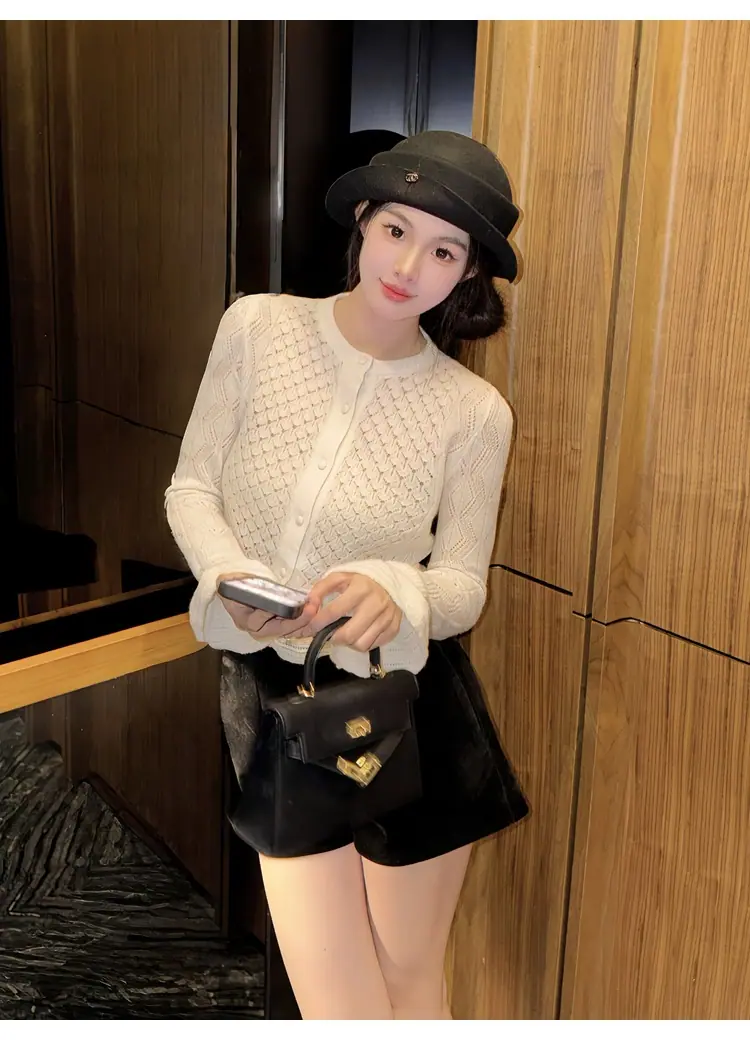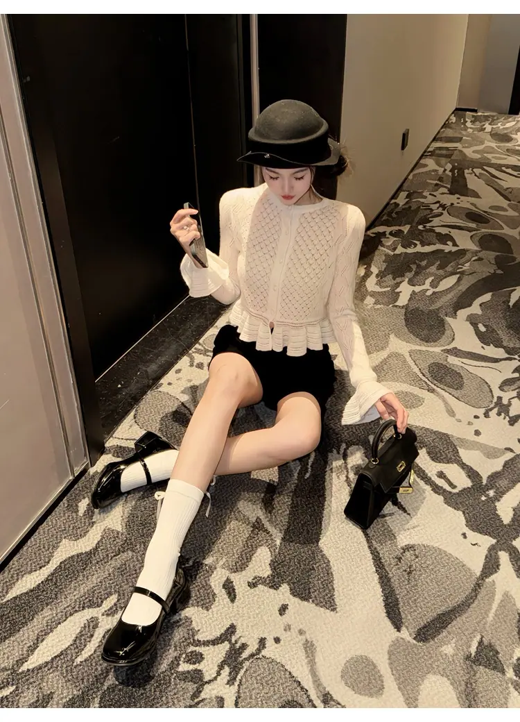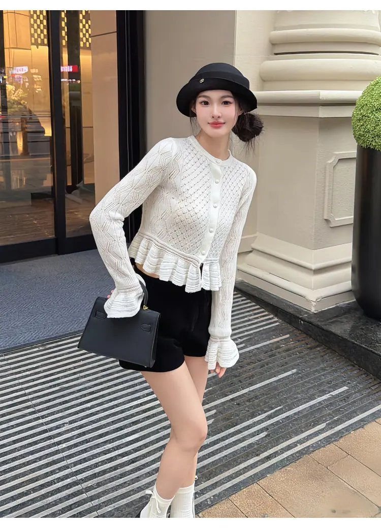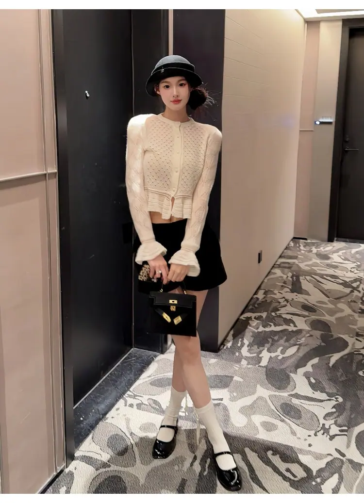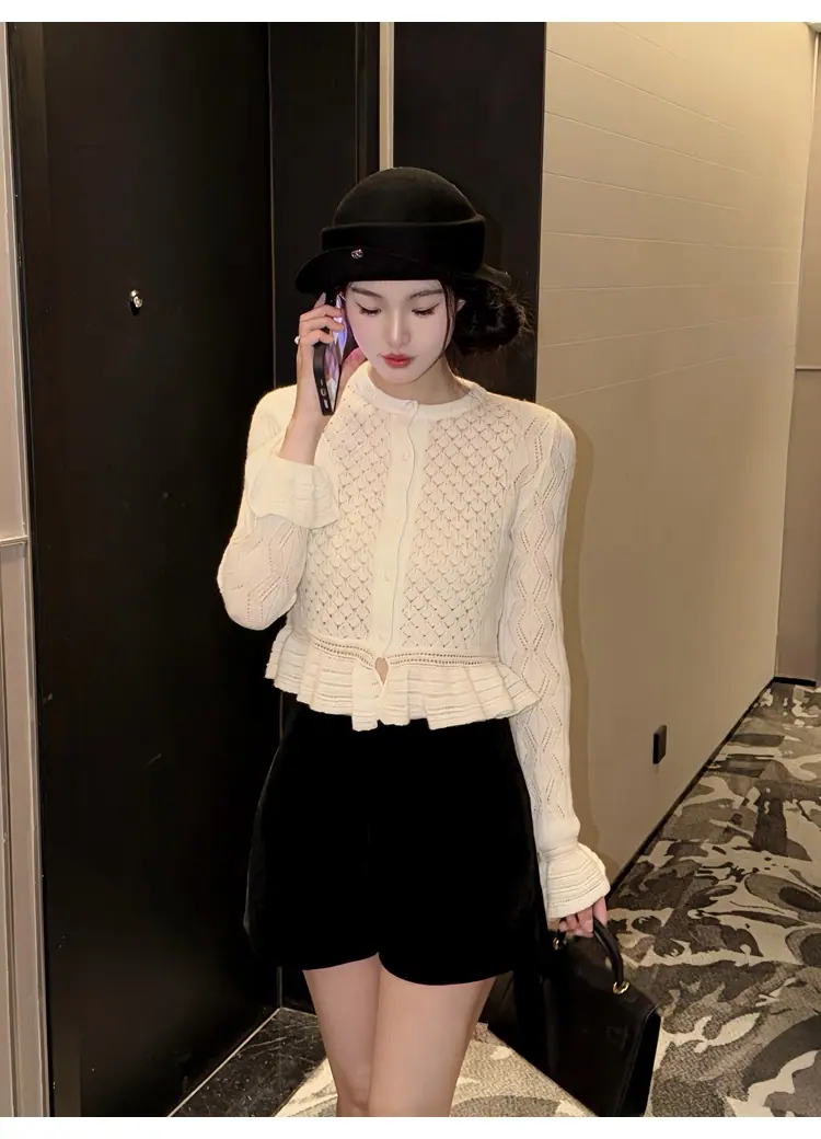 Cárdigan de punto de manga larga hueco corto con diseño de manga acampanada, súper hermoso para principios de otoño, abrigo suéter, top de otoño para mujer