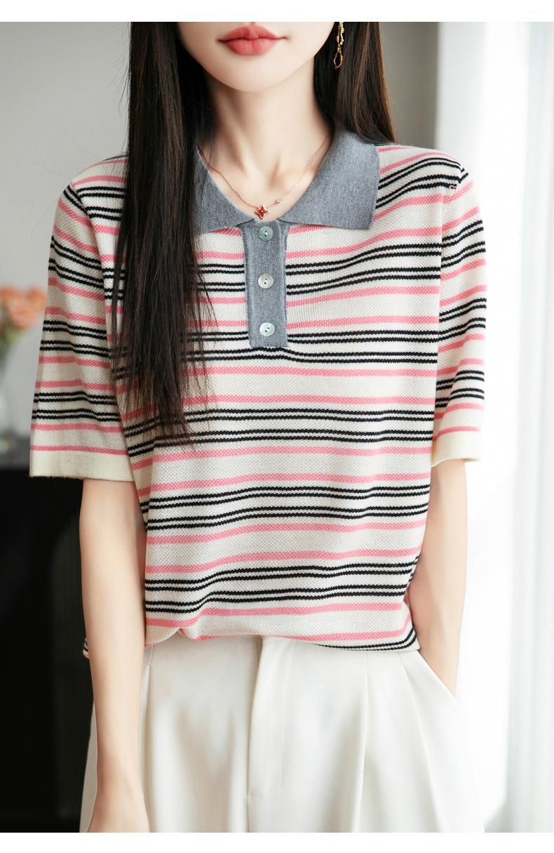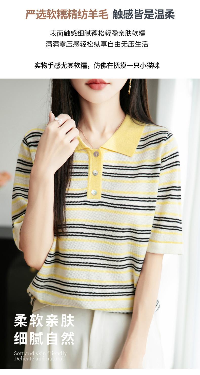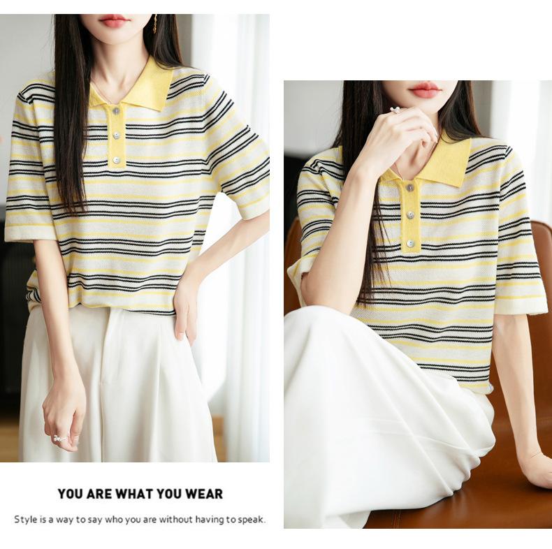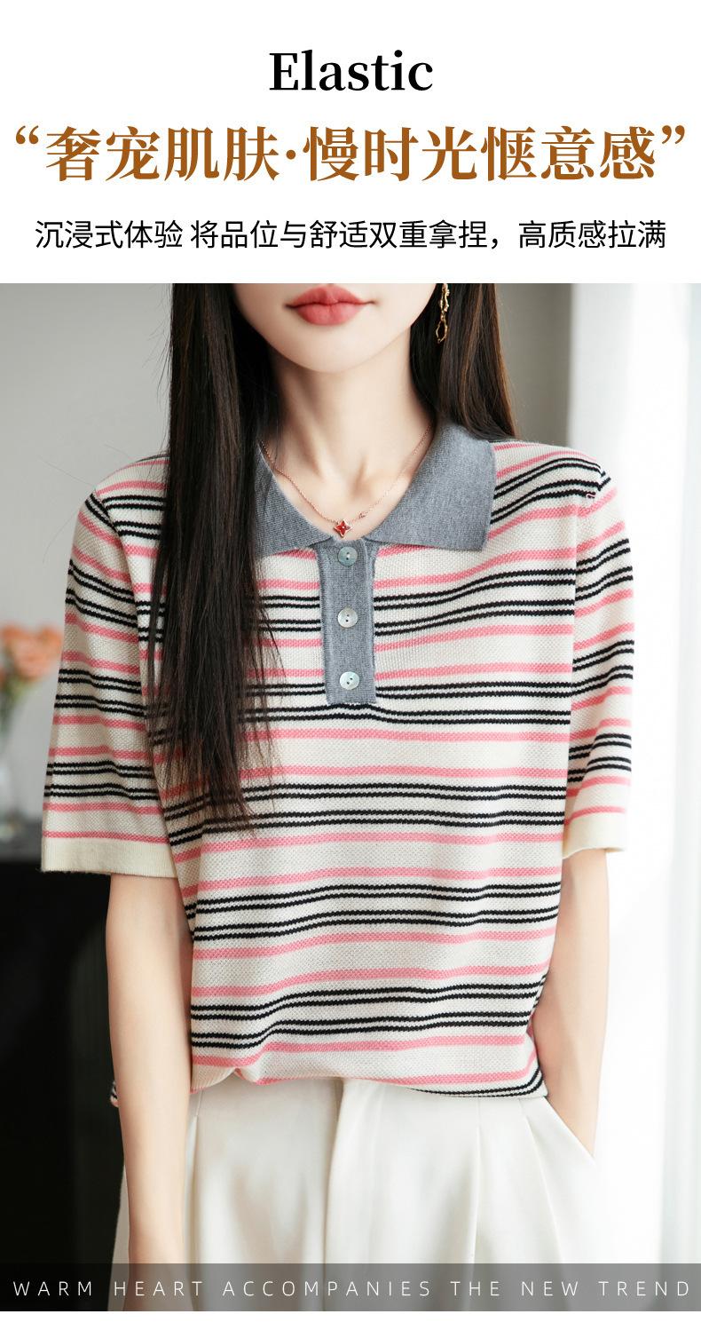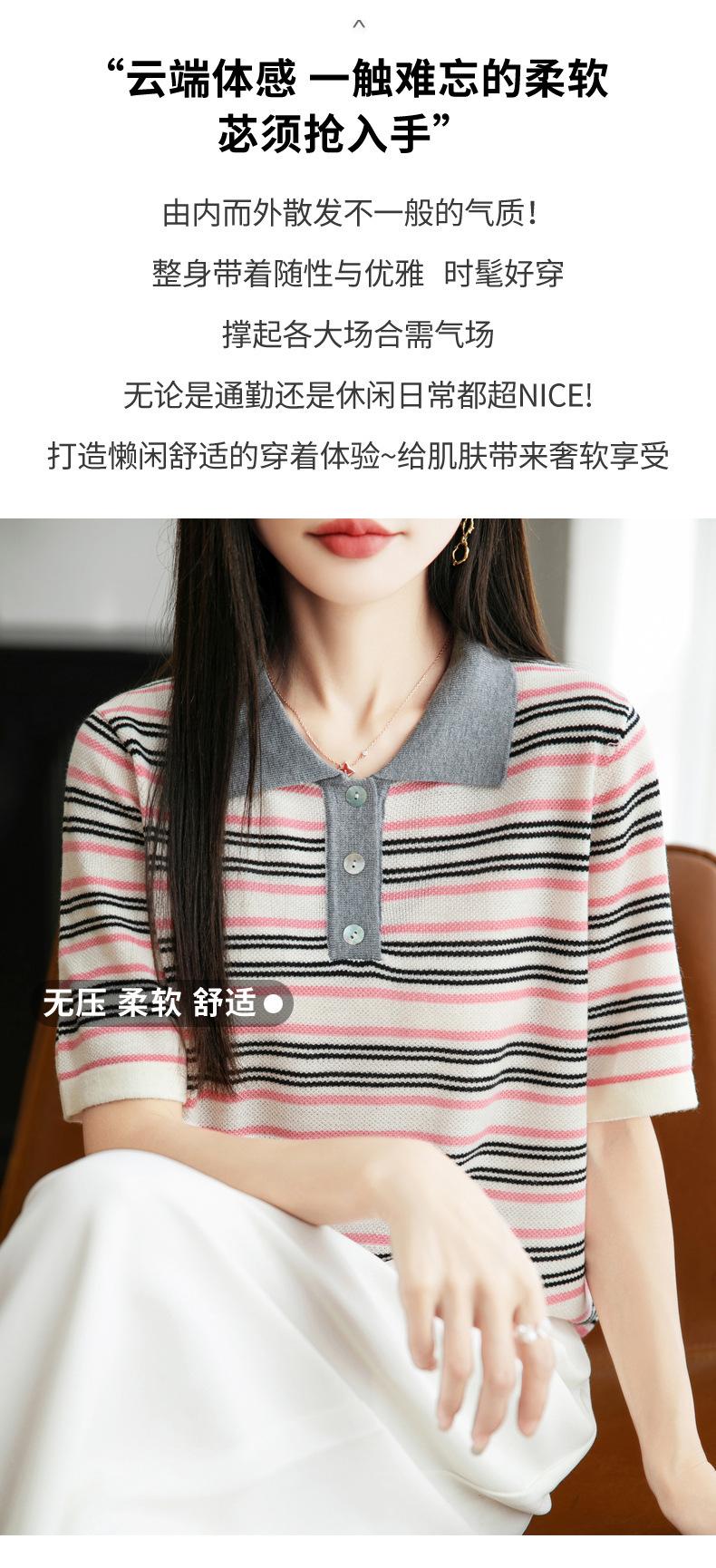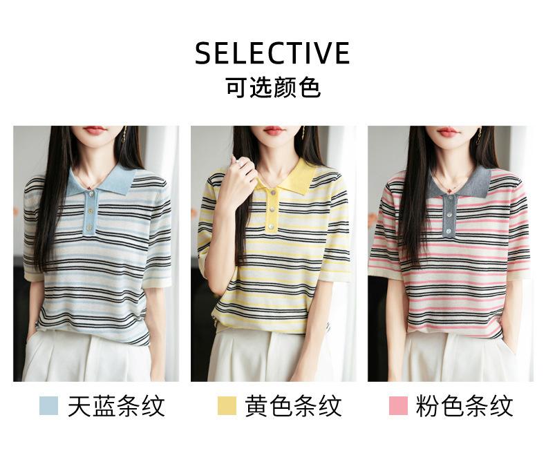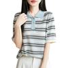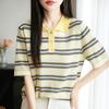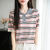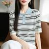 2025 Primavera y Verano Nuevo Tejido de Lana Peinada con Solapa Camiseta de Manga Corta para Mujer Rayas con Bloques de Color Holgada Camiseta Básica