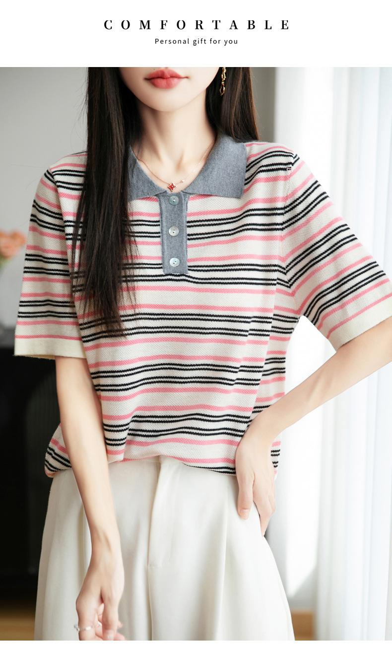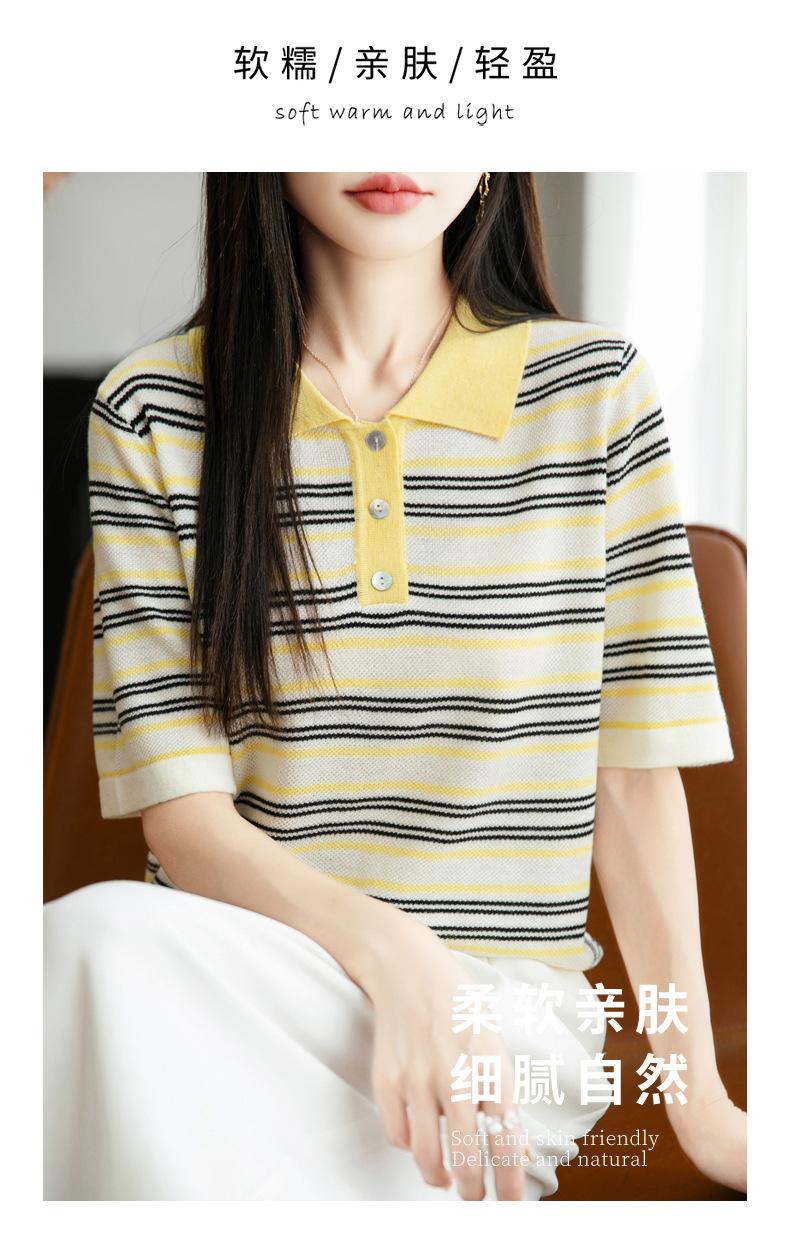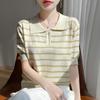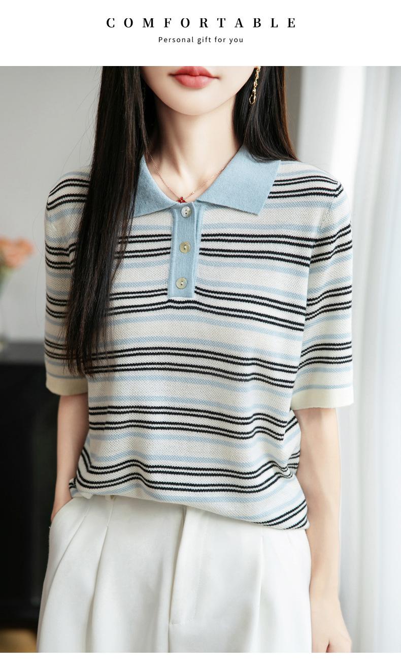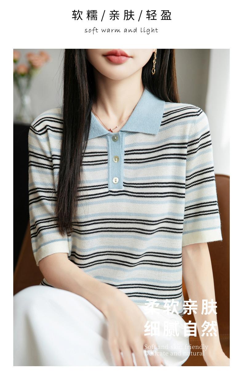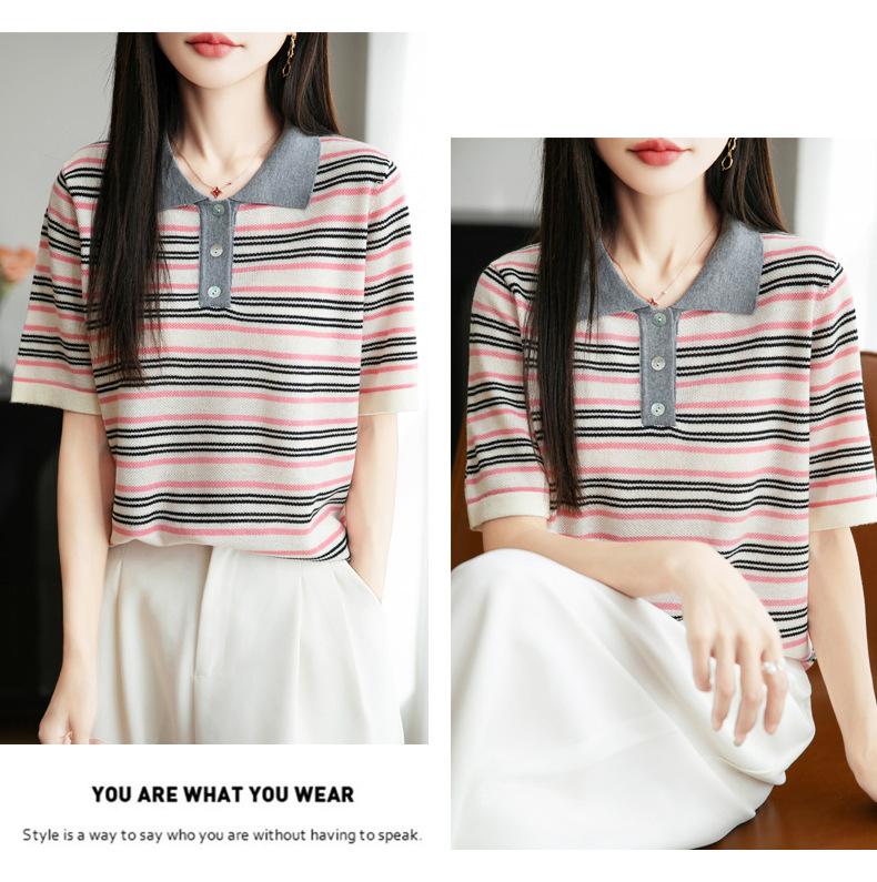 2025 Primavera y Verano Nuevo Tejido de Lana Peinada con Solapa Camiseta de Manga Corta para Mujer Rayas con Bloques de Color Holgada Camiseta Básica
