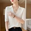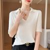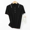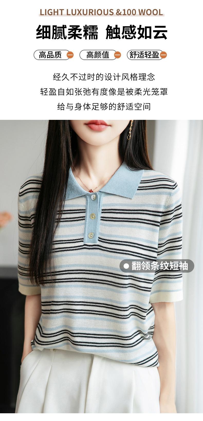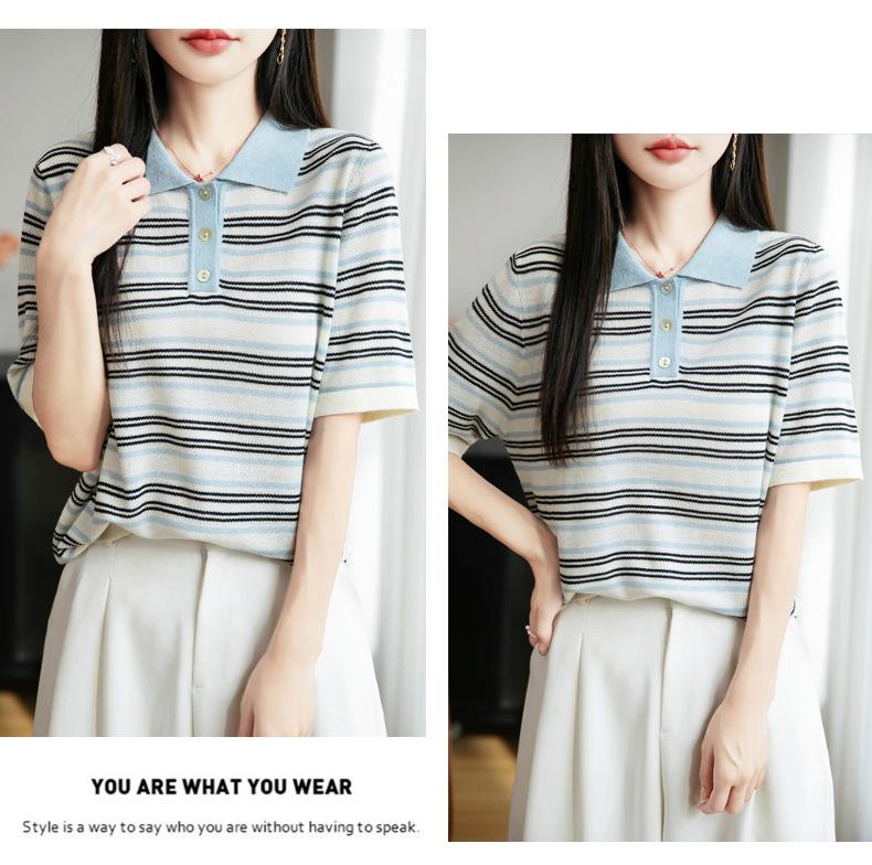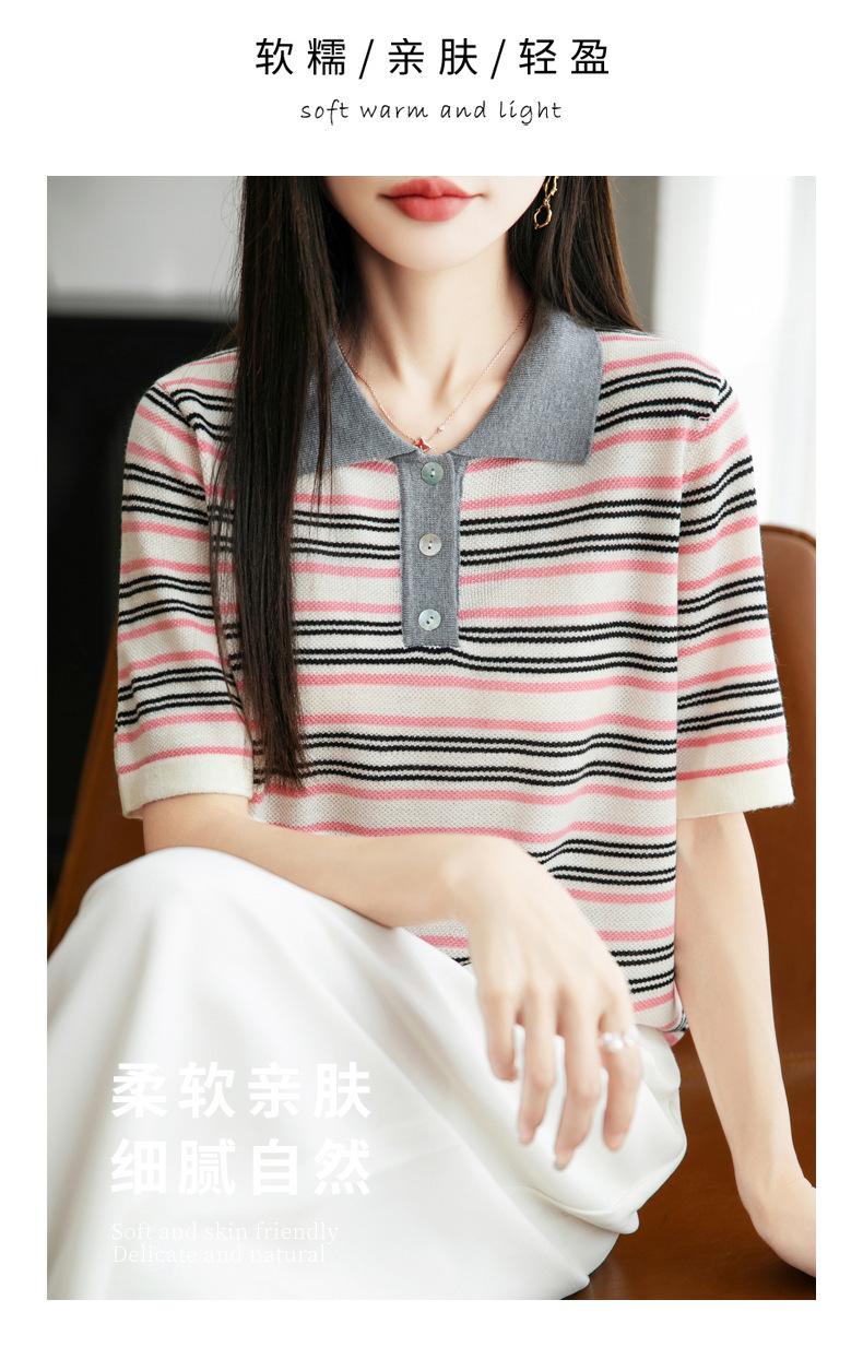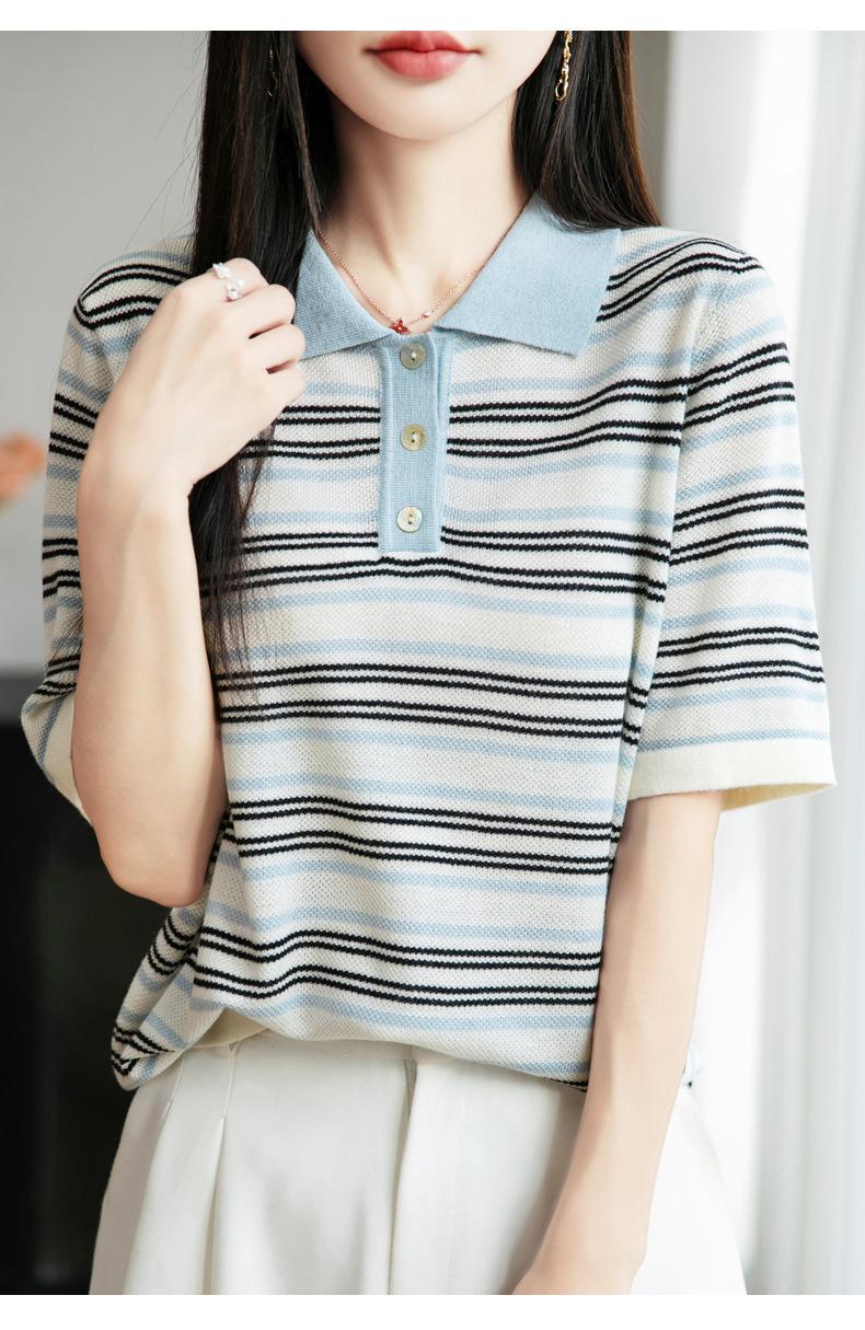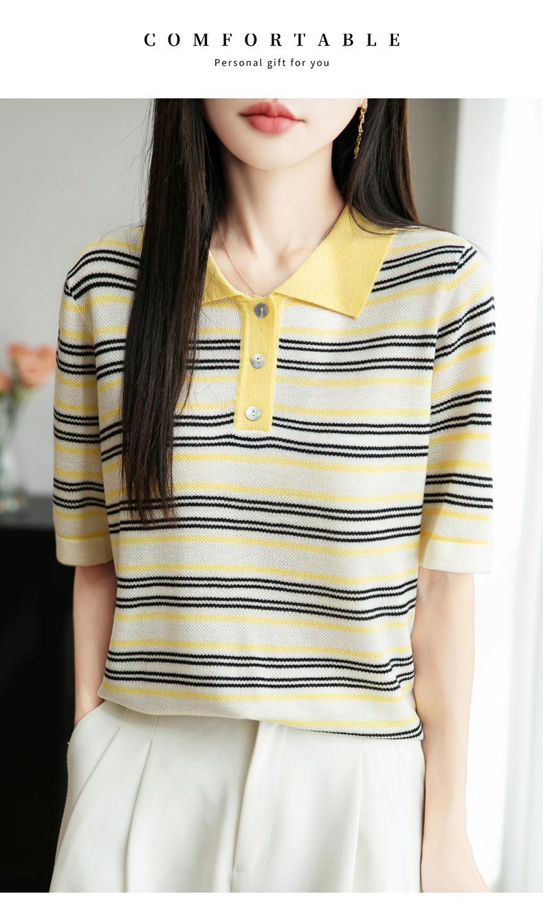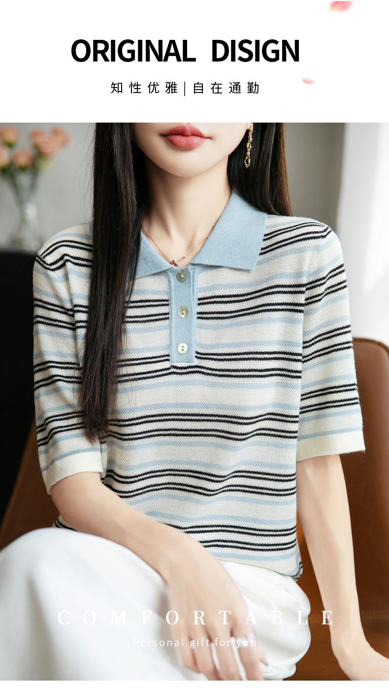 2025 Primavera y Verano Nuevo Tejido de Lana Peinada con Solapa Camiseta de Manga Corta para Mujer Rayas con Bloques de Color Holgada Camiseta Básica