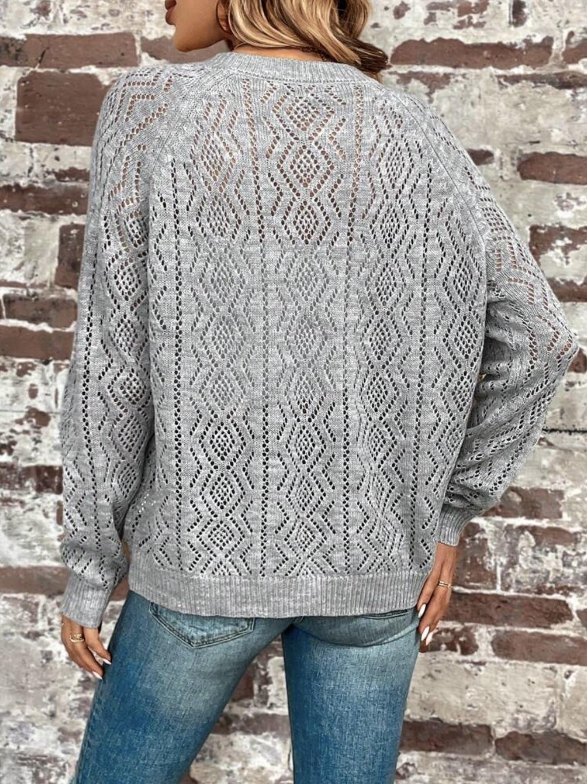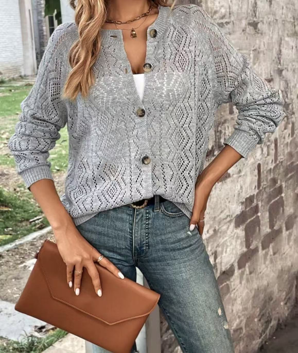 Amazon Transfronterizo Europeo y Americano Calado Temperamento Casual Suéter de Punto para Mujer Color Sólido Cuello Redondo Manga Larga Cárdigan de Punto