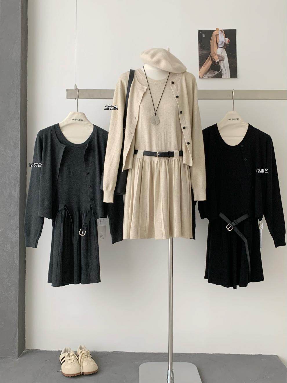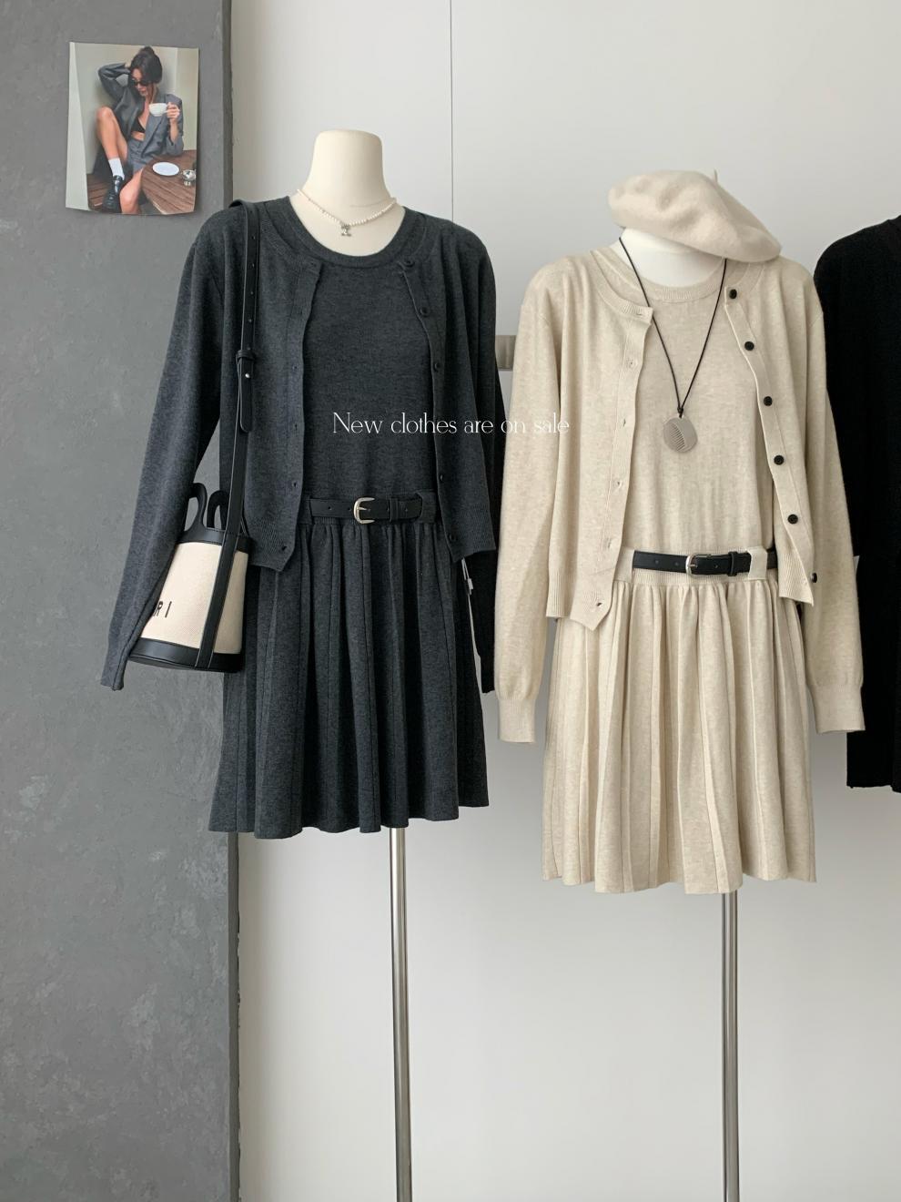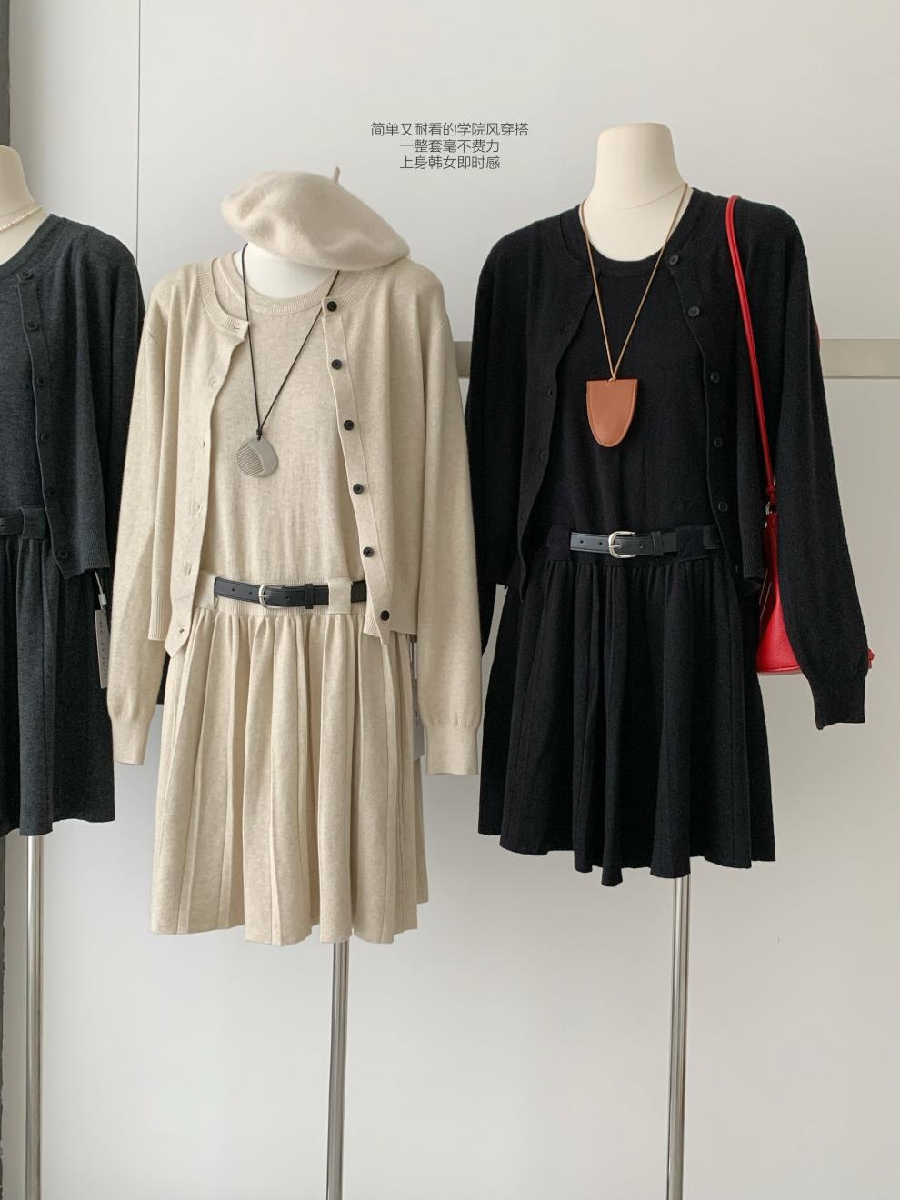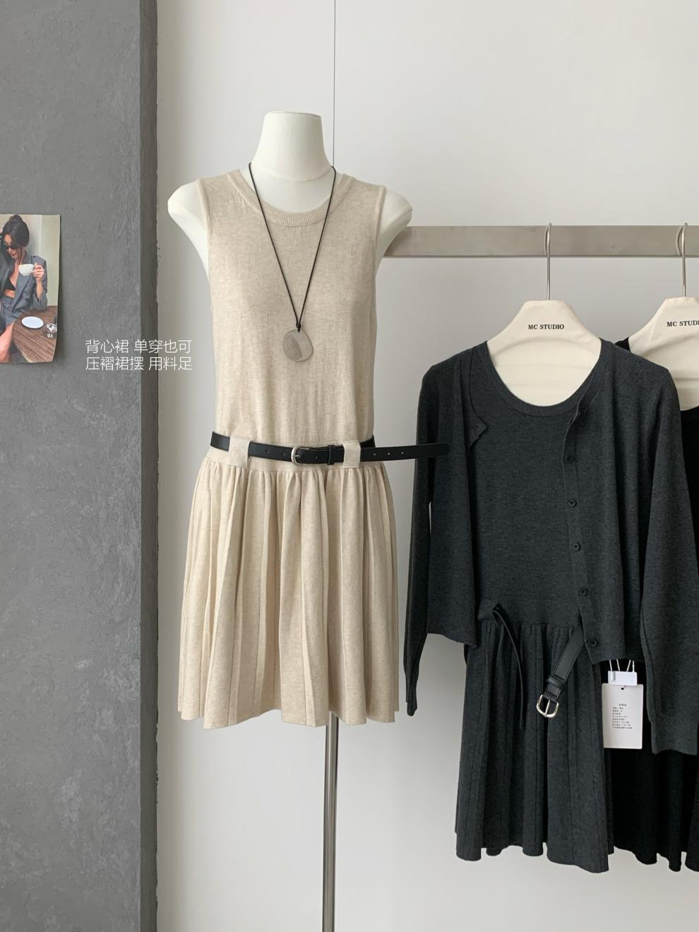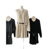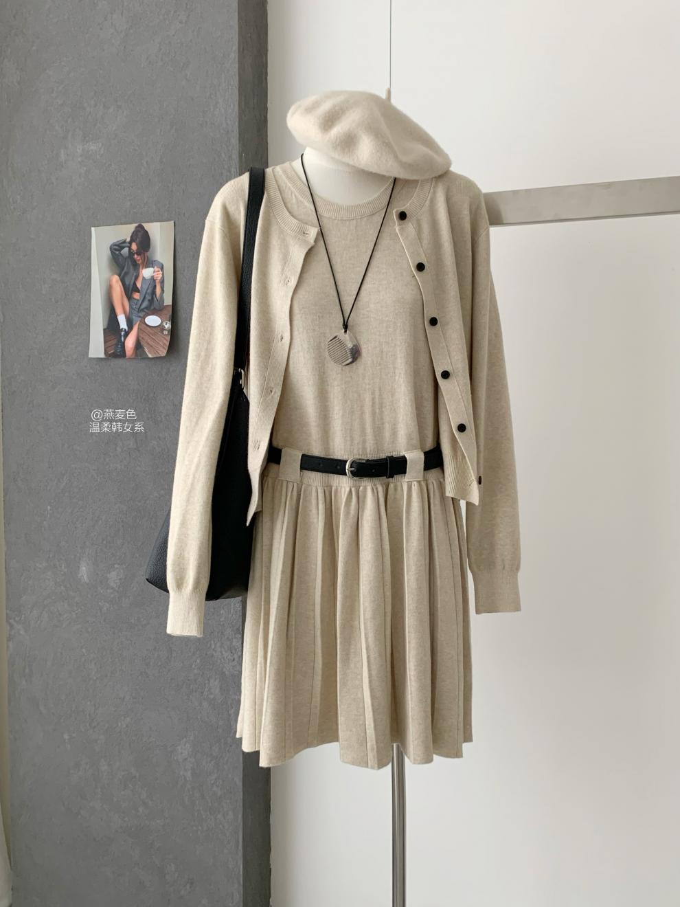 Suéter cárdigan de estilo coreano holgado, suave y versátil con cuello redondo + vestido chaleco plisado con cinturón