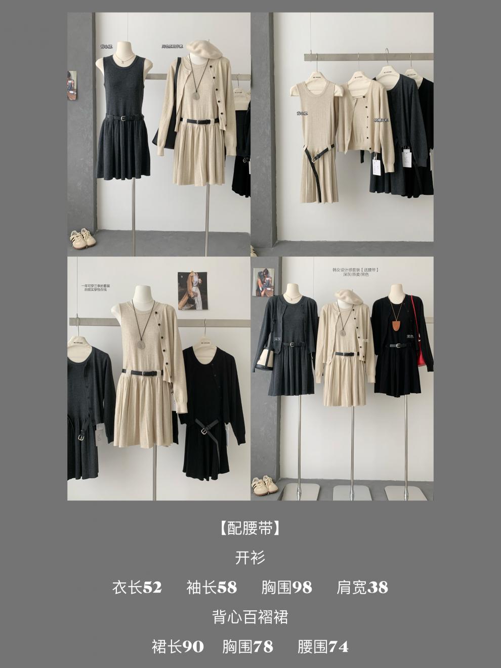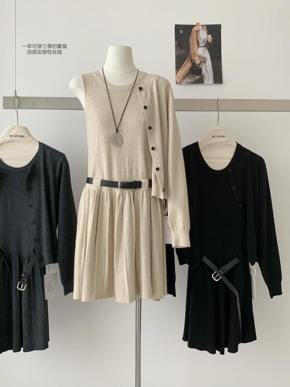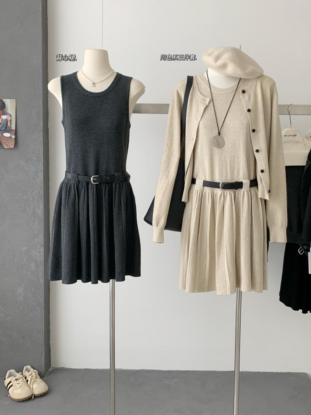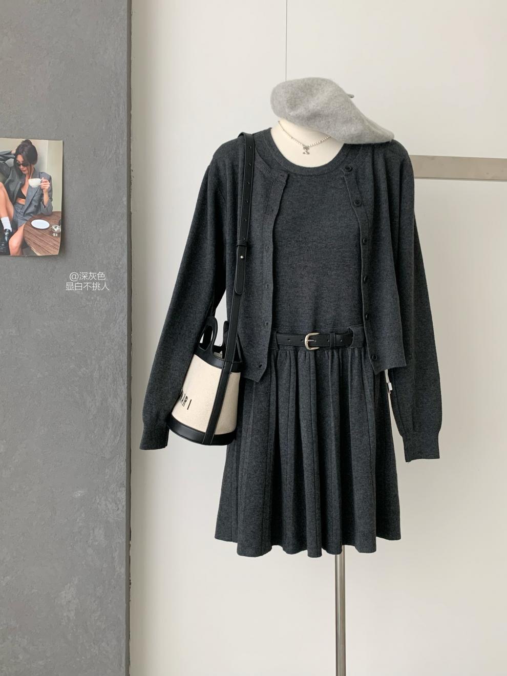 Suéter cárdigan de estilo coreano holgado, suave y versátil con cuello redondo + vestido chaleco plisado con cinturón