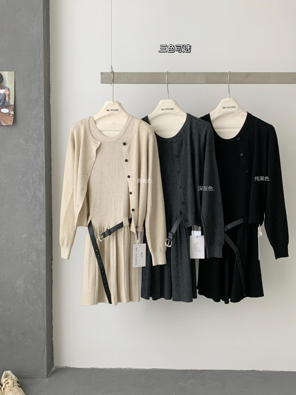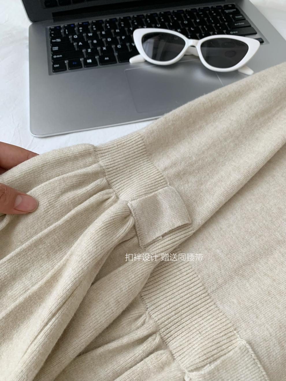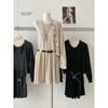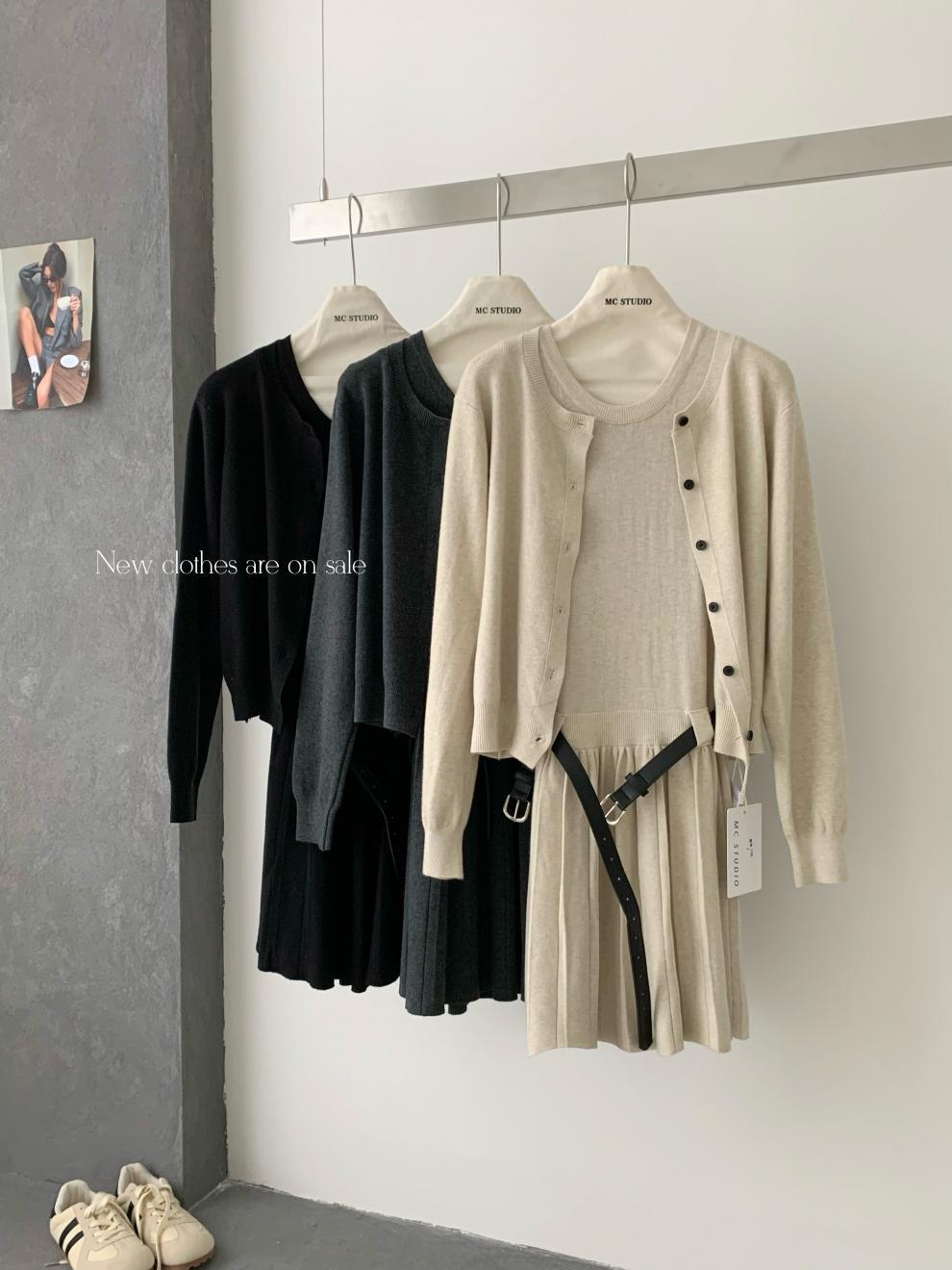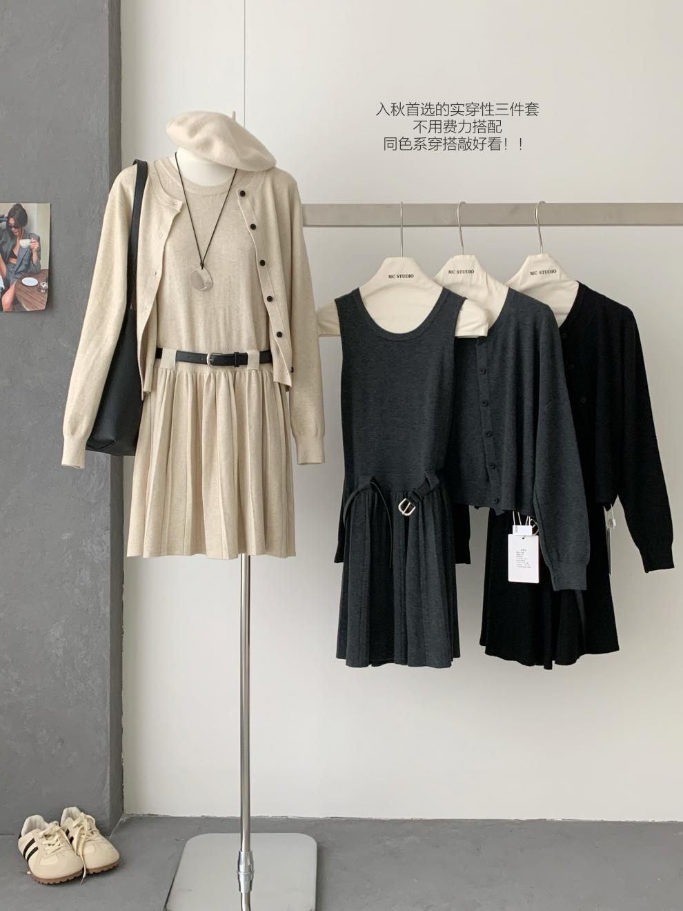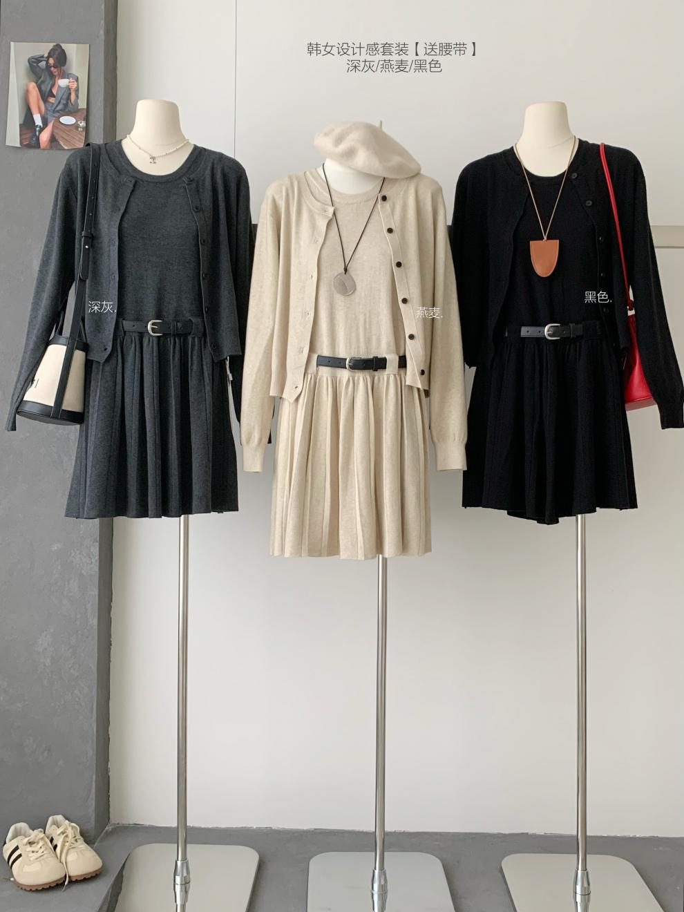 Suéter cárdigan de estilo coreano holgado, suave y versátil con cuello redondo + vestido chaleco plisado con cinturón