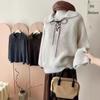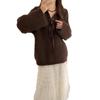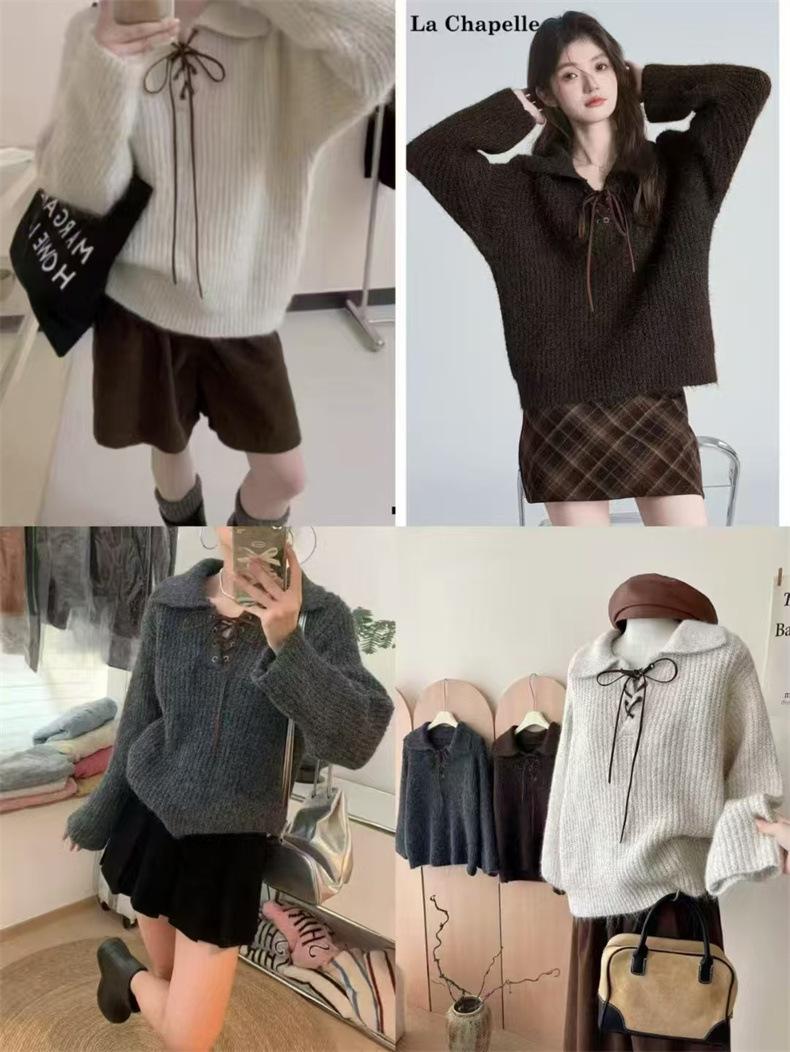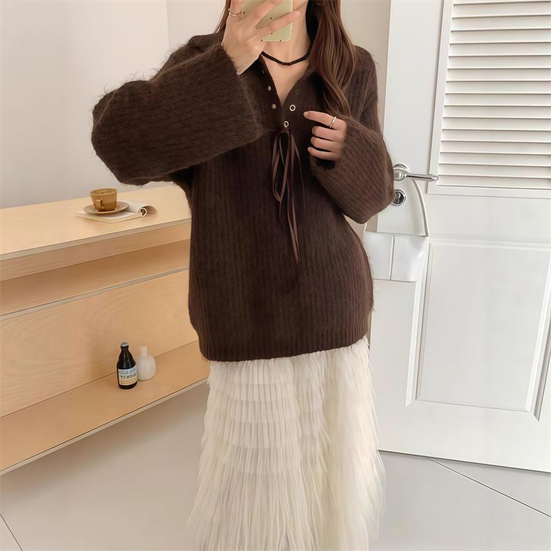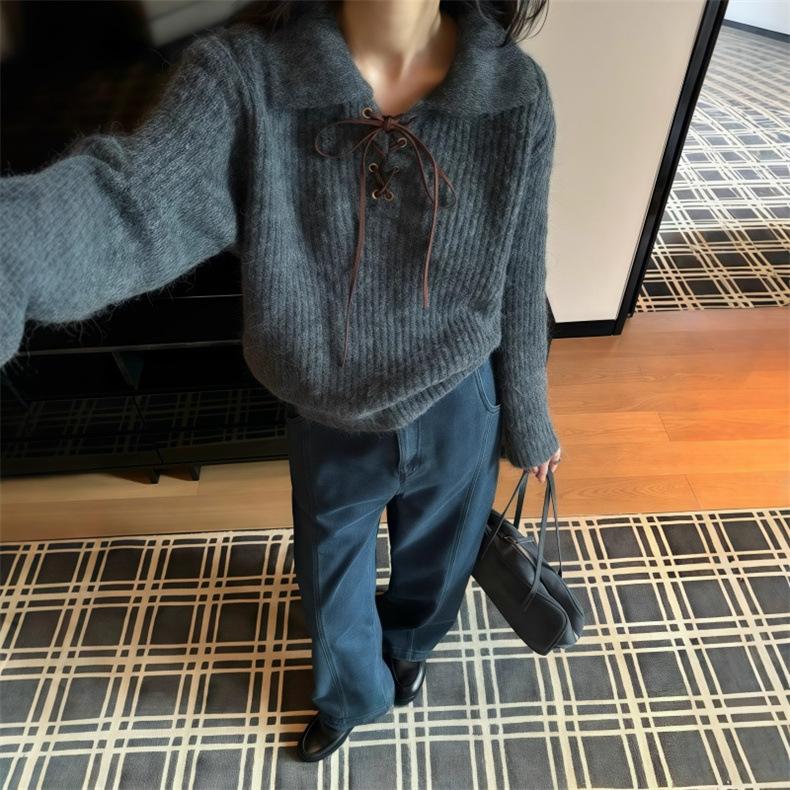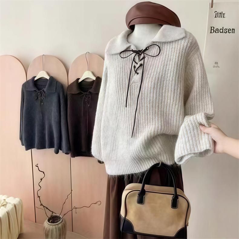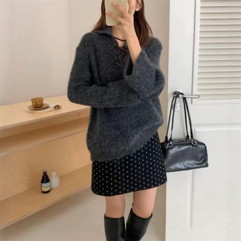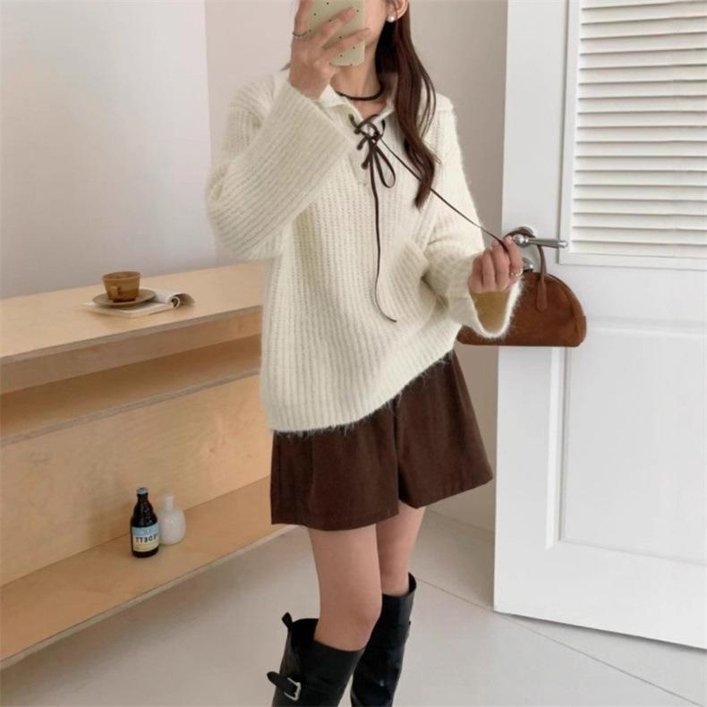 Suéter de punto de temperamento simple con solapa y cordones estilo coreano para mujer otoño e invierno nuevo holgado perezoso jersey adelgazante ropa de mujer suéter
