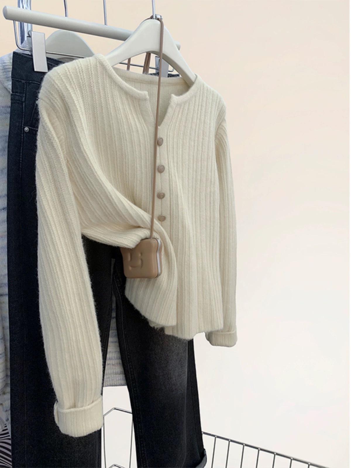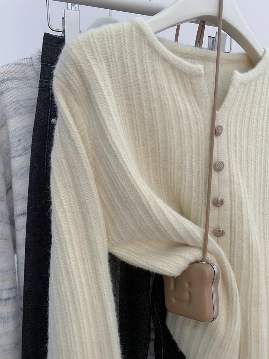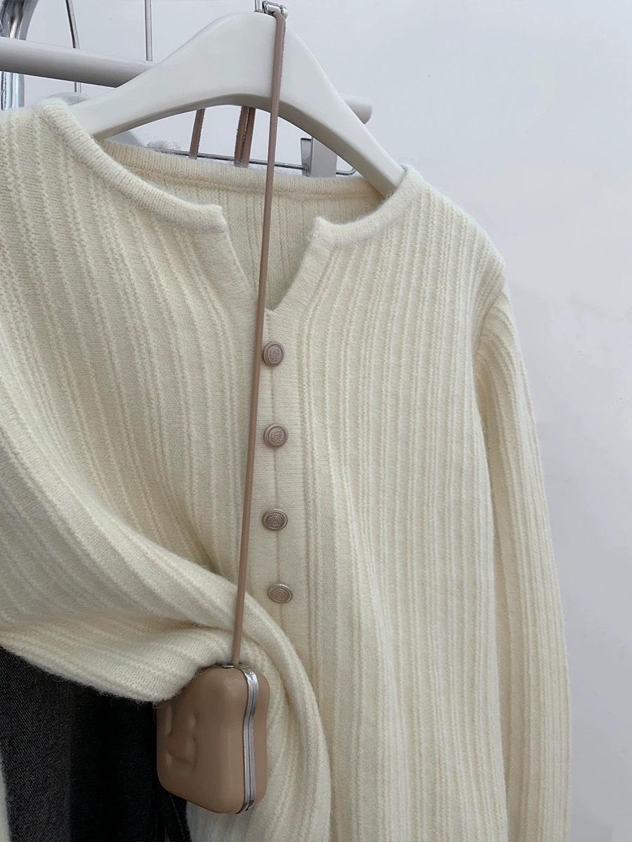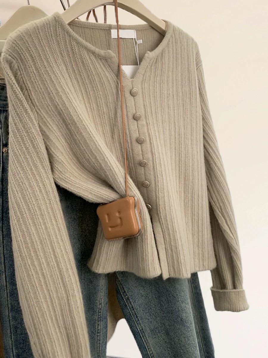 Cárdigan de Lana con Cuello en V Color Avena para Mujer Otoño 2025 Nuevo Capa Base Interior Estilo Relajado Abertura Tejido de Punto Suelto