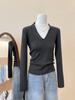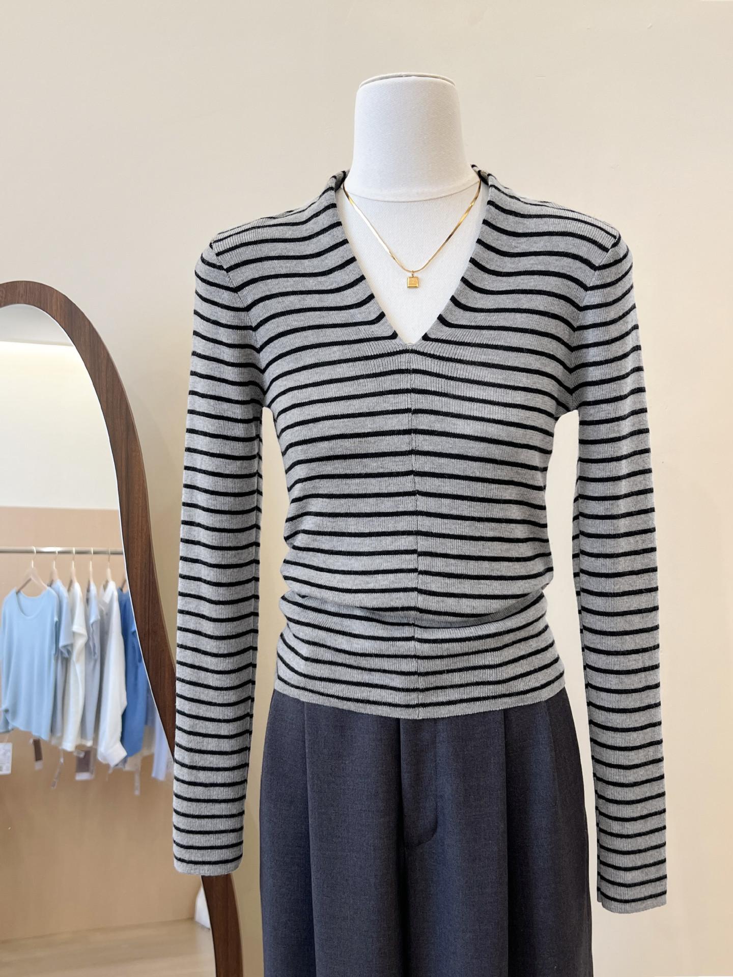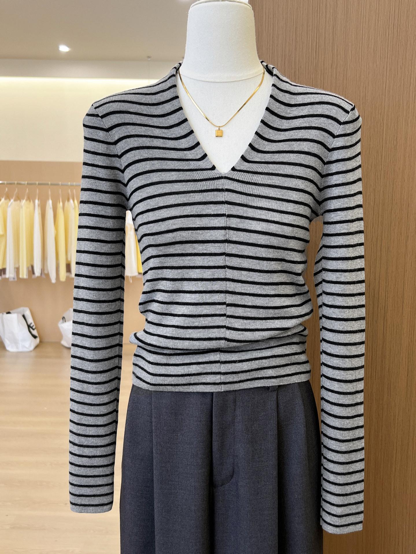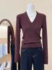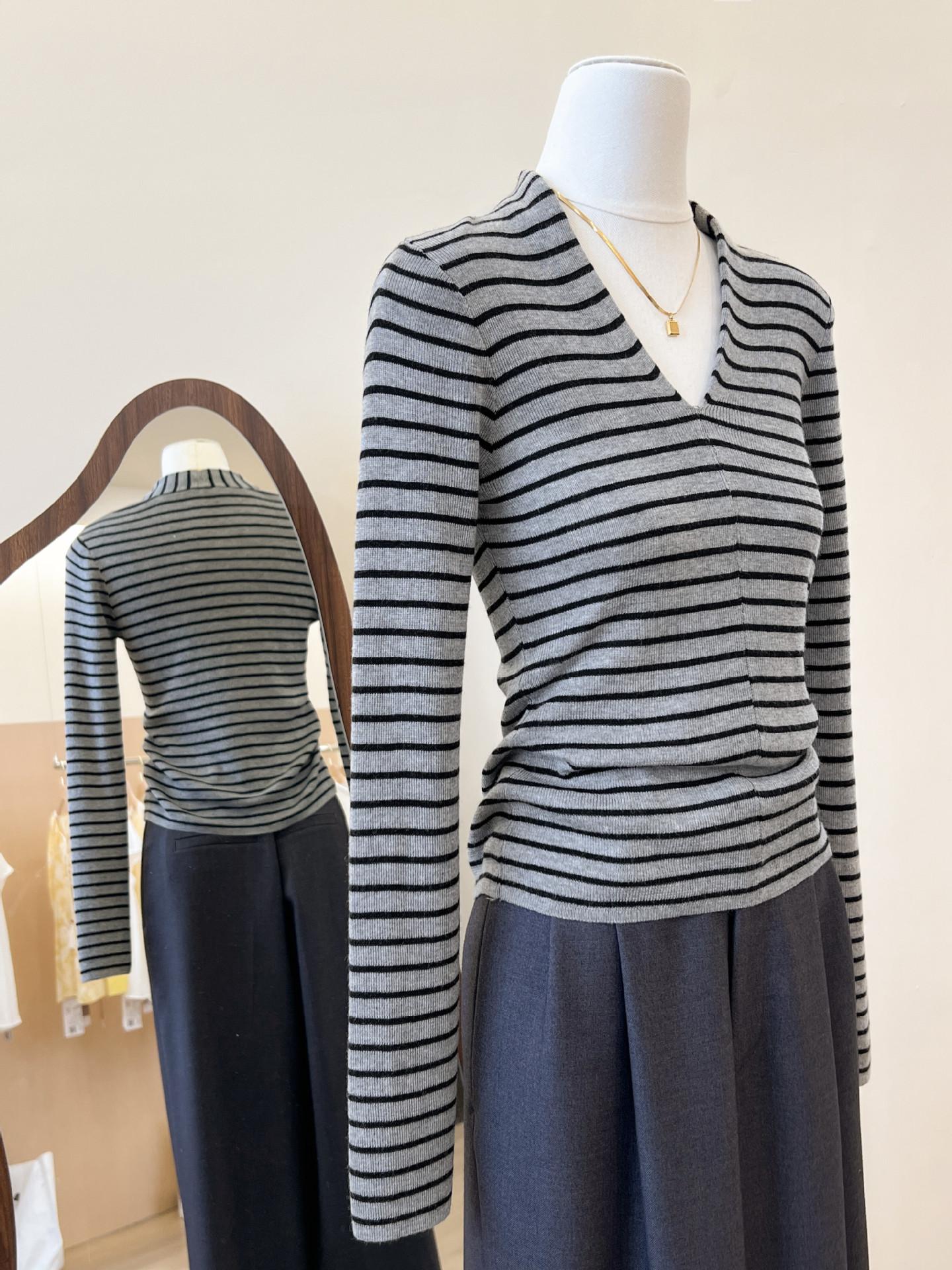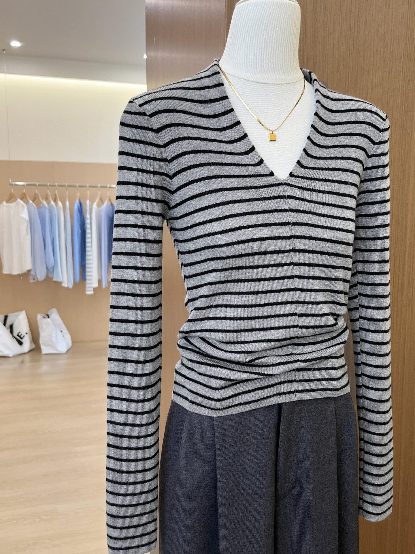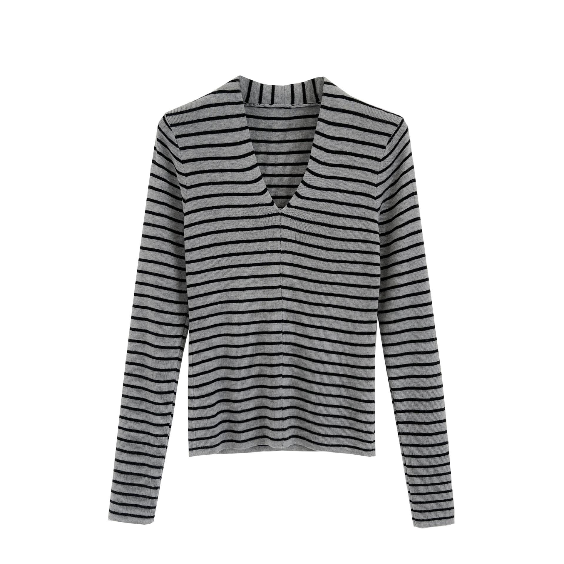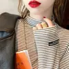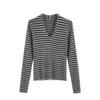 Playera de Punto de Manga Larga a Rayas con Bloque de Color para Mujer 2025 Primavera y Otoño Nueva Interior Cuello en V Adelgazante Camiseta Básica Top Marea