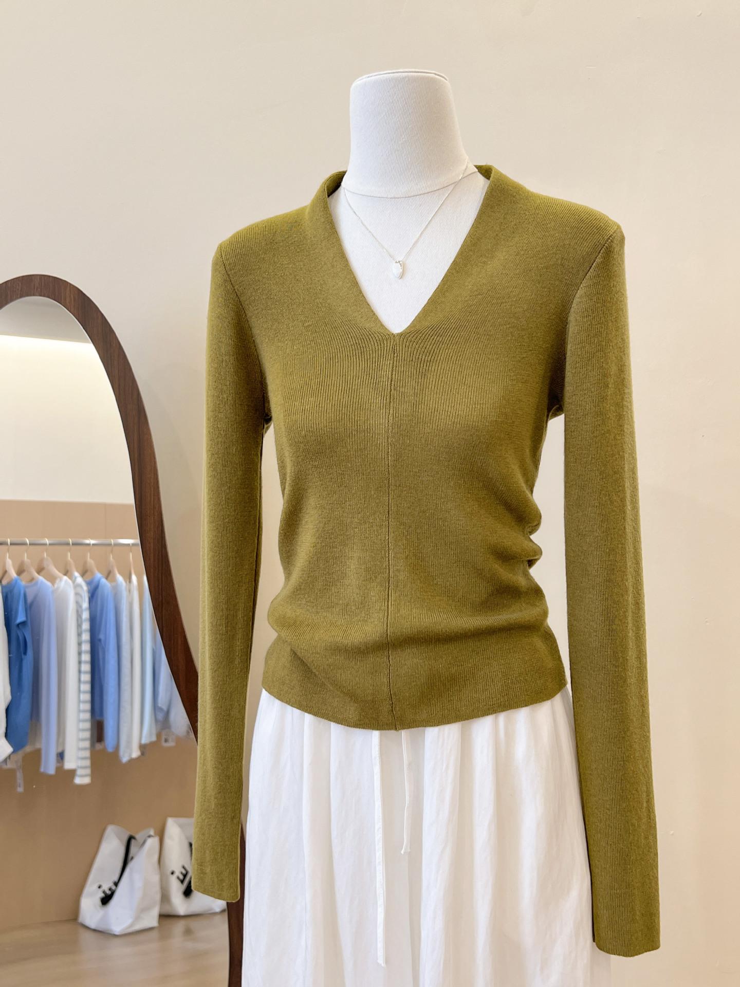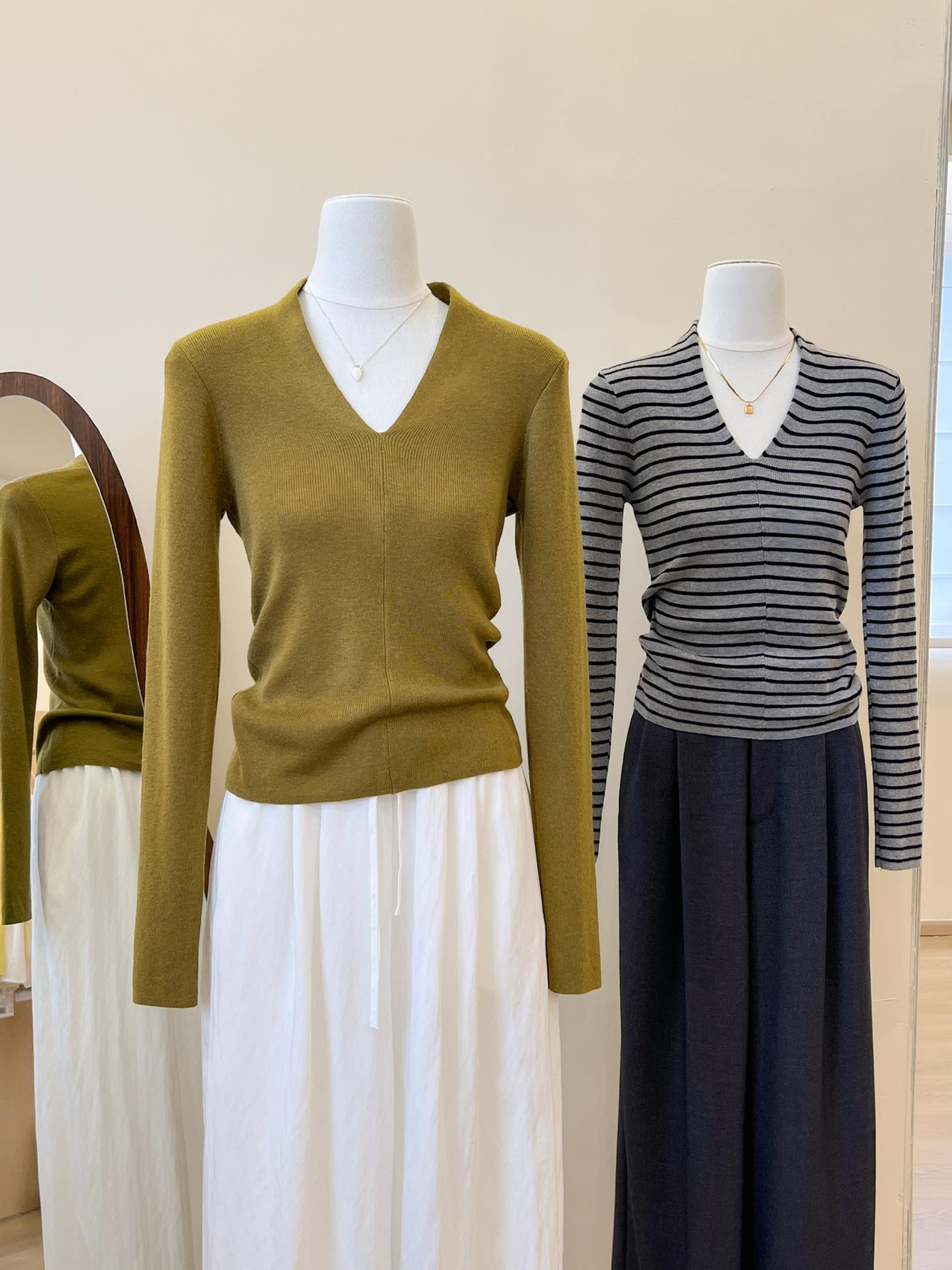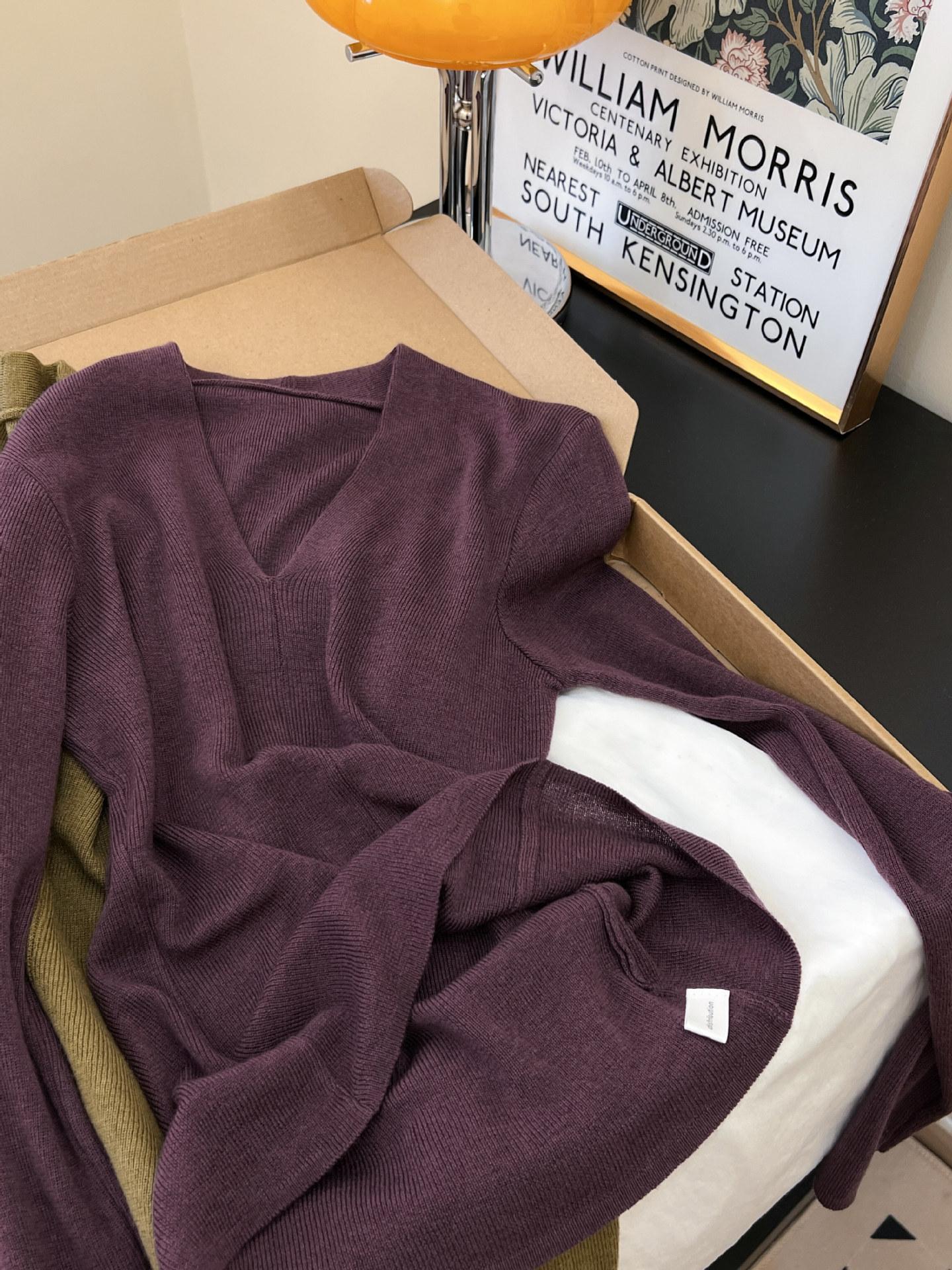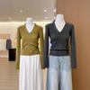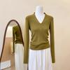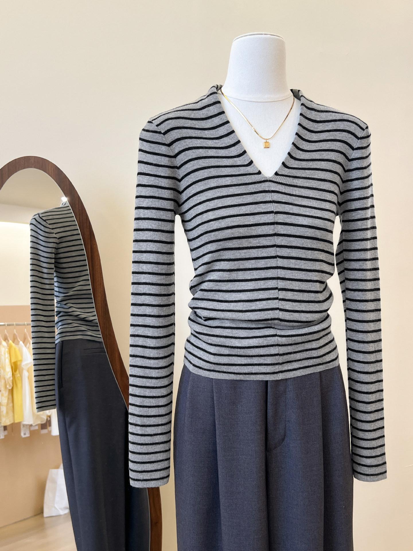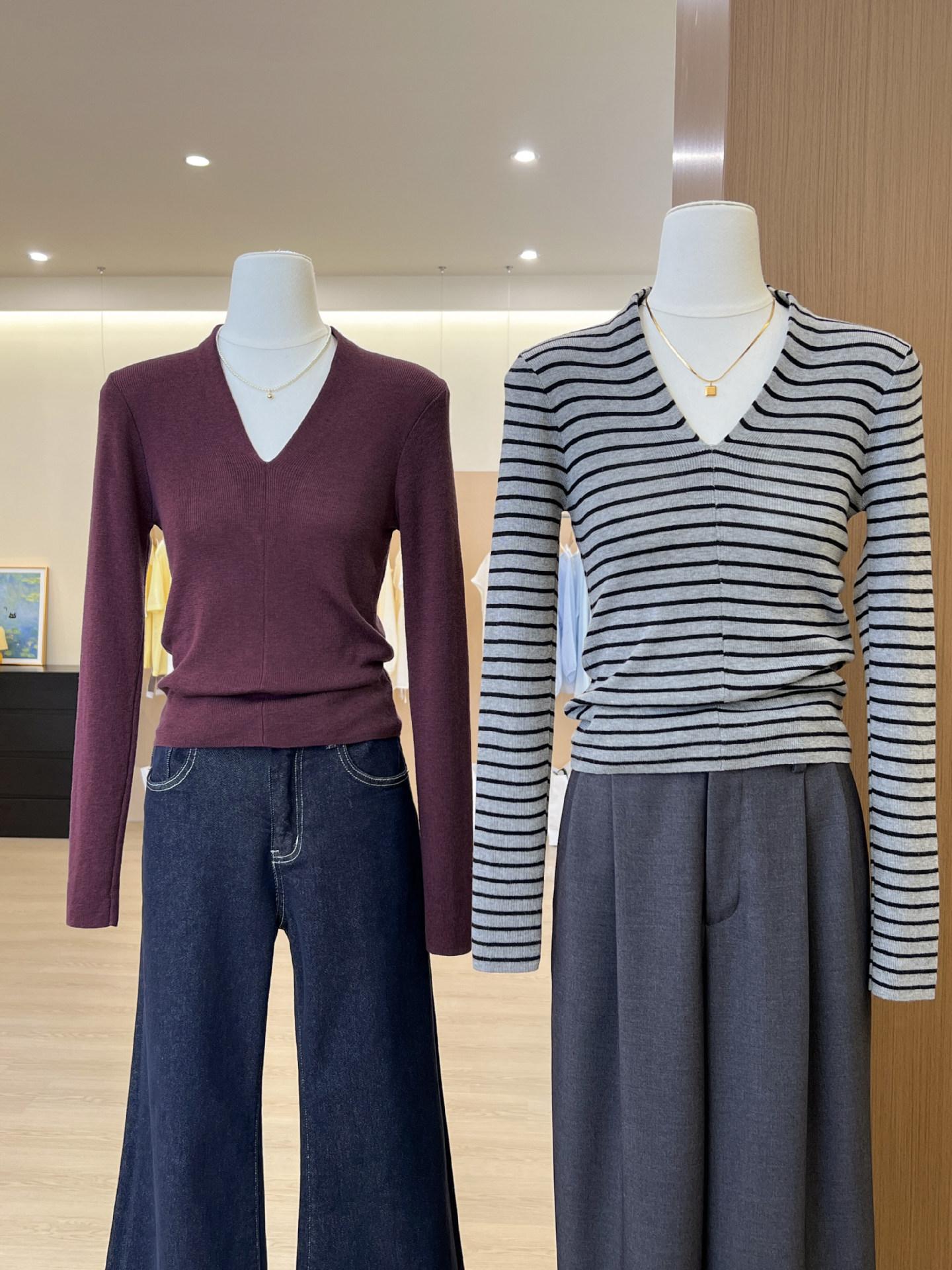 Playera de Punto de Manga Larga a Rayas con Bloque de Color para Mujer 2025 Primavera y Otoño Nueva Interior Cuello en V Adelgazante Camiseta Básica Top Marea