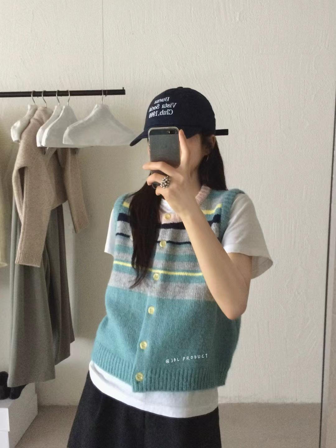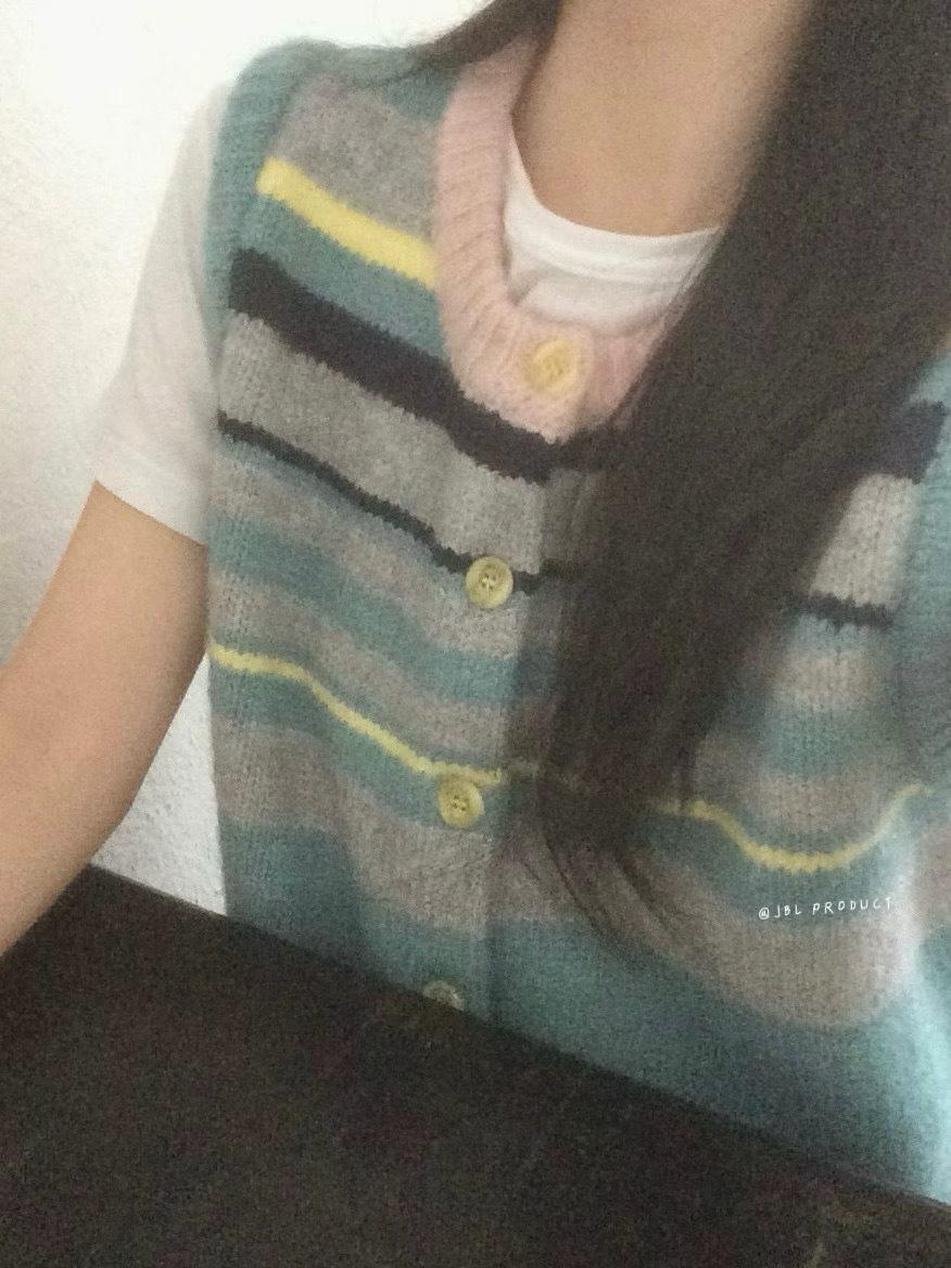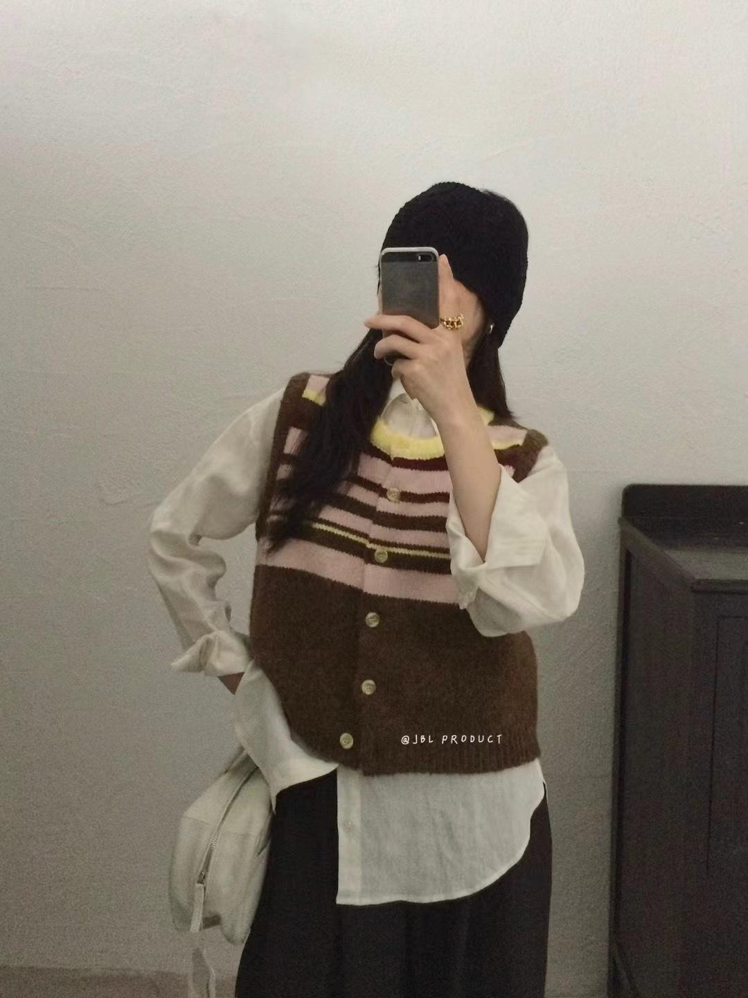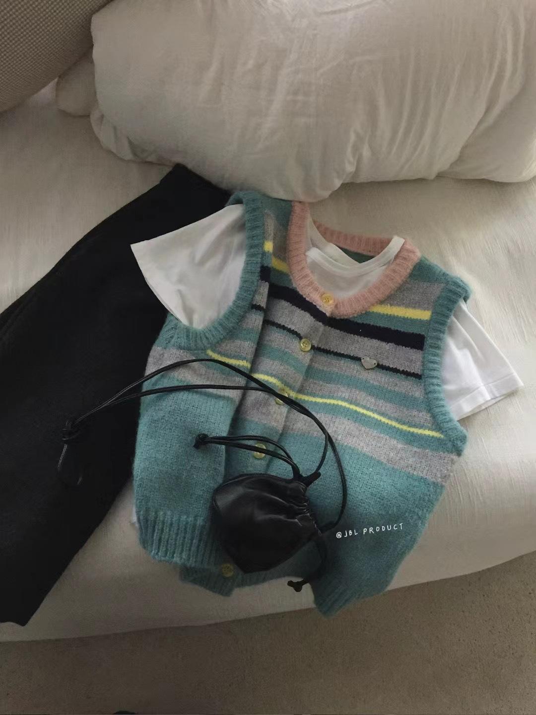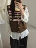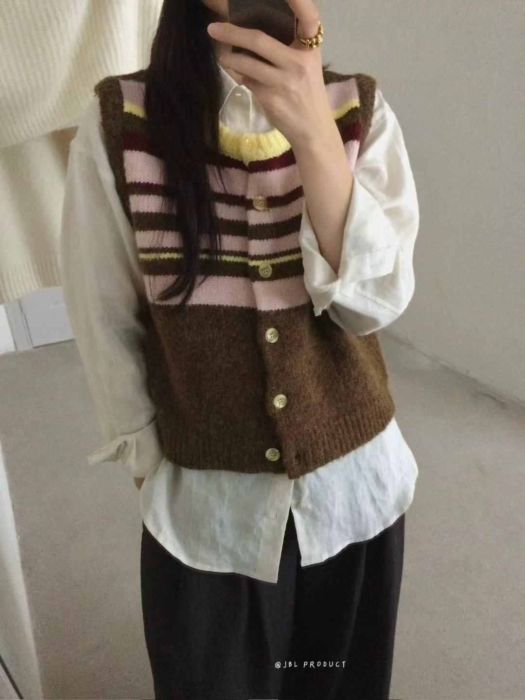 Chaleco de Punto de Cuello Redondo a Rayas Colorblock Retro Coreano para Mujer Otoño/Invierno de Alta Gama para Superponer sin Mangas